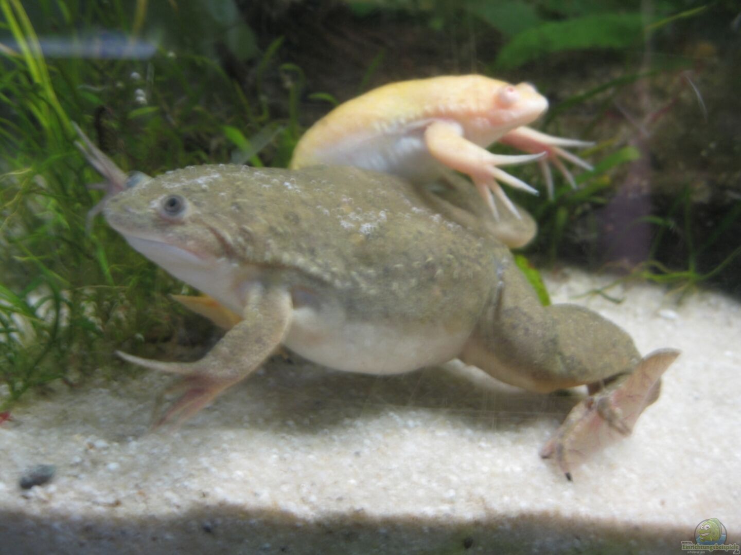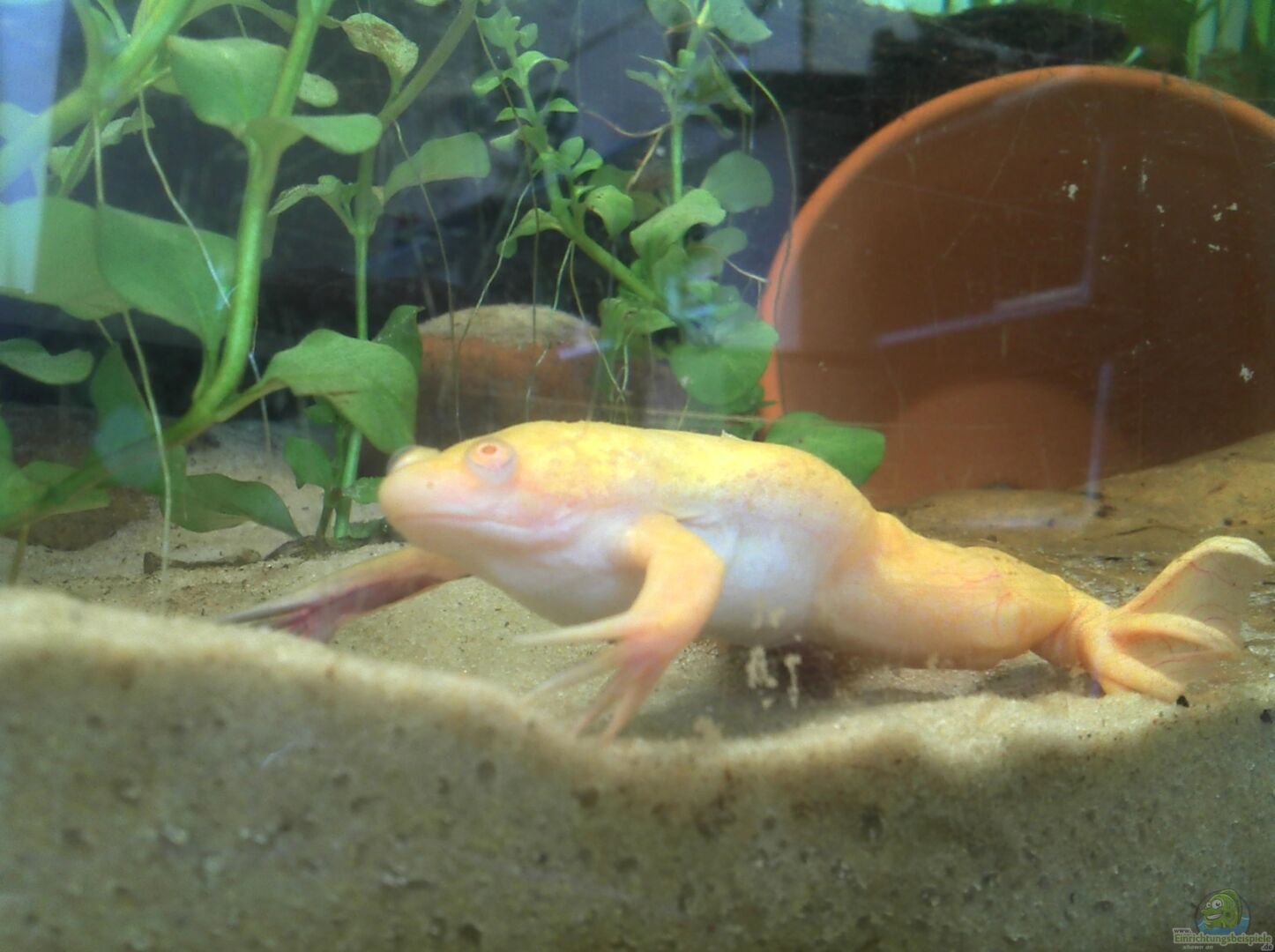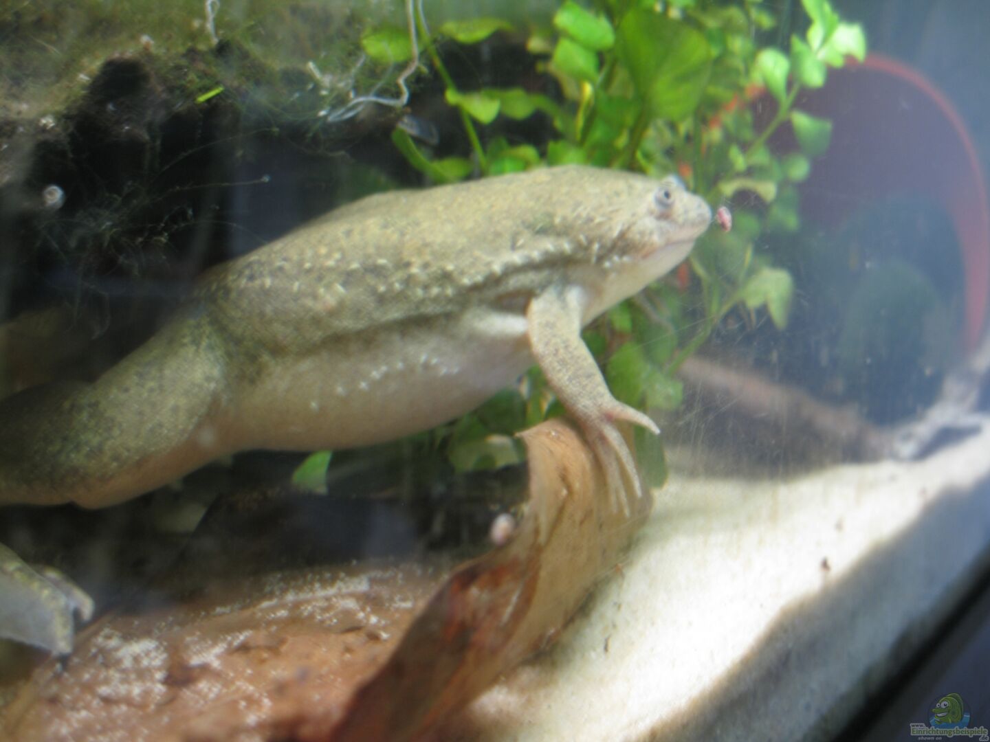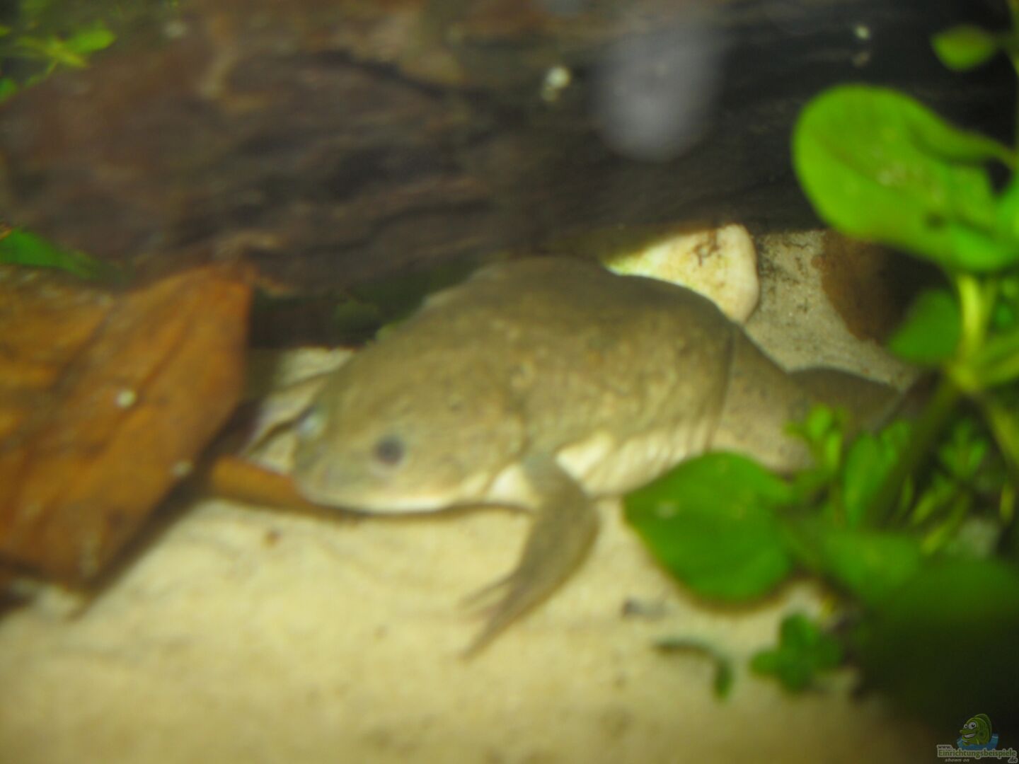 Zunächst hatte ich groben Kies im Becken, da es in der Literatur oft so angegeben wird. Ich habe aber dann direkt auf Sand umgestellt, als ich Berichte darüber gefunden habe, da?? Frösche Kies aus Versehen verschluckt haben und daran verendet sind, teilweise hatten sie den ganzen Magen mit Kies gefüllt. Au??erdem habe ich gehört, da?? sie gerne buddeln. Ich bin sehr gespannt darauf das selber heraus zu finden.