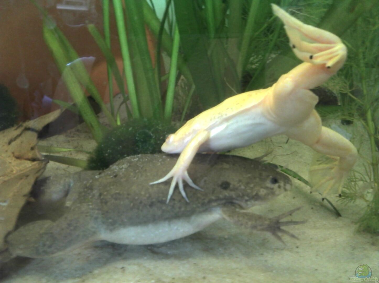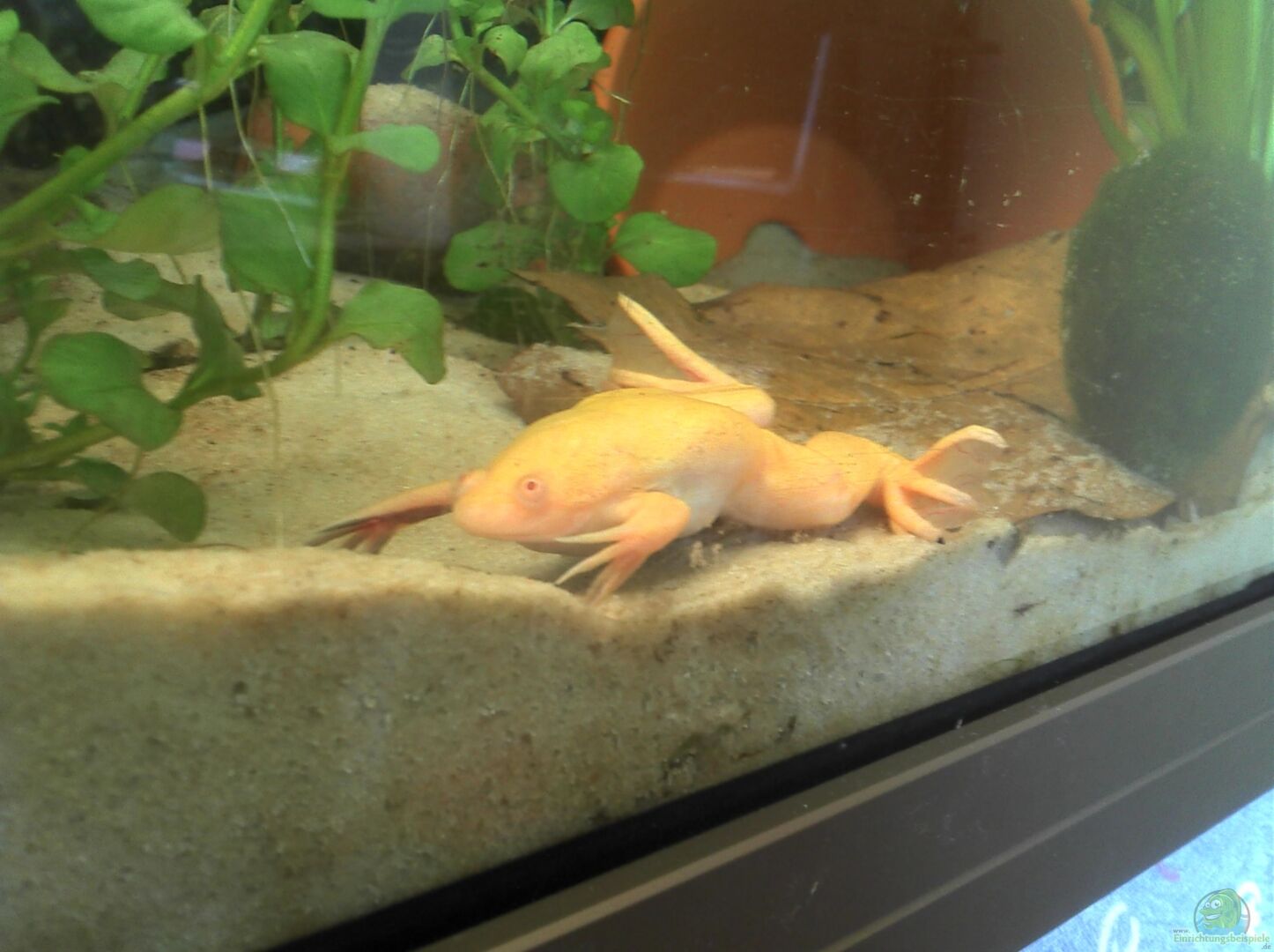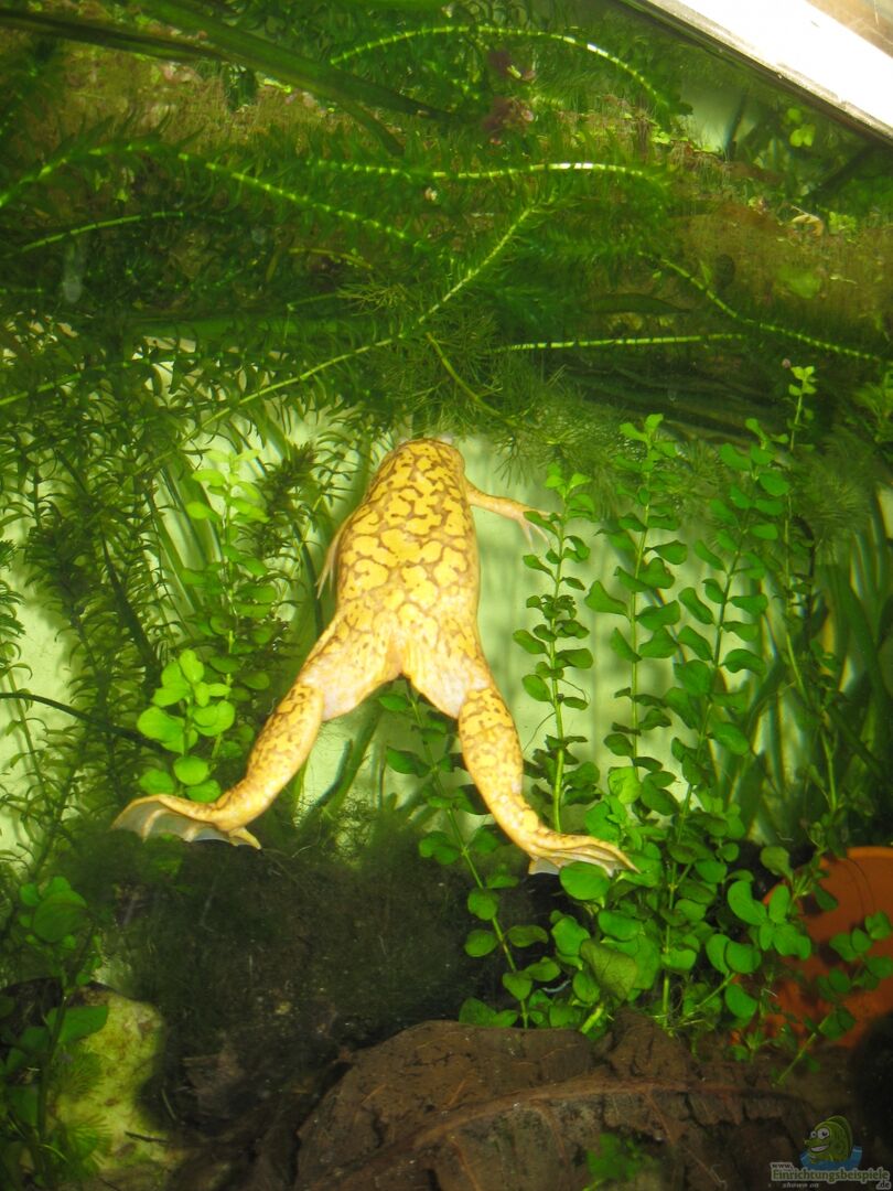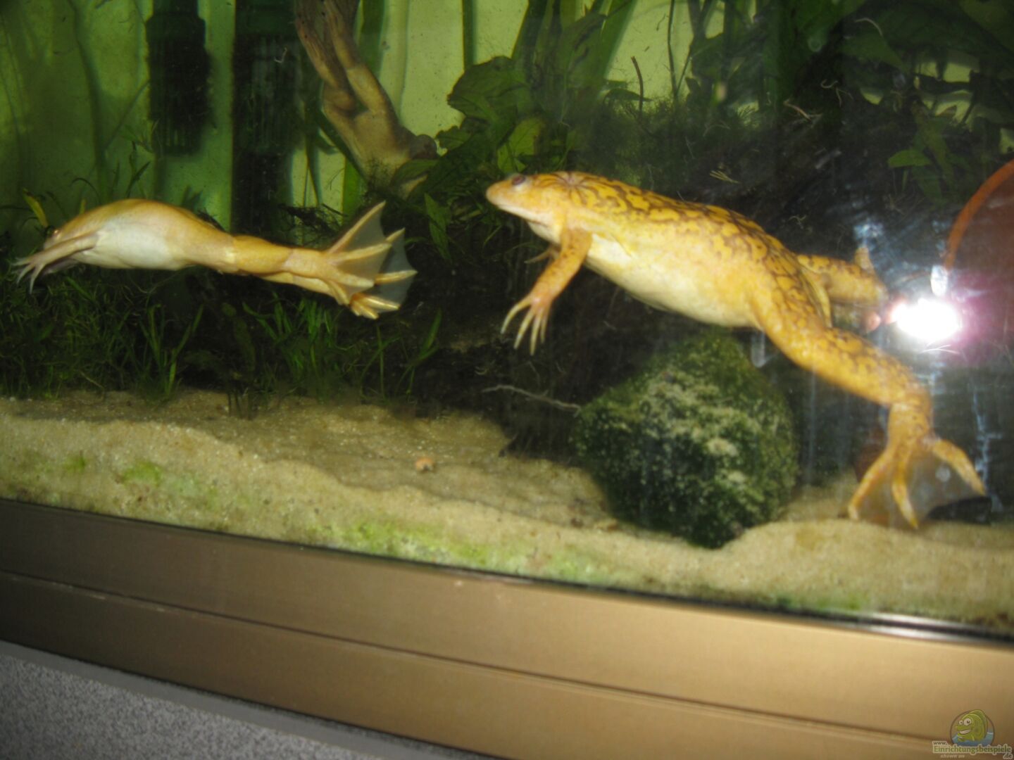 Zunächst hatte ich groben Kies im Becken, da es in der Literatur oft so angegeben wird. Ich habe aber dann direkt auf Sand umgestellt, als ich Berichte darüber gefunden habe, da?? Frösche Kies aus Versehen verschluckt haben und daran verendet sind, teilweise hatten sie den ganzen Magen mit Kies gefüllt. Au??erdem habe ich gehört, da?? sie gerne buddeln. Ich bin sehr gespannt darauf das selber heraus zu finden.