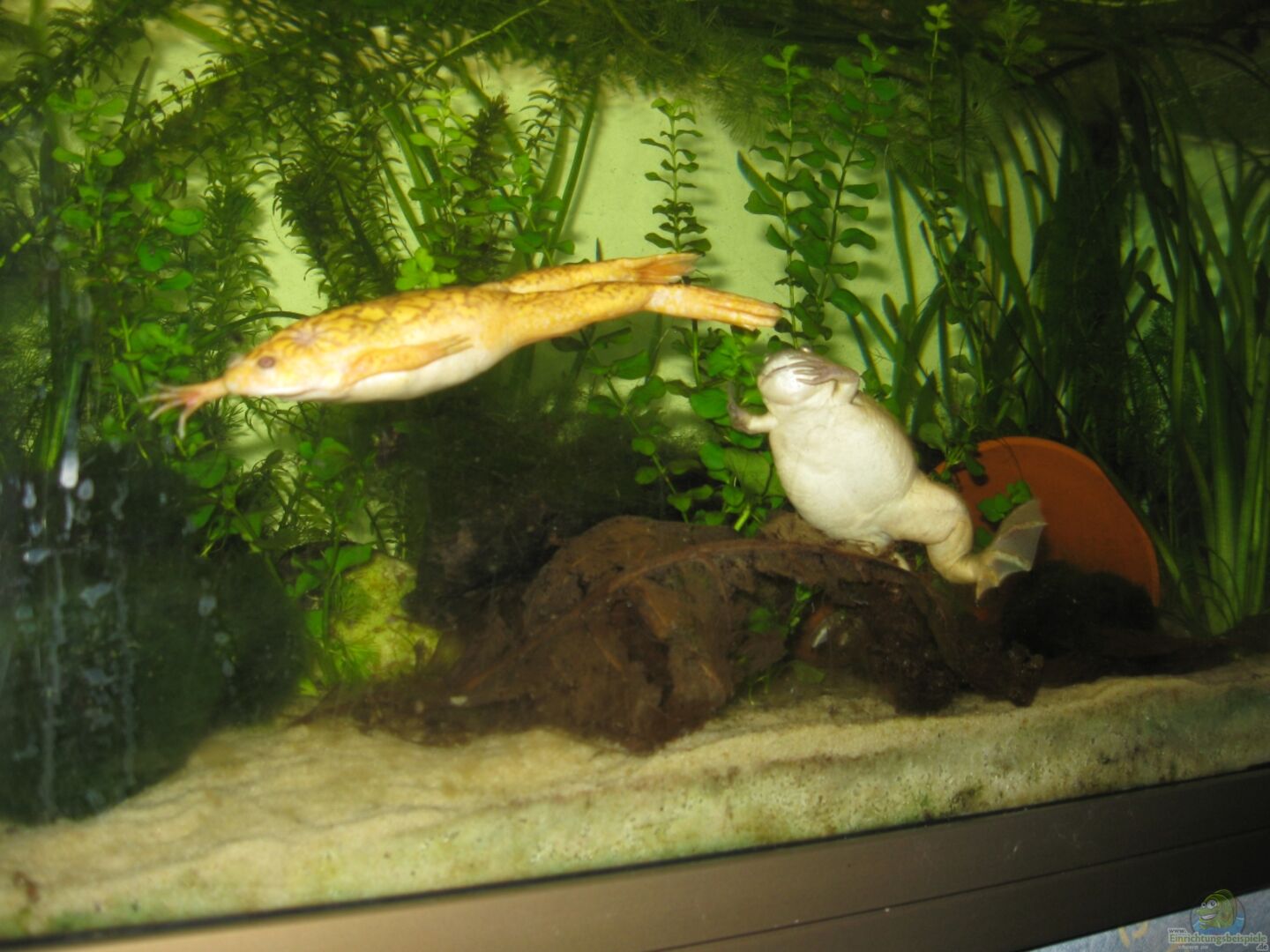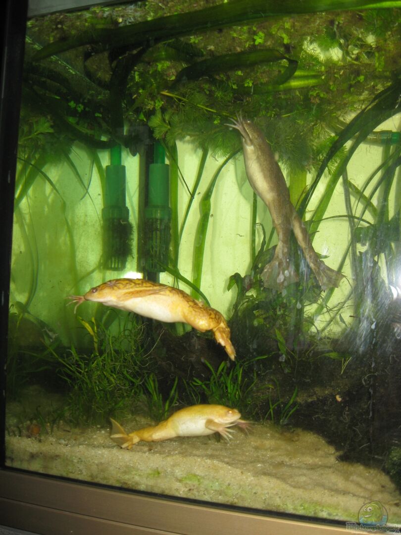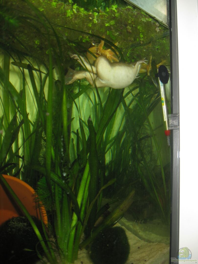 Es handelt sich hierbei um ein Eheim-Aquarium, welches ich gebraucht für 10??? incl. Unterschrank und Abdeckung gekauft habe. Es hat eigentlich ein Volumen von 250l - momentan ist es aber nicht bis ganz oben befüllt. Ob es so bleibt oder nicht kann ich erst sagen, wenn die Frösche eingezogen sind. Ich mache es von ihrem Verhalten abhängig, sollte sich heraus stellen, da?? sie gerne und viel schwimmen, werde das Aquarium voll machen. Mometan sieht es her so aus, als bliebe es bei dem niedrigen Wasserstand, da Gitti beim Füttern oft hoch springt und ein volles Becken das Risiko erhöht, da?? sie dann ganz raus hüpft.