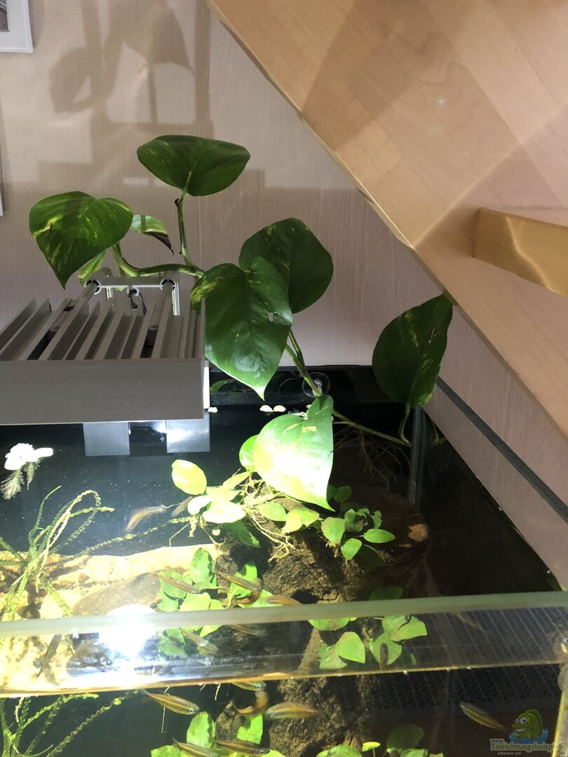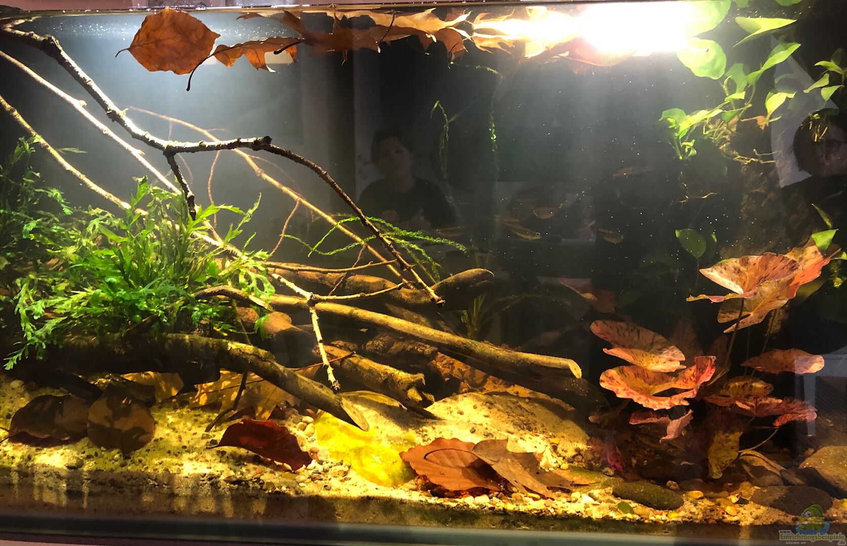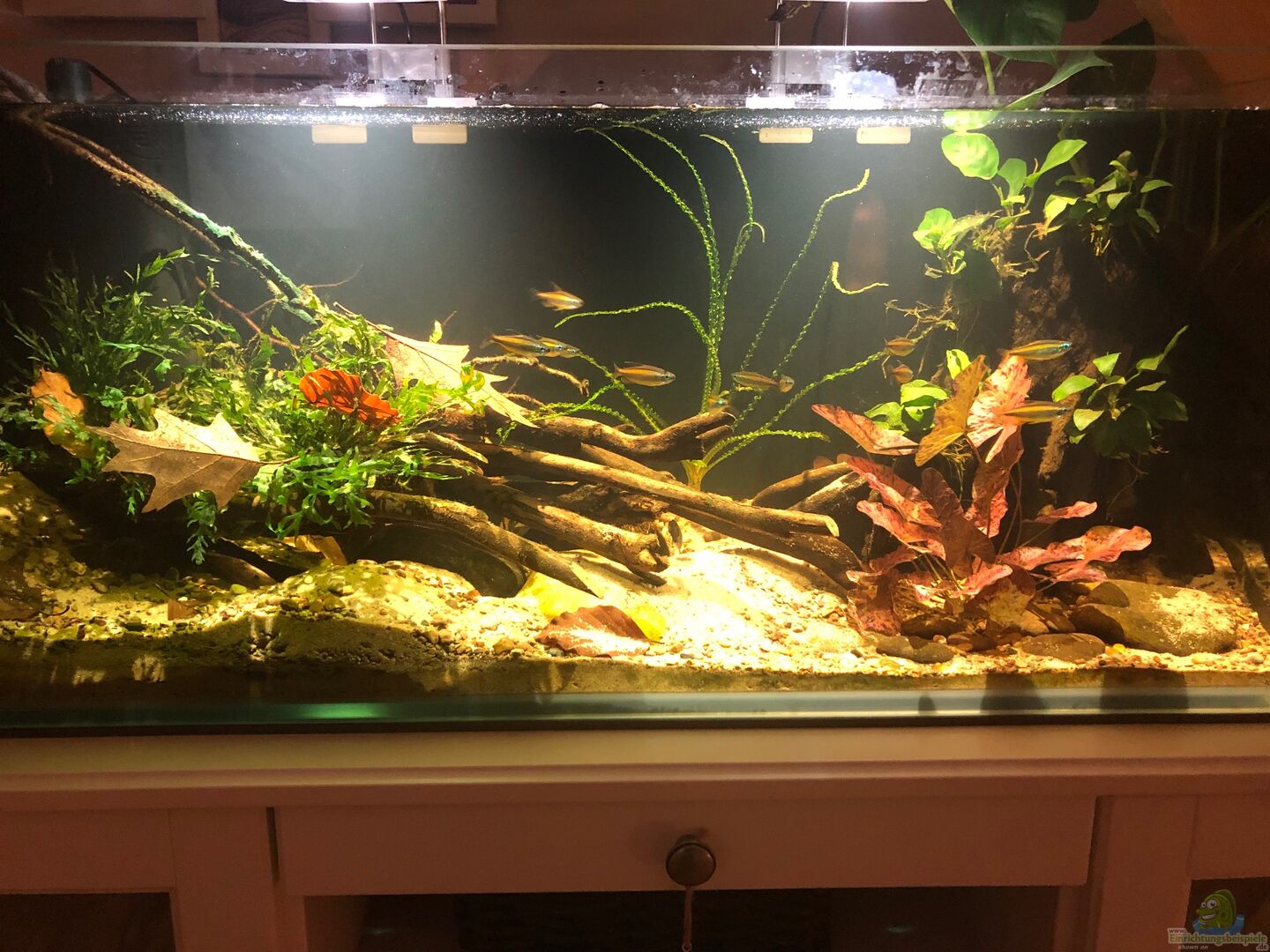 sehr schön gelungene Einrichtung. Gefällt mir sehr gut. Sehr seltener Besatz. Da bin ich mir aber nicht so sicher, ob das für die Beckengrö?e passt. Wenn die annähernd so agil sind wie andere Kongosalmler, befürchte ich, dass die Kantenlänge etwas kurz ist.