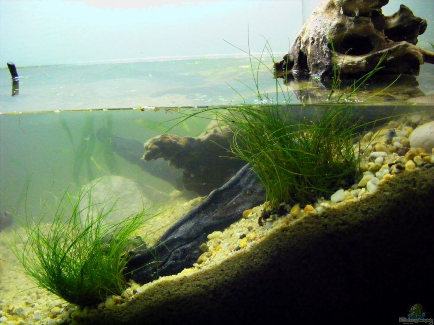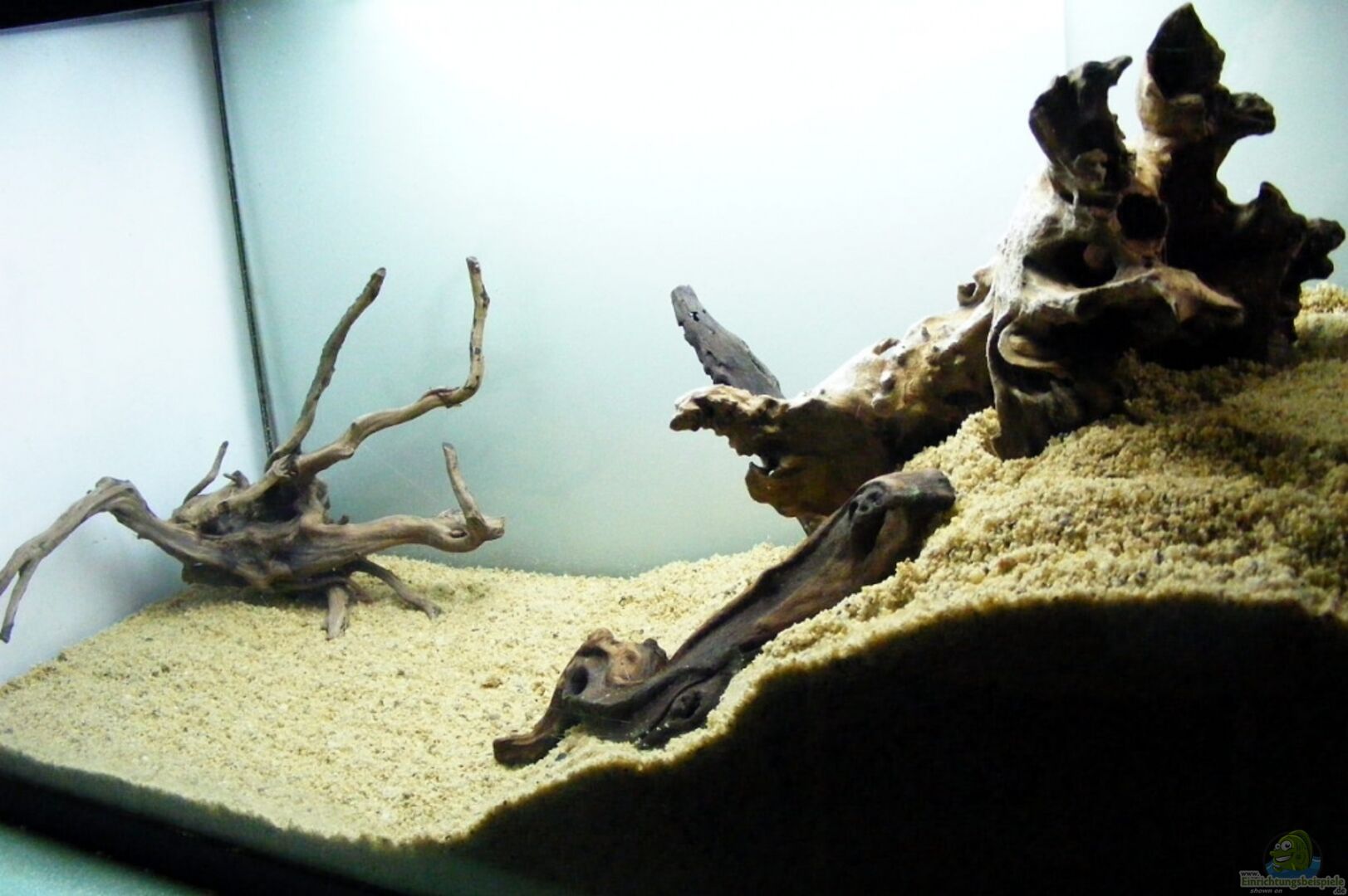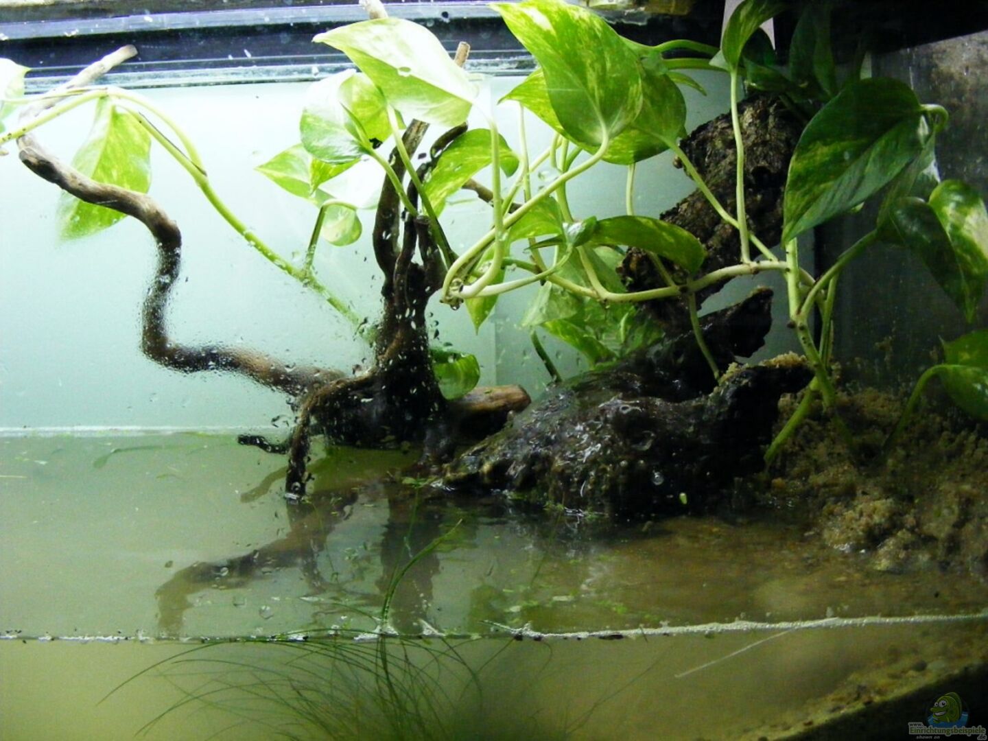 Ein Aquarium mit Landteil und steil abfallendem Seitenufer mit Wurzeln und Steinen.