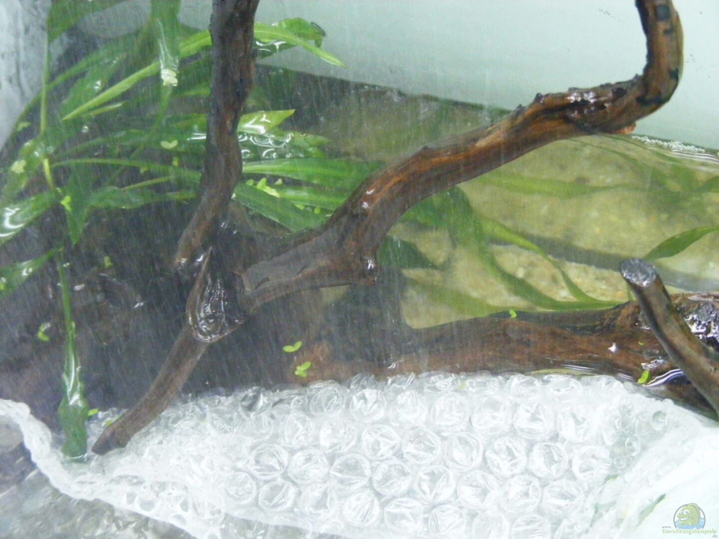 Dazu wird der Einlauf des Filters versteckt mittels Korkrinde, durch die das Wasser eingeleitet wird.F