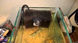 Der selbst gebauter Minifilter besteht aus einer 6W Pumpe (aus einem alten Tischspringbrunnen), welche ich in einen Filterschwamm eingesetzt habe. Die Pumpe zieht das Wasser durch den Schwamm und stö??t es vorne wieder aus.