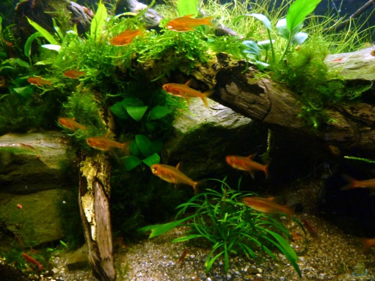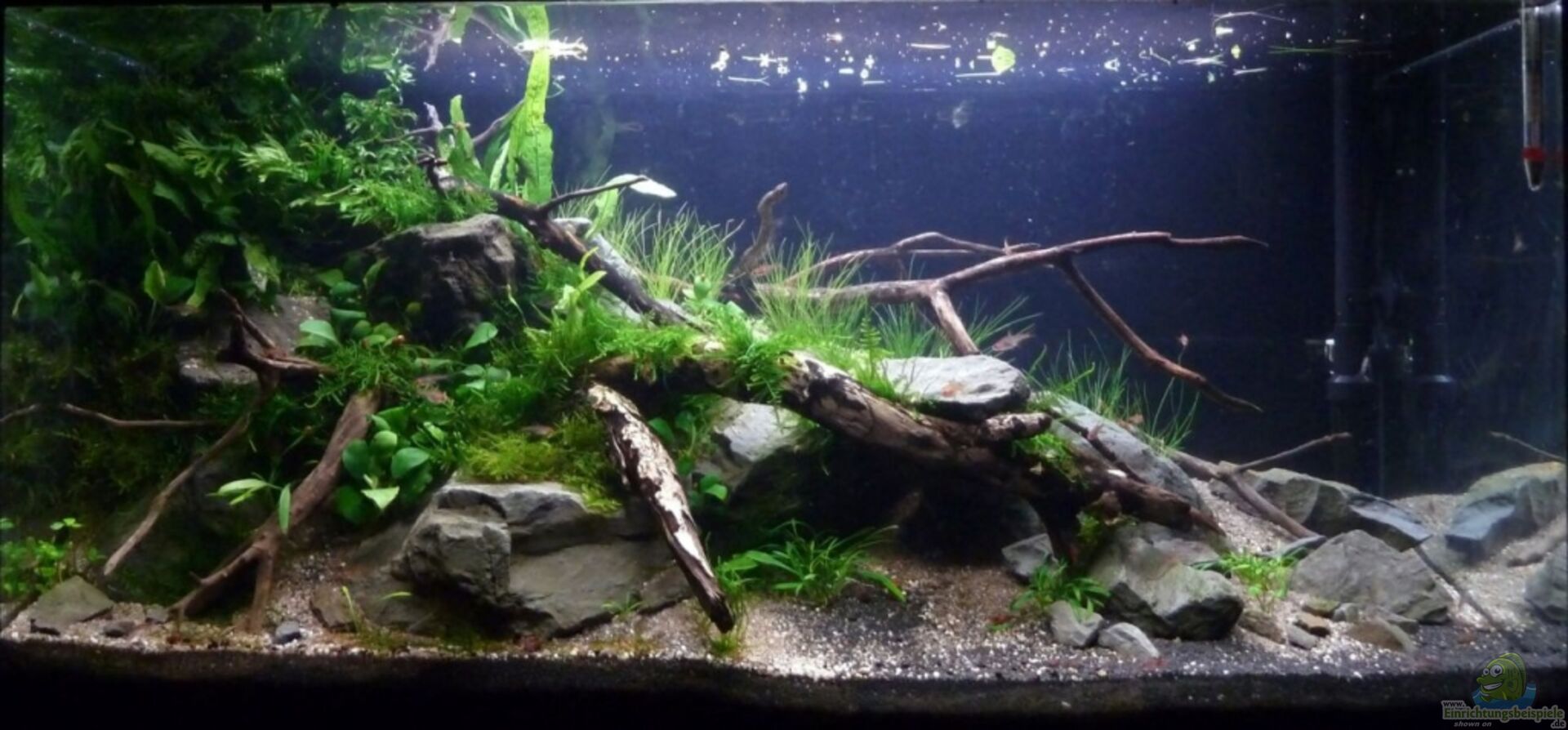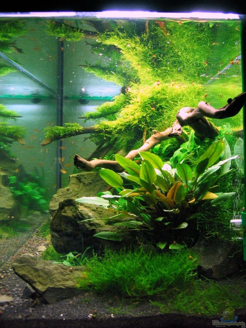 Das Becken ist zu einem reinen Zuchtbecken für meine Sakuras umgerüstet worden. Düngung und Beleuchtung wurden auf ein sehr reduziertes Ma?? zurückgenommen, um den Garnelen ein lauschiges Plätzchen zu schaffen und den Algen nicht unbedingt die Tür aufzusto??en (wegen der ebenfalls stark reduzierten Pflanzenmasse). Im Becken befinden sich nur noch langsam wachsende, anspruchslose Pflanzen.