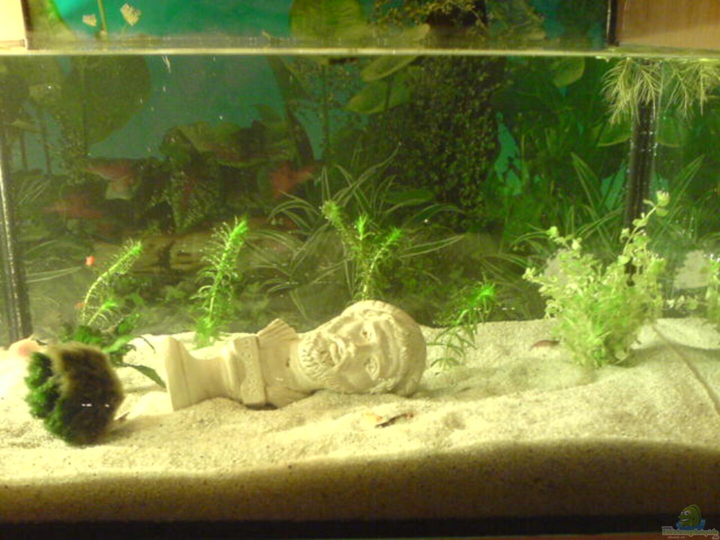 Die gro?e Pflanze und der Kopf sehen richtig gut aus. Nur Dein Besatz passt nicht so ganz von der Wasserwerten und der Aquariengrö?e zusammen. Manche wie z.b. Molly, Platy mögen eher etwas härteres Wasser und der Rest eher weicheres. Ich würde die Mollys aus dem Aquarium nehmen, da sie fast zu gro? werden (ca. 10 cm pro Fisch). Die Fadenfische bräuchten wenn sie mit anderen Fischen zusammengehalten werden auch ein grö?eres AQ, da sie bei der Paarung Reviere bilden und dann können sie ziemlich aggressiv werden. Ich würde die Platys drin lassen, die vermehren sich auch ziemlich bald ;-), die Garnelen passen auch gut rein und bei den Welsen würde ich ich auf eine Art z.b. Panda oder Albino beschränken und die dann auf 6 Stück aufstocken. Den Rest würde ich wieder in die Zoohandlung bringen. Denn nach dem ersten Nachwuchs der Platys (kommt alle 3-4) ist das AQ voll! Vielleicht würden noch ein paar kleinere Vorderpflanzen gut reinpassen, wie z.b. Moosball oder sowas!