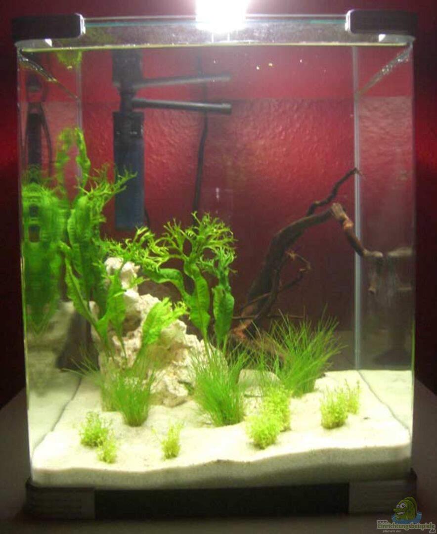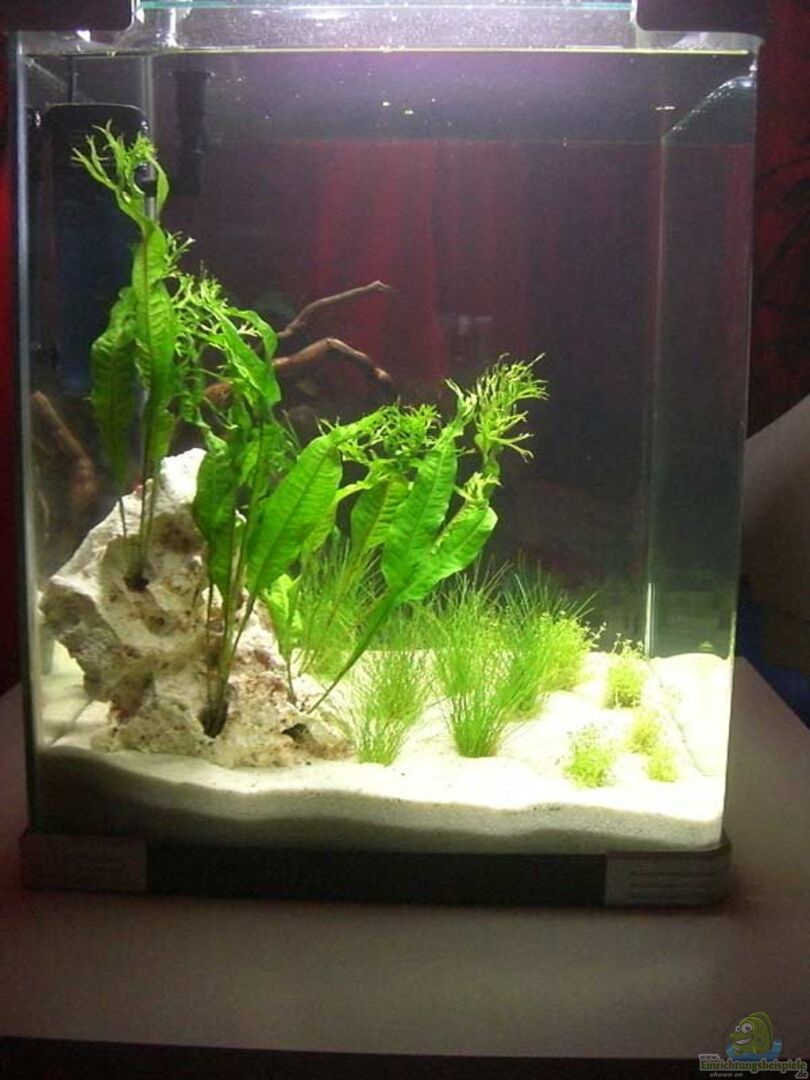 das Becken sieht neu und ziemlich steril aus. Der Stein gehört eher in ein Malawibecken und der wei?e Sand ist Geschmacksache. Die meisten Tiere fühlen sich auf dunklem Bodengrund wohler, bzw.sehen farblich besser darauf aus.