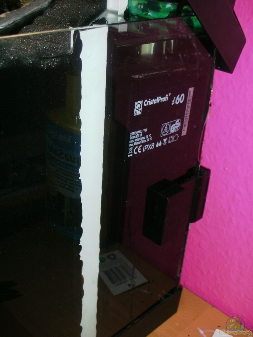 JBL Christal mit zwei Kammern hinter HMF instaliert, der HMF ist hinten schräg rechts in der ecke eingebaut. Plexiglasscheibe eingeklebt, vorher eine gro??e rechteckige öffnung rausgesägt, feine Filtermatte hinter Plexiglasscheibe installiert und dahinter der Jbl Innenfilter.Desweiteren habe ich die Plexiglasscheibe mit teilen der 3 D-Rückwand verkleidet.