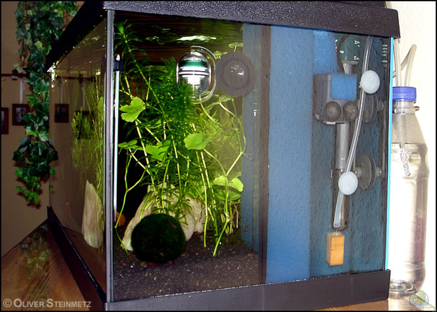 Bio-CO²-Anlage Marke Eigenbau mit Lindenholzausströmer unterhalb der Pumpe. Die Anlage macht ca. 10 Blasen/Minute - die feinen Bläschen steigen aus dem Lindenholzauströmer direkt in die Pumpe und werden so nochmals in das Becken geschleudert. Hierdurch löst sich das CO² fast vollständig im Wasser.