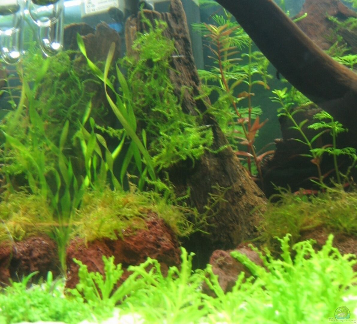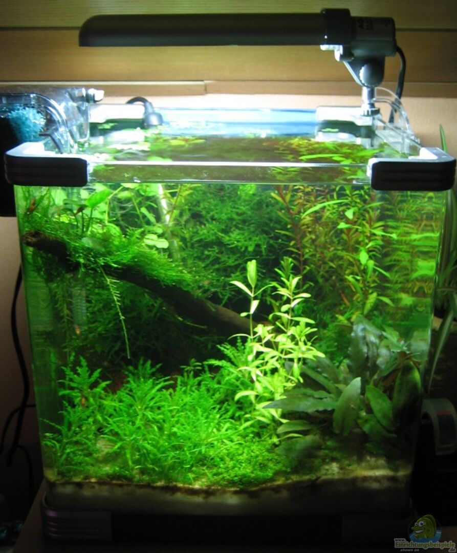 offenes Nano Cube Glas Aquarium, mit gerundeten Kanten, daher die rechnerisch unpassende Literangabe. Das Aquarium steht auf meinem Schreibtisch