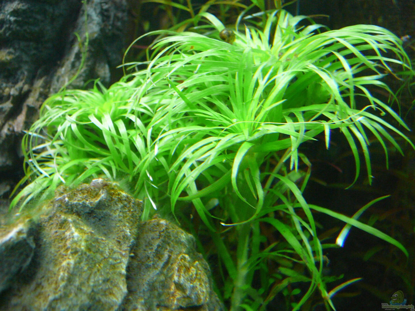 Riccia fluitans ist eigentlich eine Schwimmpflanze die bei uns unter dem Namen Teichlebermoos bekannt ist. Wenn sie an der Wasseroberfläche treibt, bildet sie dichte Polster, die man durch einfaches Teilen vermehren kann. Auf Steine oder Wurzeln aufgebunden muss Riccia fluitans regelmä??ig beschnitten werden, da ansonsten die unteren Teile der Pflanze absterben und der Rest wieder an die Oberfläche treibt.