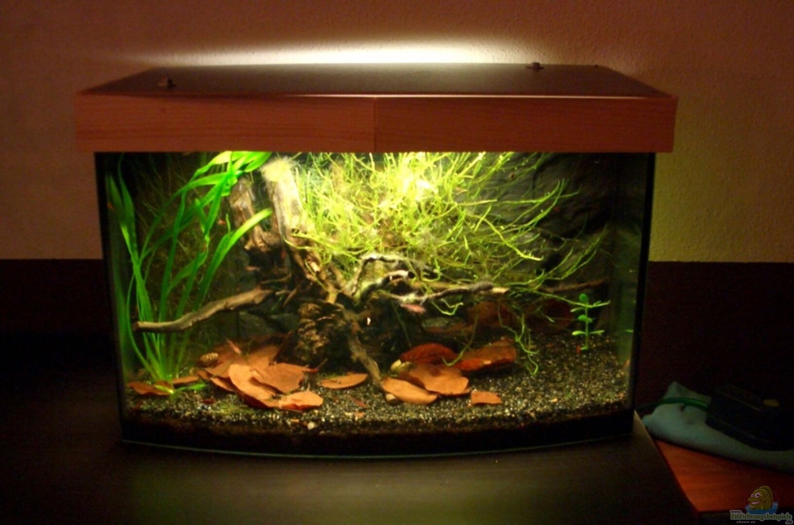 der Mattenfilter ist in der linken hinteren Ecke, bewachsen mit Javamoos, somit unsichtbar. Die kleine Pumpe ist nicht gedrosselt und erzeugt ordentliche Wasserbewegung.Die Garnelen mögen Strömung.