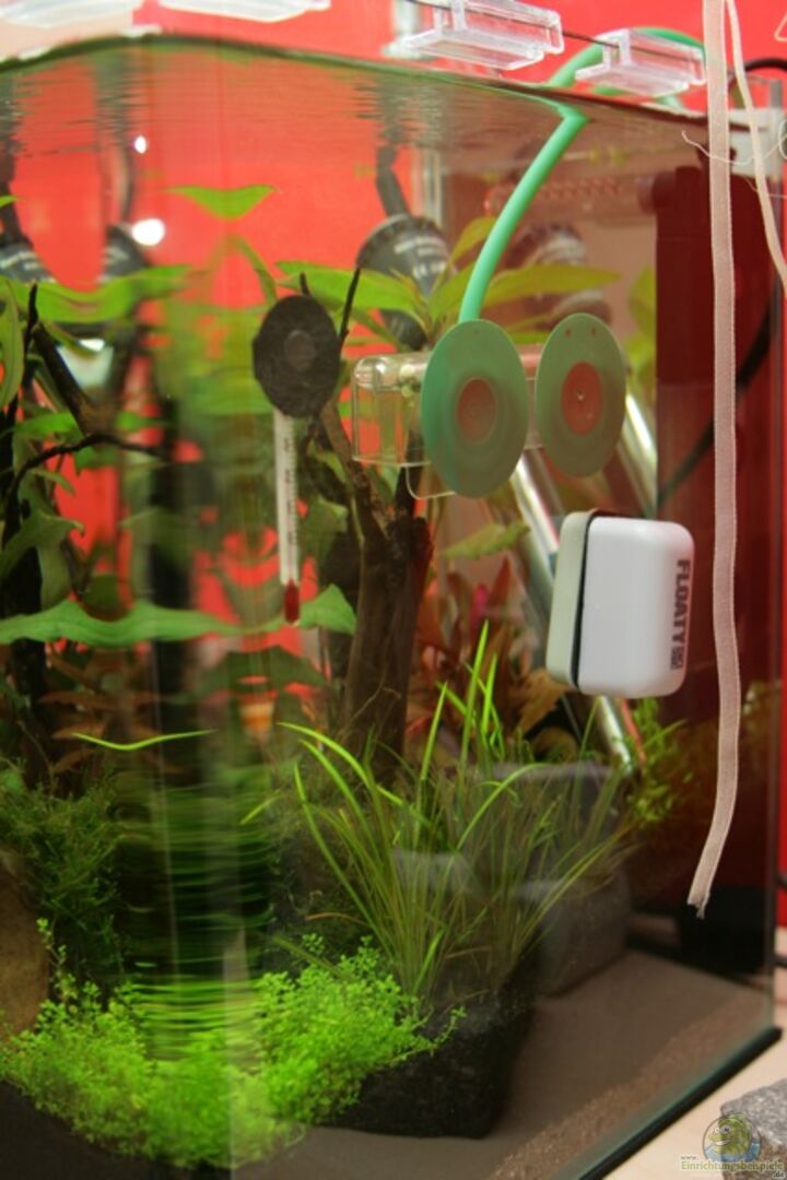 bei kleinen Becken sollte man darauf achten, die Technik, sofern überhaupt nötig, nach hinten zu verbannen, am besten hinter gro?e Pflanzen.Dann die originale schwarze Dennerle-Rückwand anbringen. Kabel und Schläuche interessieren keinen!