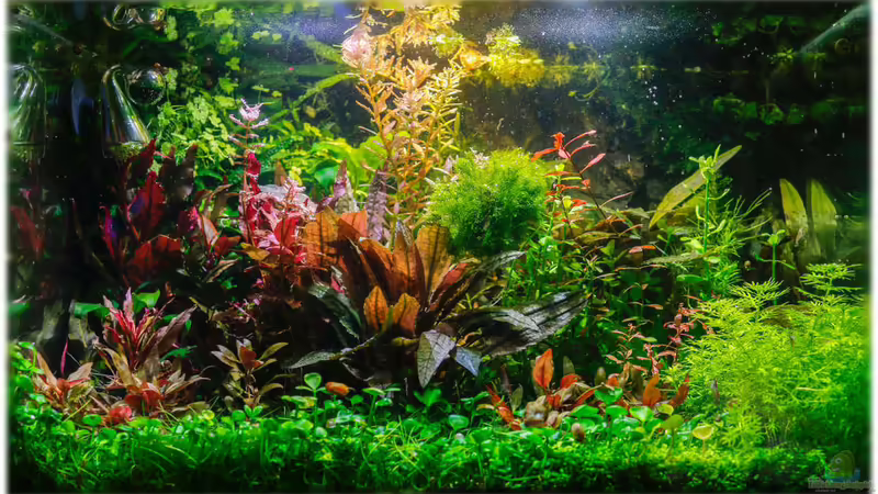 Die CO2 Zugabe erfolgt über eine Kunststoffglocke (Diffuser), unten geöffnet. Das Natelventil ist so eingestellt, dass die Glocke mit CO2 gefüllt ist - Prinzip Pafrathschale. Tröpfchentest ergaben einen CO2-Gehalt von 10 bis 20 mg/l. Sehr wartungsarm, man braucht sich um nichts weiter zu kümmern. Dauertest ist keiner im Becken. Da die sporatischen Messungen immer ähnliche Werte ergab, nehme ich das mittlerweile als gegeben hin.