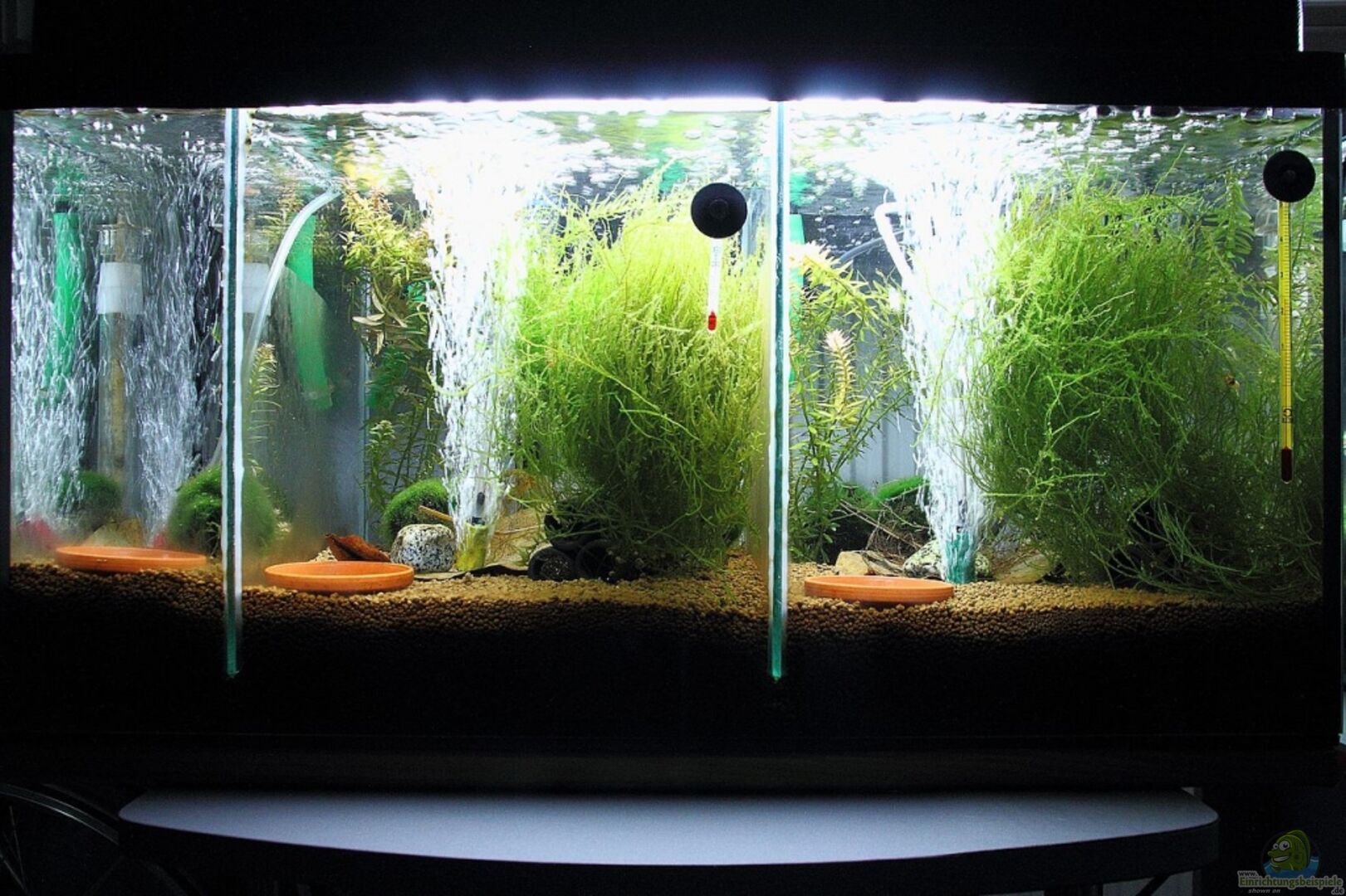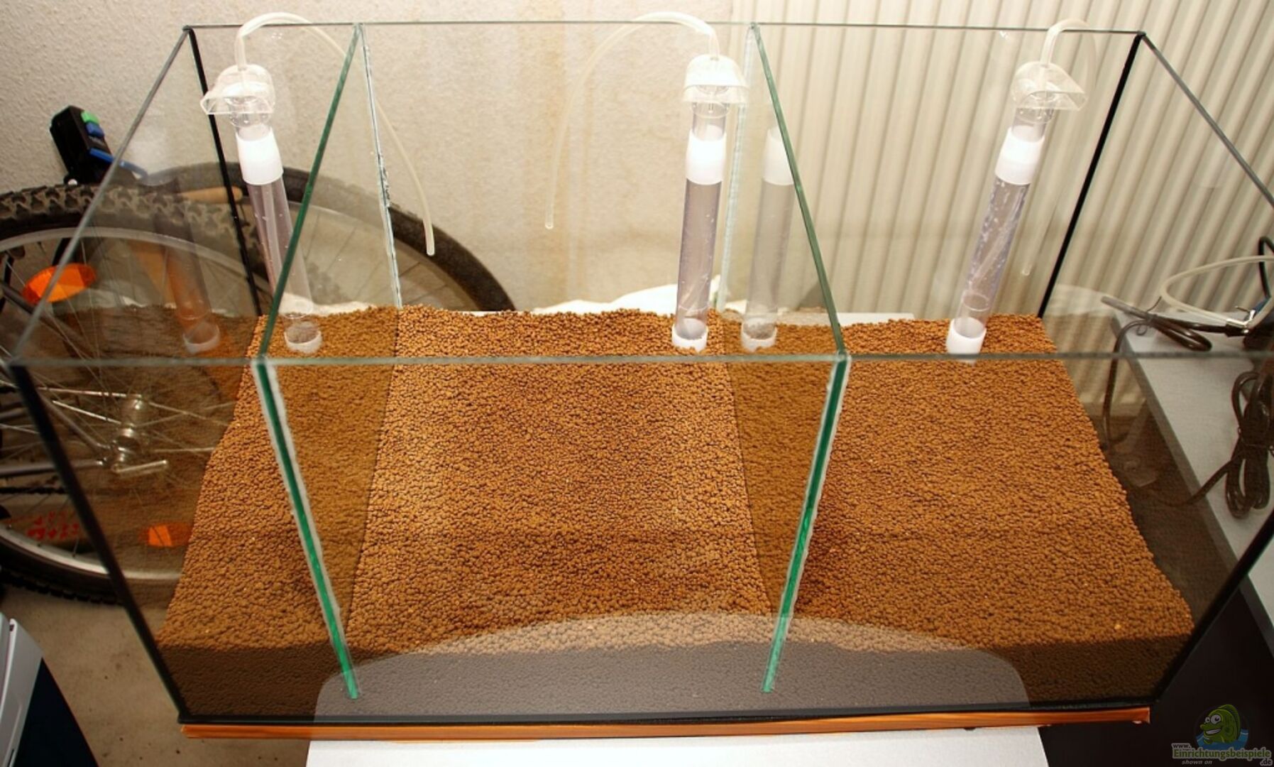 Das Becken selbst ist ein handelsübliches 54er Becken von Tetra (kein AquaArt!), in welches ich zwei Glasscheiben zur Trennung eingeklebt habe. Die Trennung verläuft jedoch nur oberhalb des Bodenfilters, sodass das ganze Becken ein verbundenes Bodenfiltersystem hat. Somit habe ich über den Bodengrund ein Filtersystem mit 8 Litern Volumen auf (Rest/netto) 46 Liter Wasser.