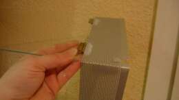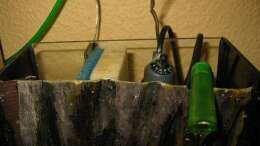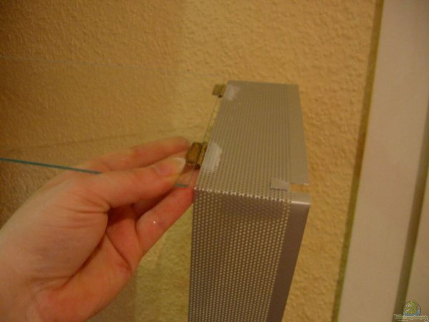 Das Lochblech ist genau so breit wie der Filter, so dass dort Luft rein aber keine Tiere raus können.(selbst Krebse hätten es wirklich schwer!) Das Lochblech ist am Aquarium festgemacht, mit kleinen Schanieren lässt sich so eine Abdeckung zum Füttern und reinigen anheben.