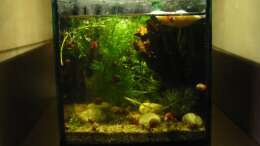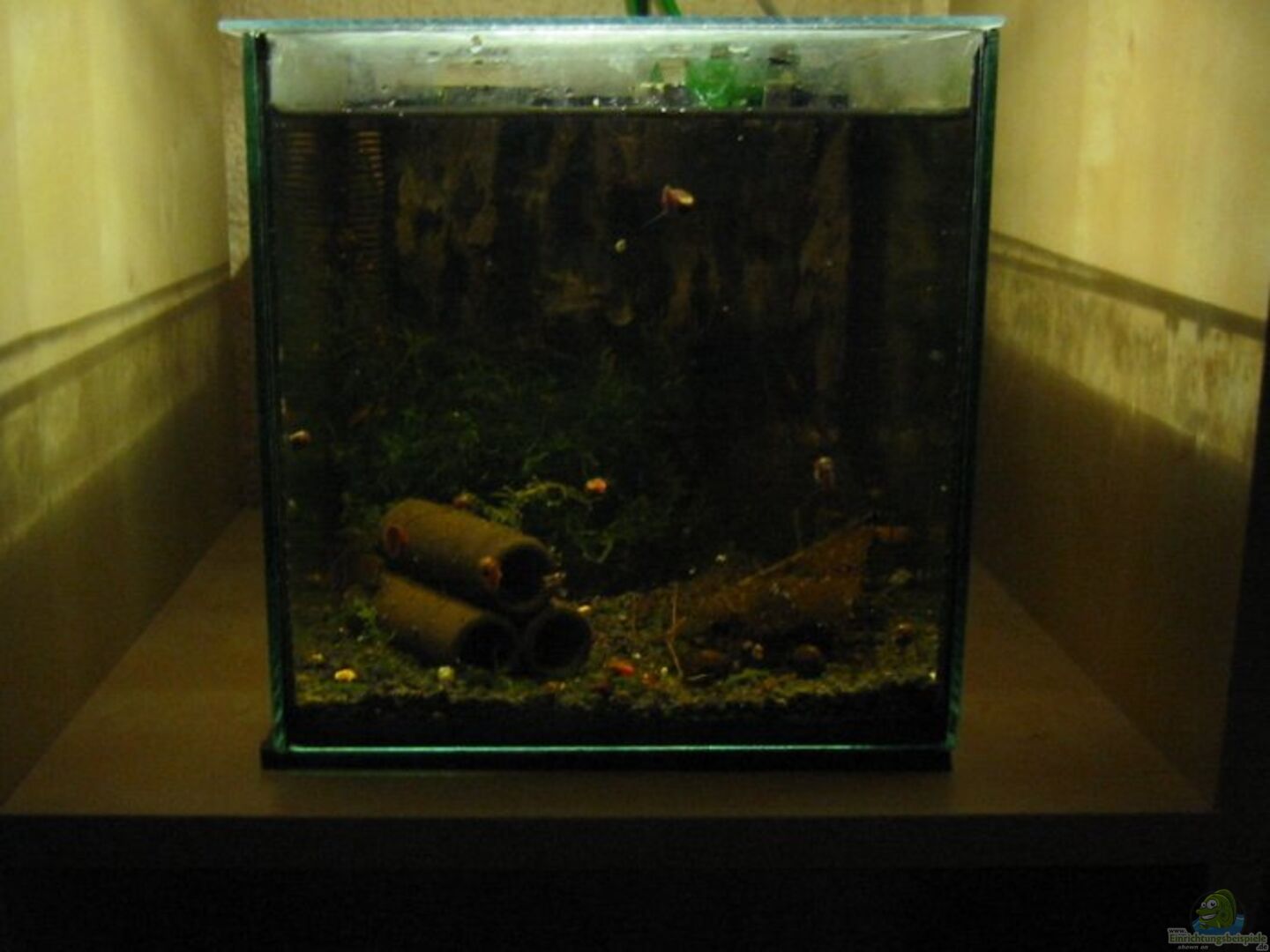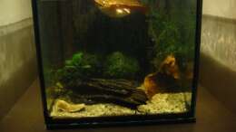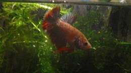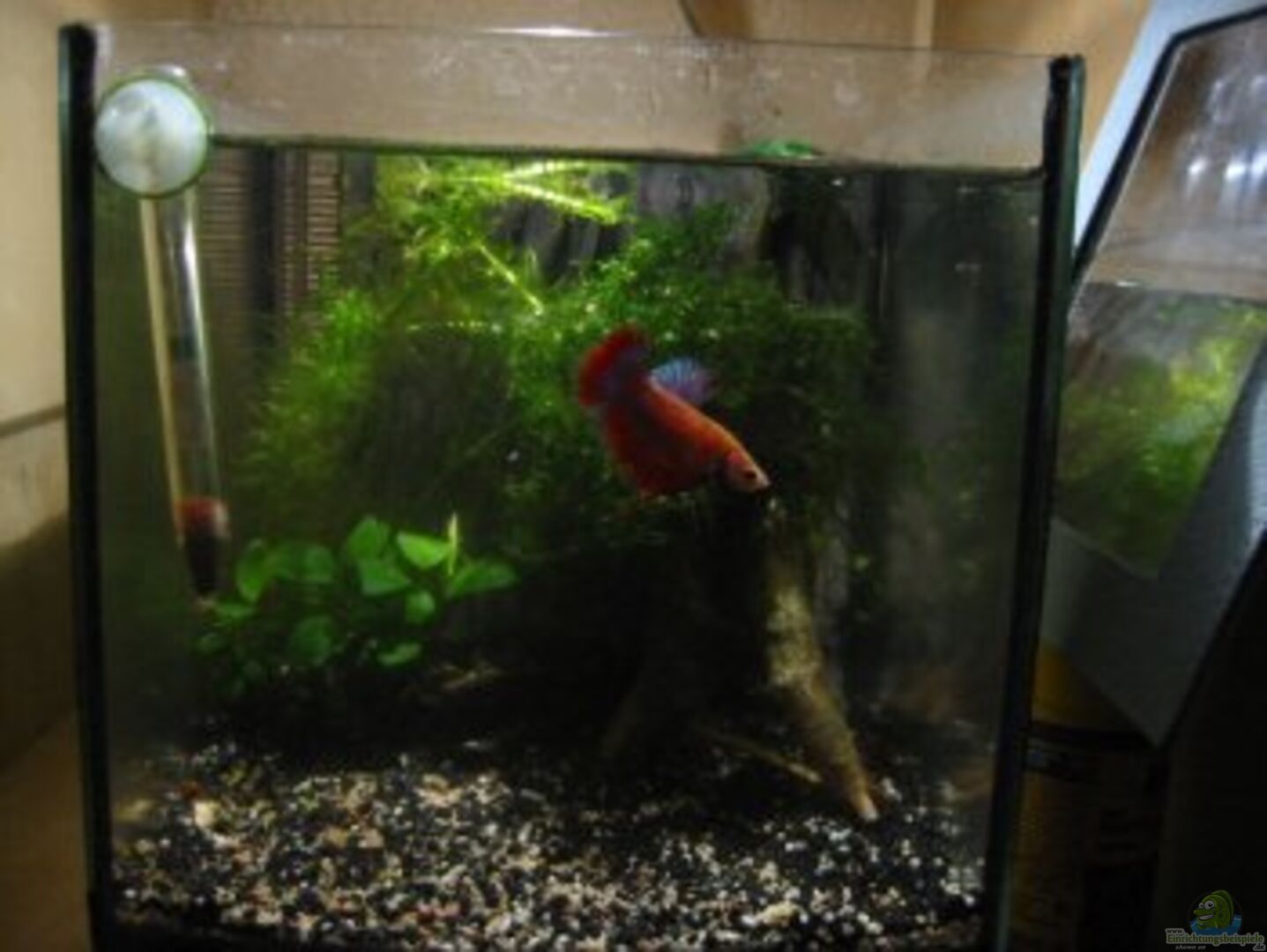 Da ich urplötzlich Planarien in allen 4 Becken hatte, absammeln nicht half und die ersten Schnecken starben musste ich handeln. Da man bei Schnecken nicht einfach ein Mittel reingeben kann habe ich auf Anraten einen Kampffisch besorgt der tatsächlich innerhalb weniger Tage alle vier Becken nacheinander saubergefressen hat. Hat halt auch sonst nichts zu fressen bekommen. Die Planarienplage ist nun also weg und der Kampffisch noch da. Ist ein ganz einfacher aus einer Zoohandlung, nichts besonderes aber irgendwie sieht er doch nett aus. Inzwischen kriegt er dann auch eigens für ihn gekauftes Futter (TetraBetta und JBL Novo Betta) und er scheint sich ganz wohl zu fühlen.