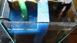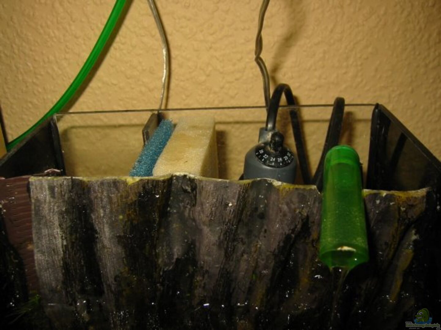 Filtermatte zwischen der Rückwand und der Rückscheibe festgeklemmt und dahinter je eine Eheim Compact 300 Pumpe. Ein Stück Filtermatte obendrauf damit Tiere die sich verirren nicht von der Pumpe zermalmt werden.