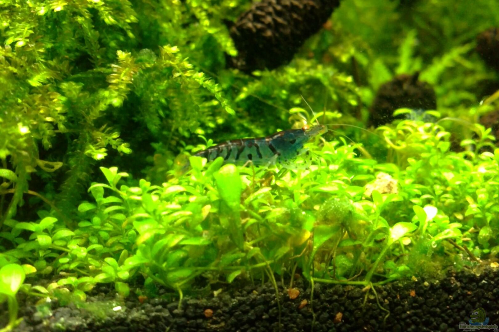 Caridina cantonensis cf. blue tiger ist eine Hochzuchtform der "normalen" Tigergarnelen, welche ebenso wie die Bienengarnelen aus der Wildform von Caridina cantonensis herausgezüchtet wurden. Mit einer Endgrö??e von etwa 3 cm liegt auch diese Garnele im Soll der Zwerggarnelen. Ihre kräftige Blaufärbung mit den hellen auffallenden Augen machen sie zu einer sehr begehrten und attraktiven Garnele.