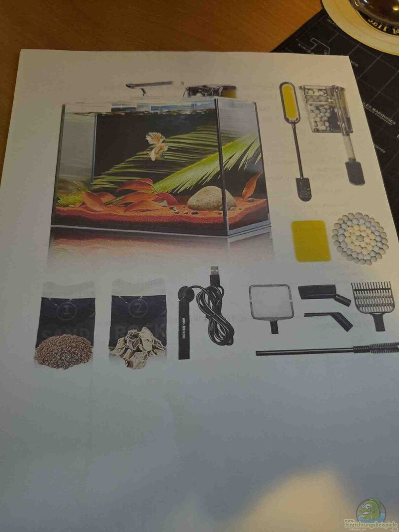 Nano-Komplettset mit Beleuchtung, Filter; Heizung, Bodengrund und Steine, wird teilweise mit vorhandener Hardware und Einrichtung ergänzt/getauscht