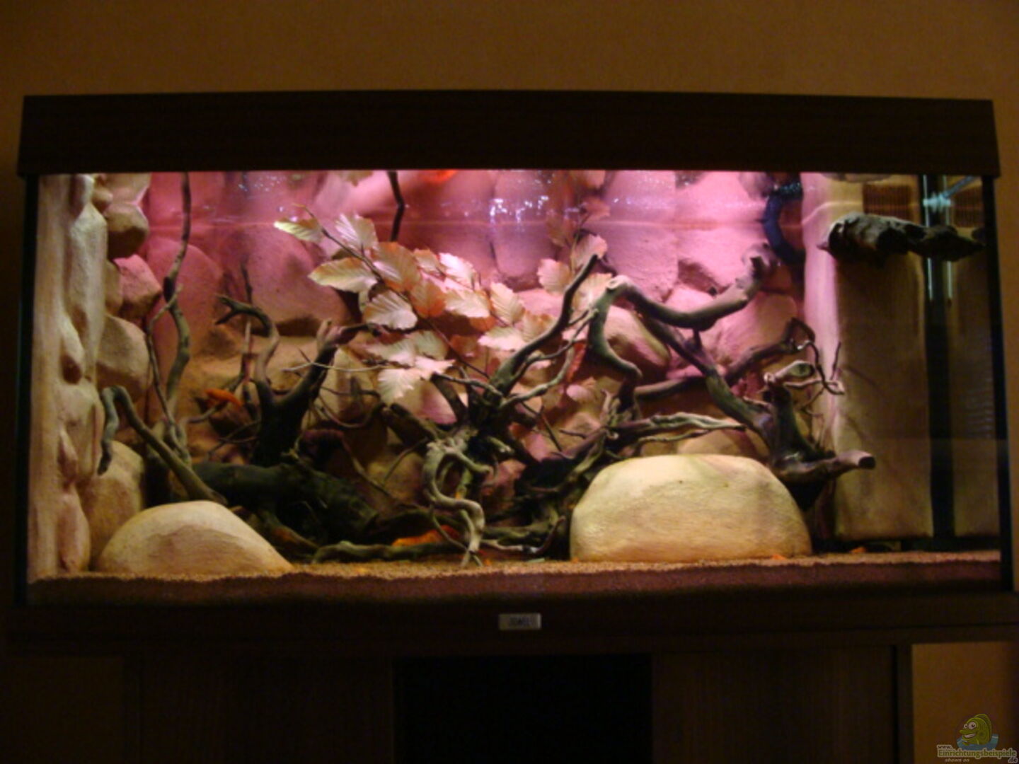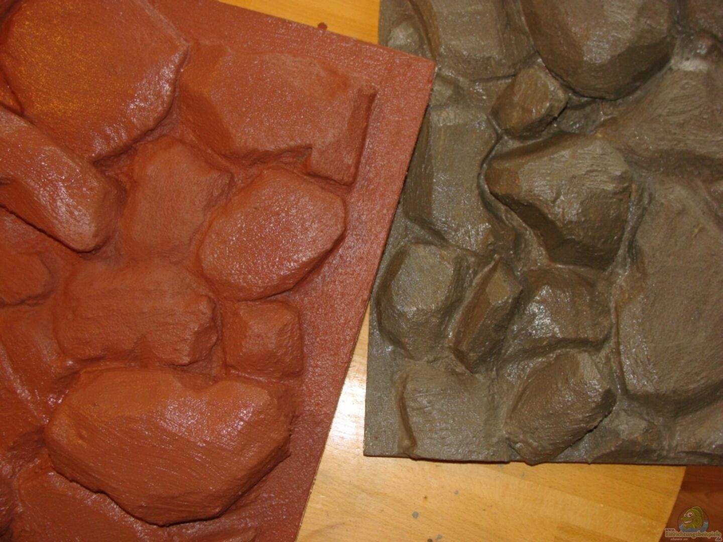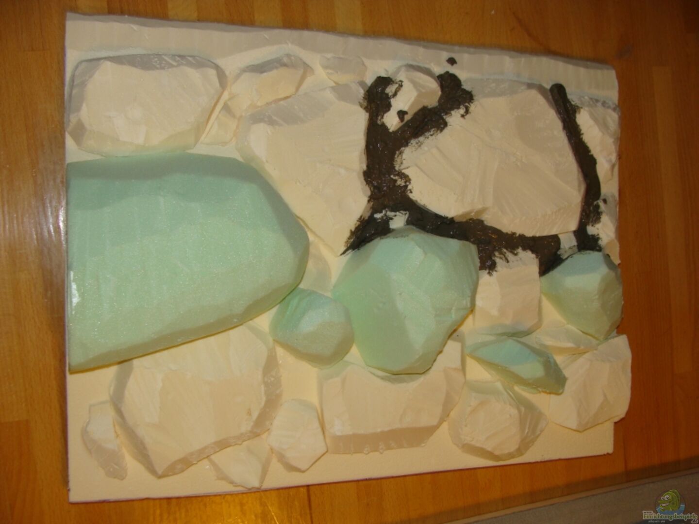 Materialien: Styrodur, Portlandzement CEM1 und Abtönfarbe, Rückwand wurde vor dem Einbau 8 Wochen gewässert, dabei erfolgten mehrere 100% Wasserwechsel