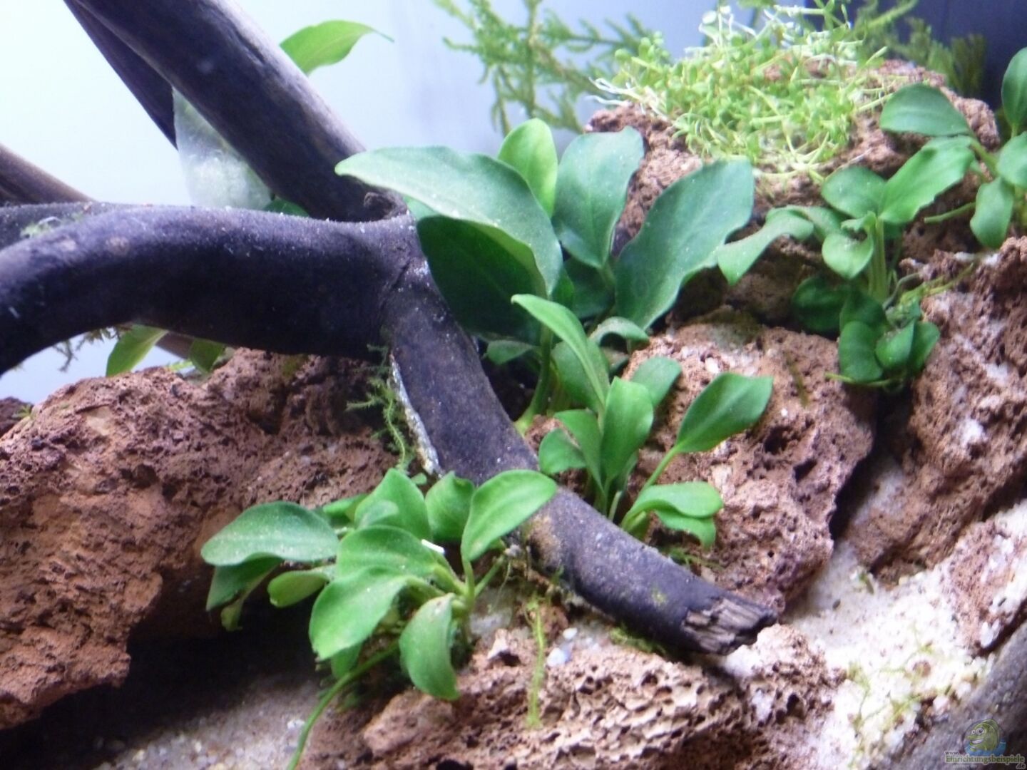 Anubias barteri var. nana ist eine kleine attraktive Pflanze, die unter allen Bedingungen gedeiht. Sie stammt aus Kamerun und wird 5-10 cm hoch. Sie wächst langsam und kann deshalb von langsam wachsenden Algen befallen werden. Sie sieht auf einem Stein oder einer Wurzel am besten aus. Sie kann mit Nylonschnur fixiert werden, während sie anwächst. Beim Einpflanzen in den Bodengrund darf der Wurzelstock nicht bedeckt werden, da er sonst leicht fault. Sie blüht häufig unter Wasser und wird selten von pflanzenfressenden Fischen gefressen.
