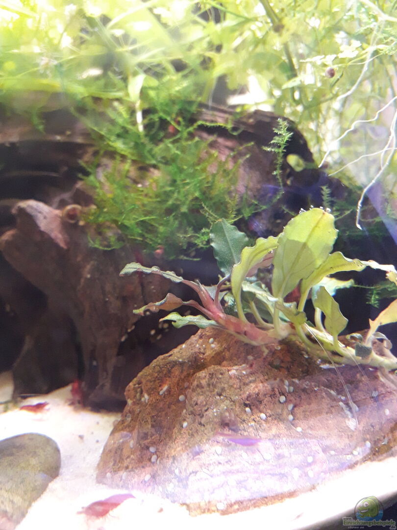 Später folgte noch eine kleine Bucephalandra, aufgebunden auf einen Stein. Die genaue Art kann ich jedoch auch nicht angeben, da ich sie wieder geschenkt bekommen habe.