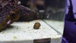 1x Clithon spec. (Geweihschnecke) Das Gehäuse des armen Tieres hatte in meinem Süsswasser Garnelenbecken wegen Kalkmangel sehr stark gelitten. Seit sie im Brackwasser lebt ist sie viel munterer. Das Gehäuse bleibt leider defekt.