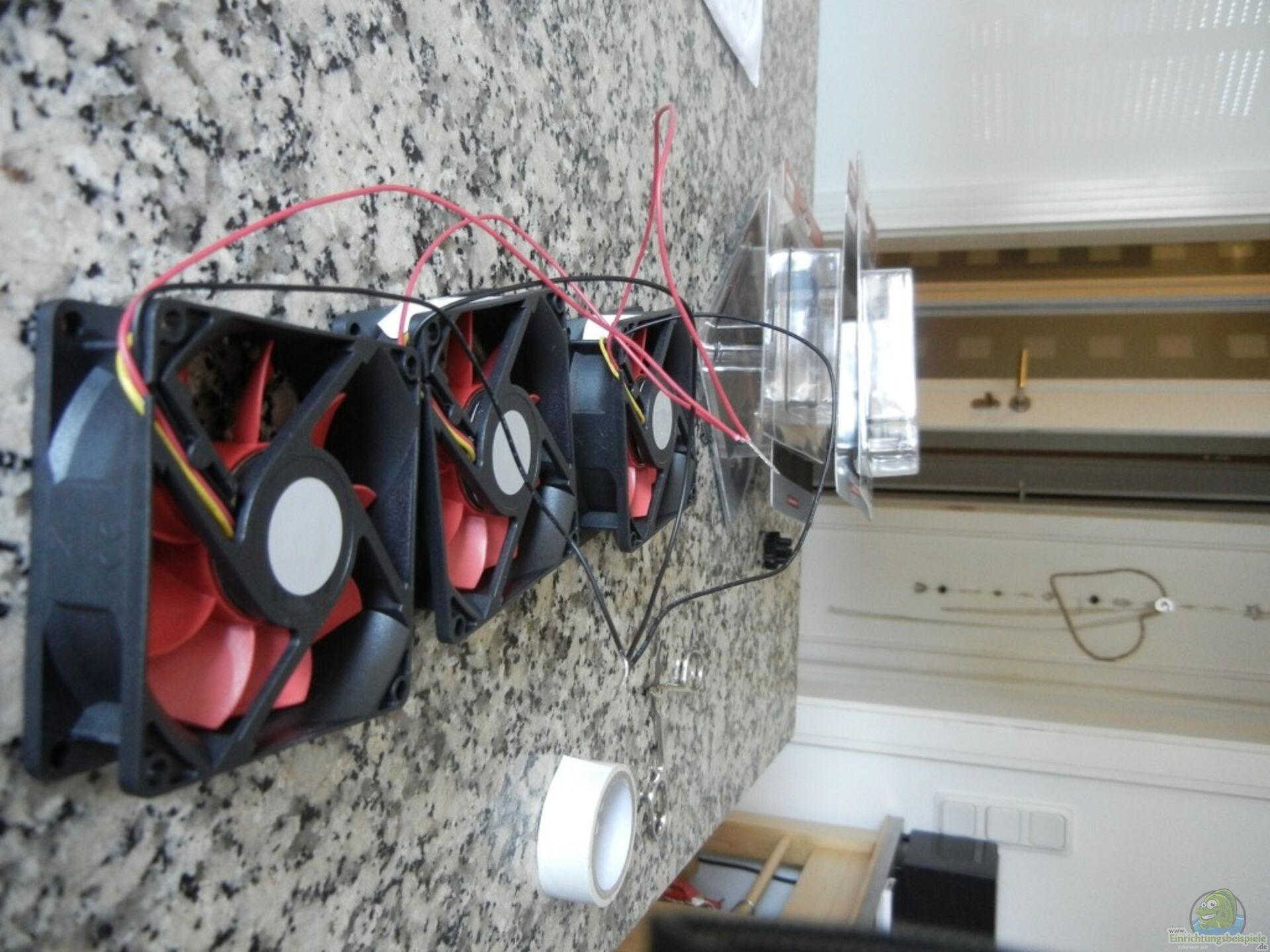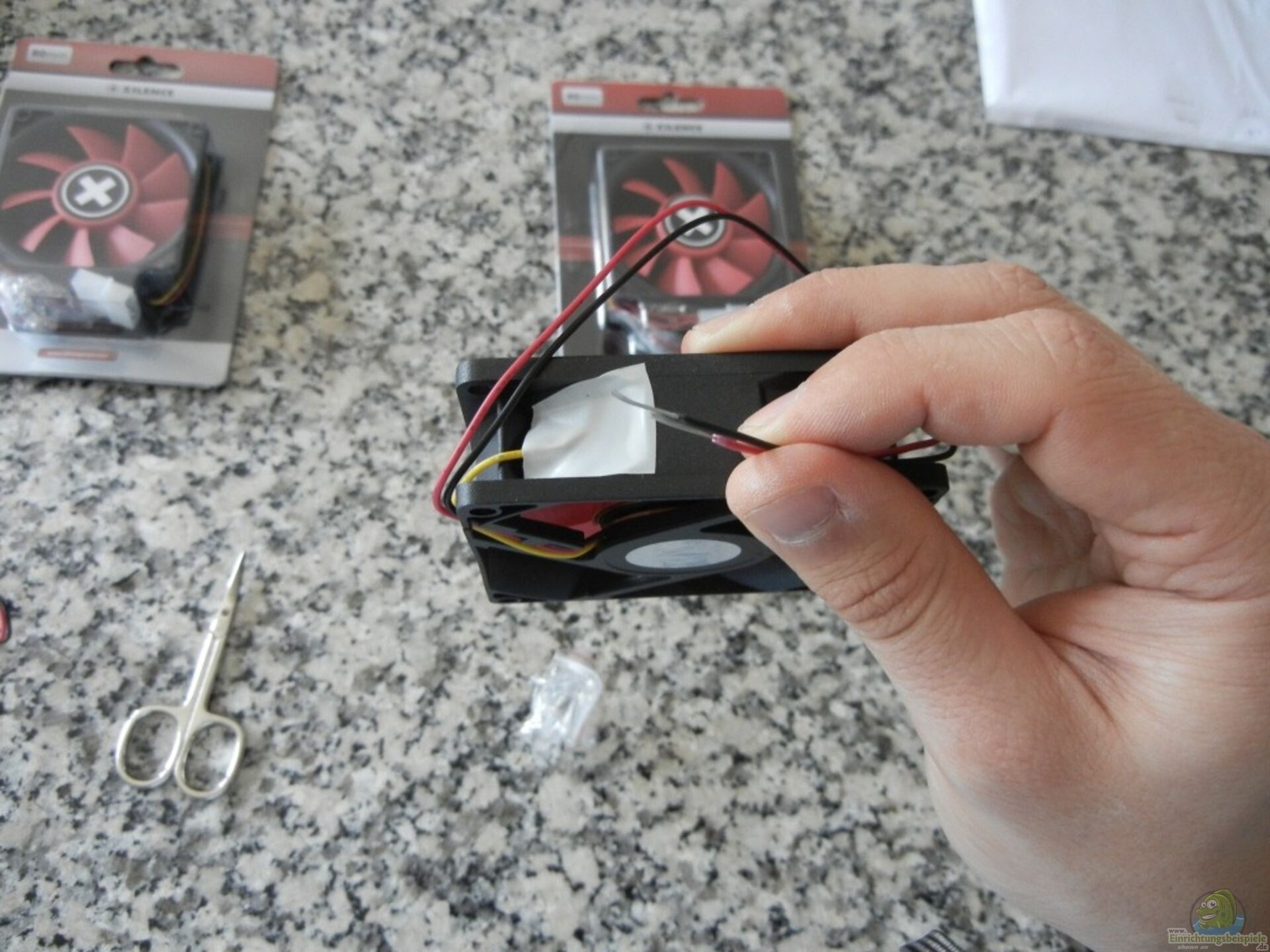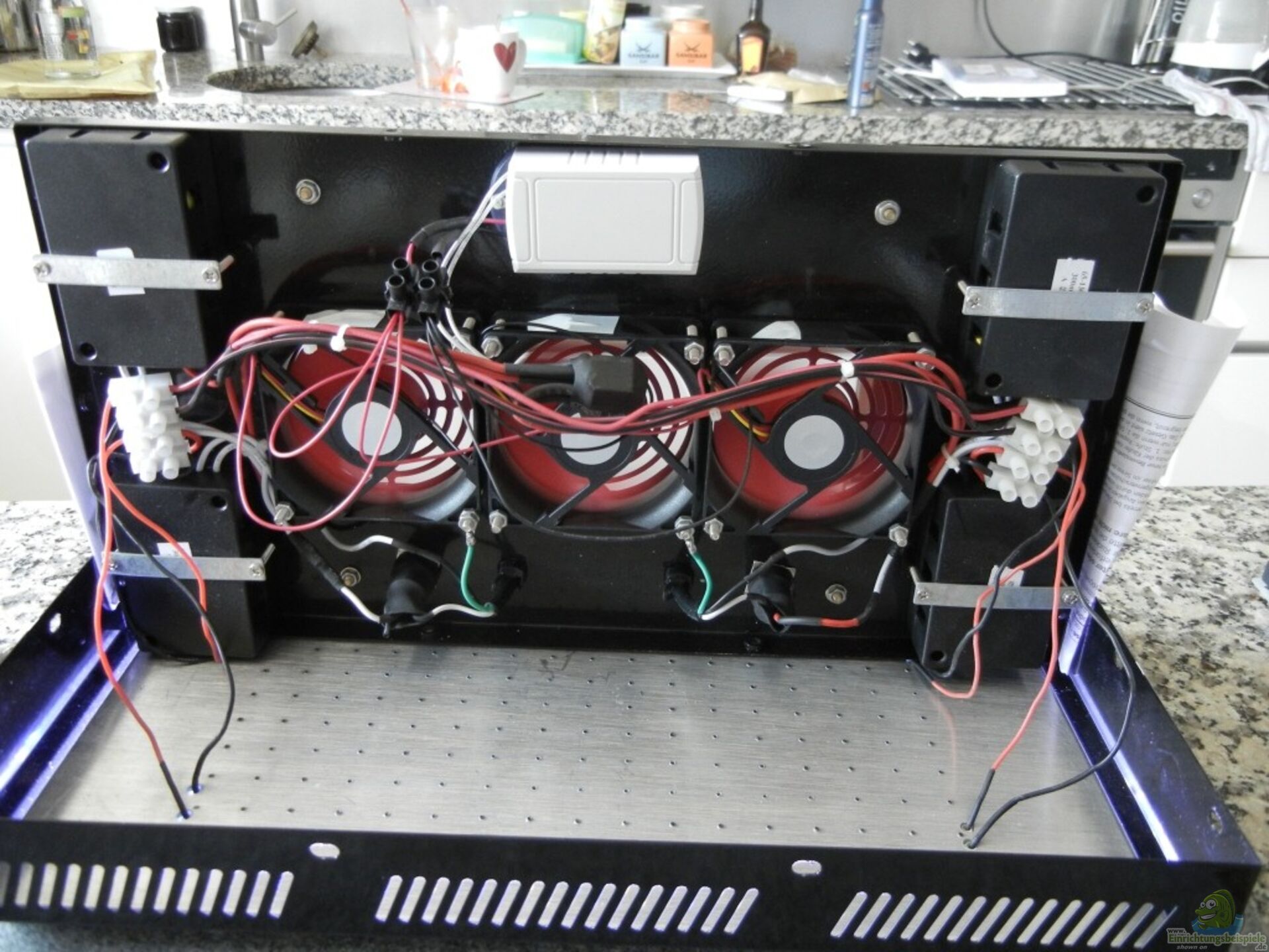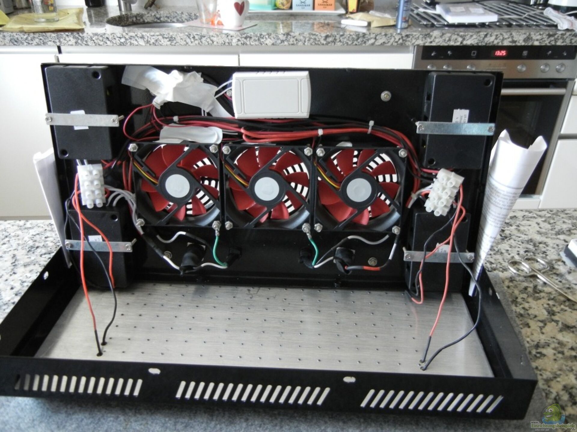 Habe ein paar Bilder vom Lüfterwechsel eingestellt. Ist eigentlich alles selbsterklärend und sehr einfach. Ich hatte keinen kleinen Lötkolben, sondern nur einen gro??en, so habe ich die Verbindungen mit Lüsterklemmen hergestellt und mit Stromdieben geht es auch noch. (Wer eine genaue Schritt für Schritt Anleitung möchte kann sich melden. Habe ca 15 min für alles benötigt bis diese wieder zusammengeschraubt lief.
