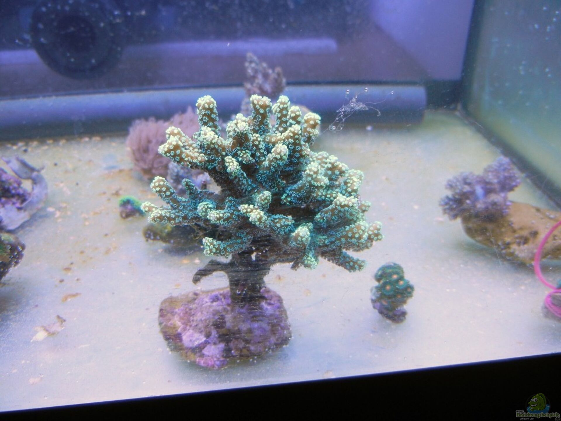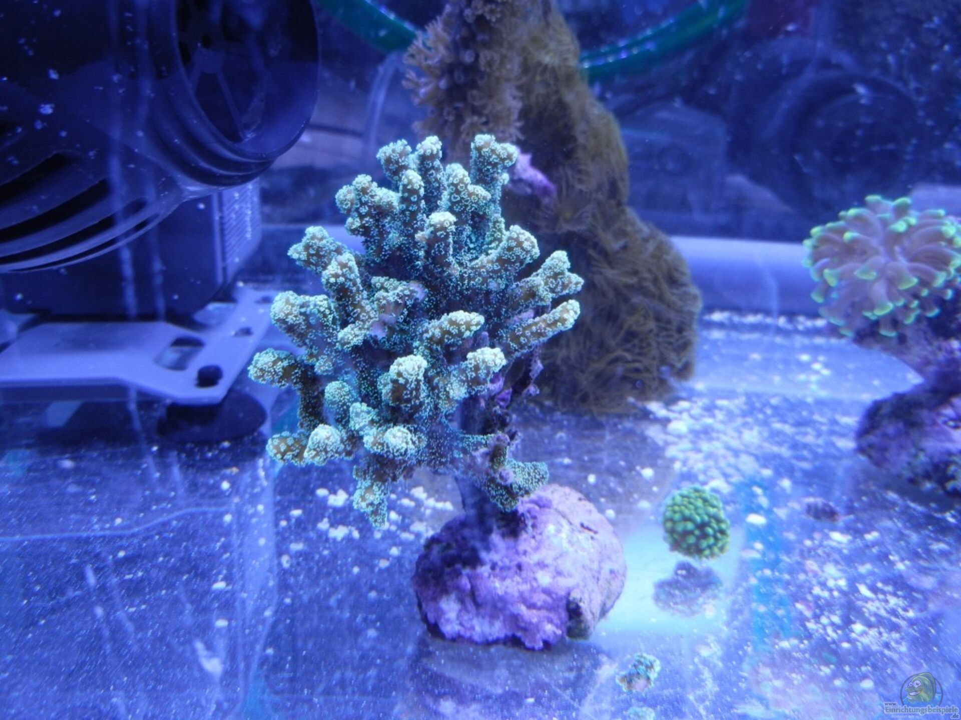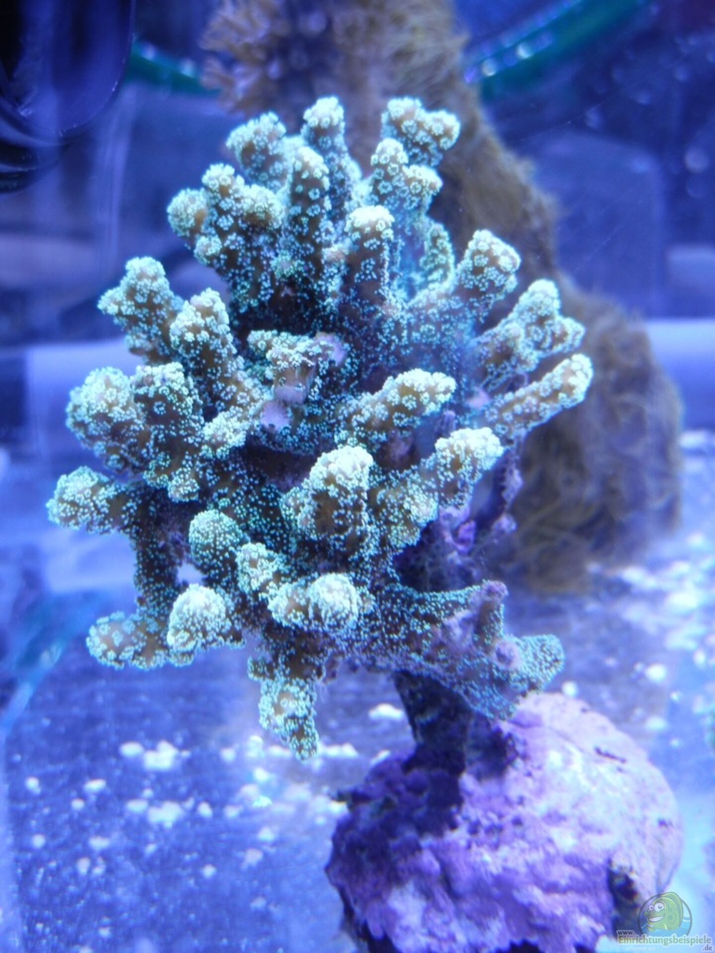 1. Die Seriatopora zeigt das beste Polypenbild und ist die einzige SPS im Ablegerbecken. Diese hat in den wenigen Tagen auffälig viele Wachstumsspitzen gebildet. Fast jeder Ast hat eine kleine helle rundförmige Aufhellung und nicht nur unter blaulicht leuchtet Sie extrem.