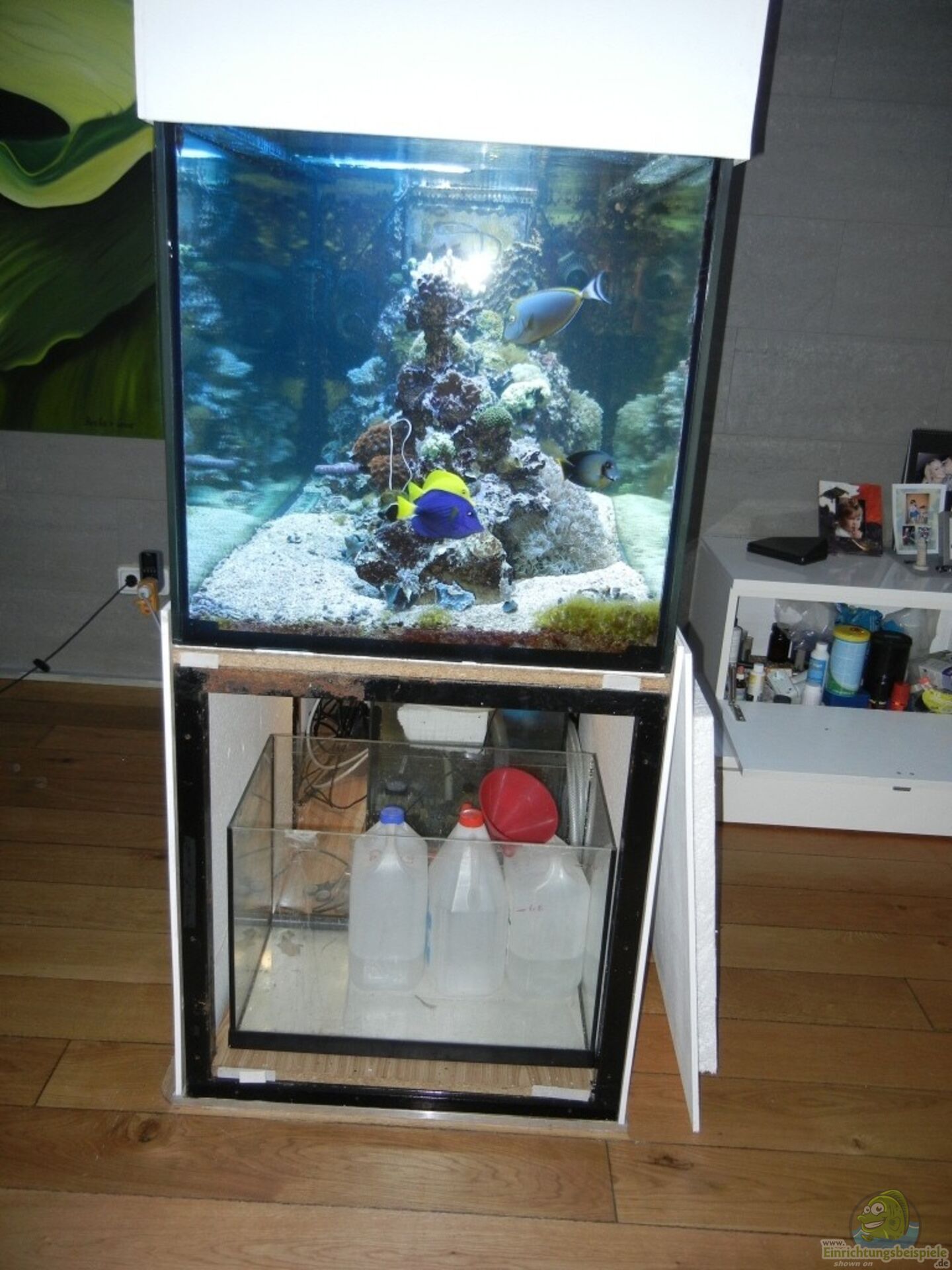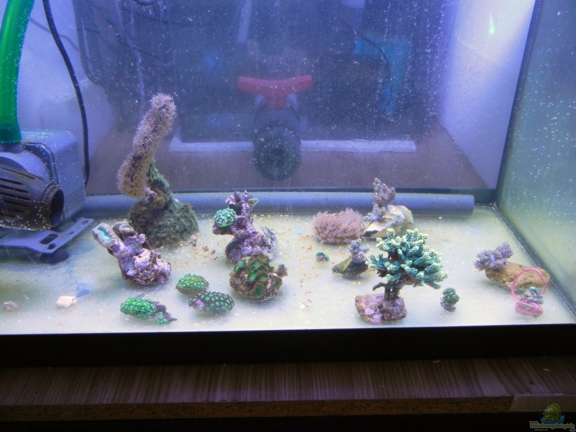 Nachdem ich das Wasser eingefüllt habe und die Lampe aufgehangen, habe ich sofort einige Ableger ins Testbecken gelegt. Unter anderem eine Euphyllia, Parazoanthus, eine Gorgonie, eine Ricordea Yuma neongrün, eine Capnella , eine caribaeorum, eine Protopalythoa und eine caliendrum.