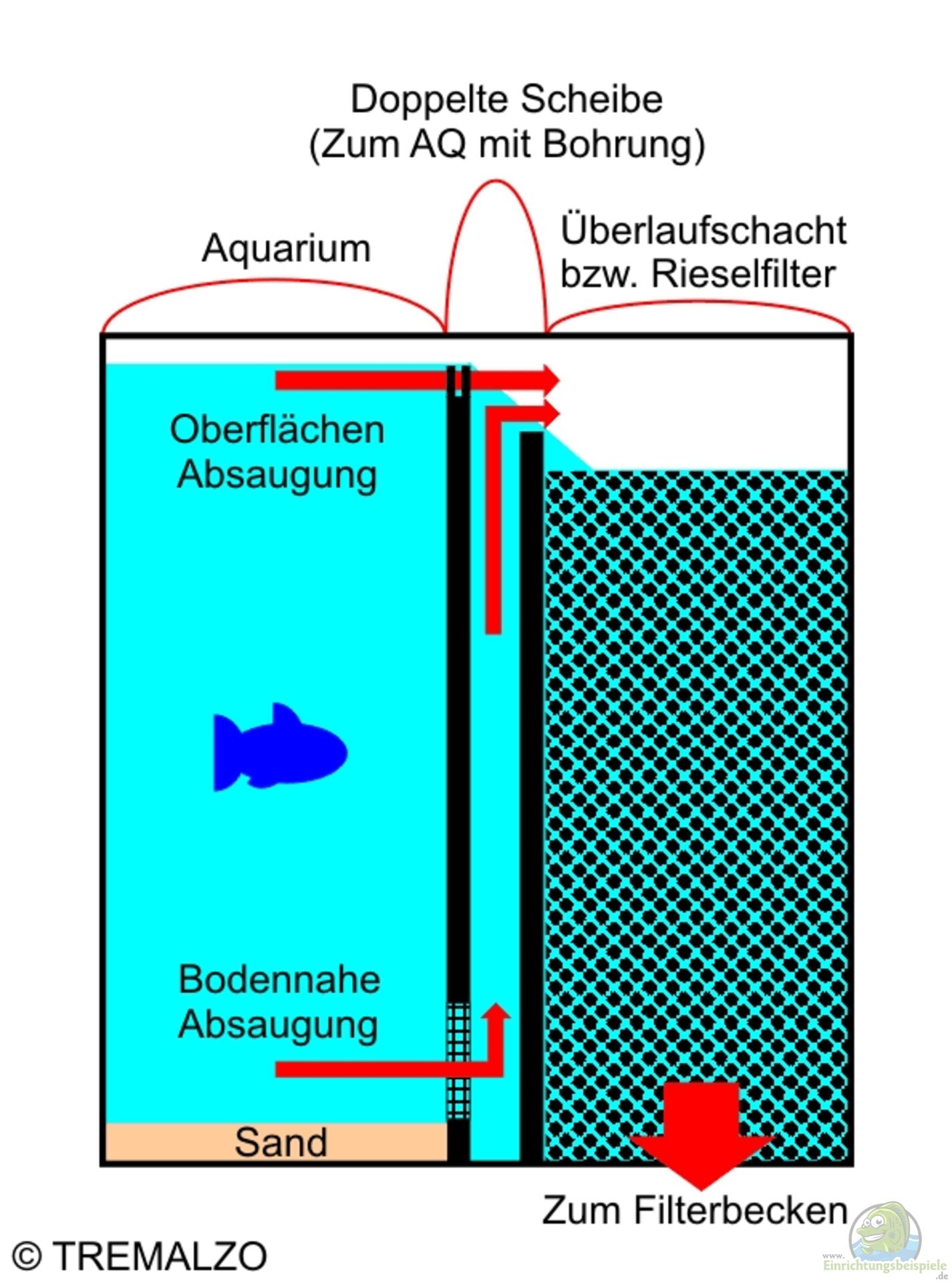 Die zweite Scheibe, zum Schacht, ist um wenige Millimeter niedriger als die ??u??ere und befindet sich in einem Abstand von nicht mehr als 10mm zu dieser. Die geringere Höhe und der damit verbundene niedrigere Wasserstand zwischen den Scheiben im Vergleich zu jenem im Aquarium bewirkt einen Unterdruck oder Sog und lässt dass Wasser durch die bodennahen Bohrungen hinauf bis in den Schacht strömen. Ungehindert dessen, flie??t das Oberflächenwasser durch den Kamm, über den Zwischenraum hinweg ebenfalls in den Schacht. Der Abstand zwischen den Trennscheiben sollte nicht zu gro?? gewählt werden, da sonst die innere Strömungsgeschwindigkeit abnehmen würde.