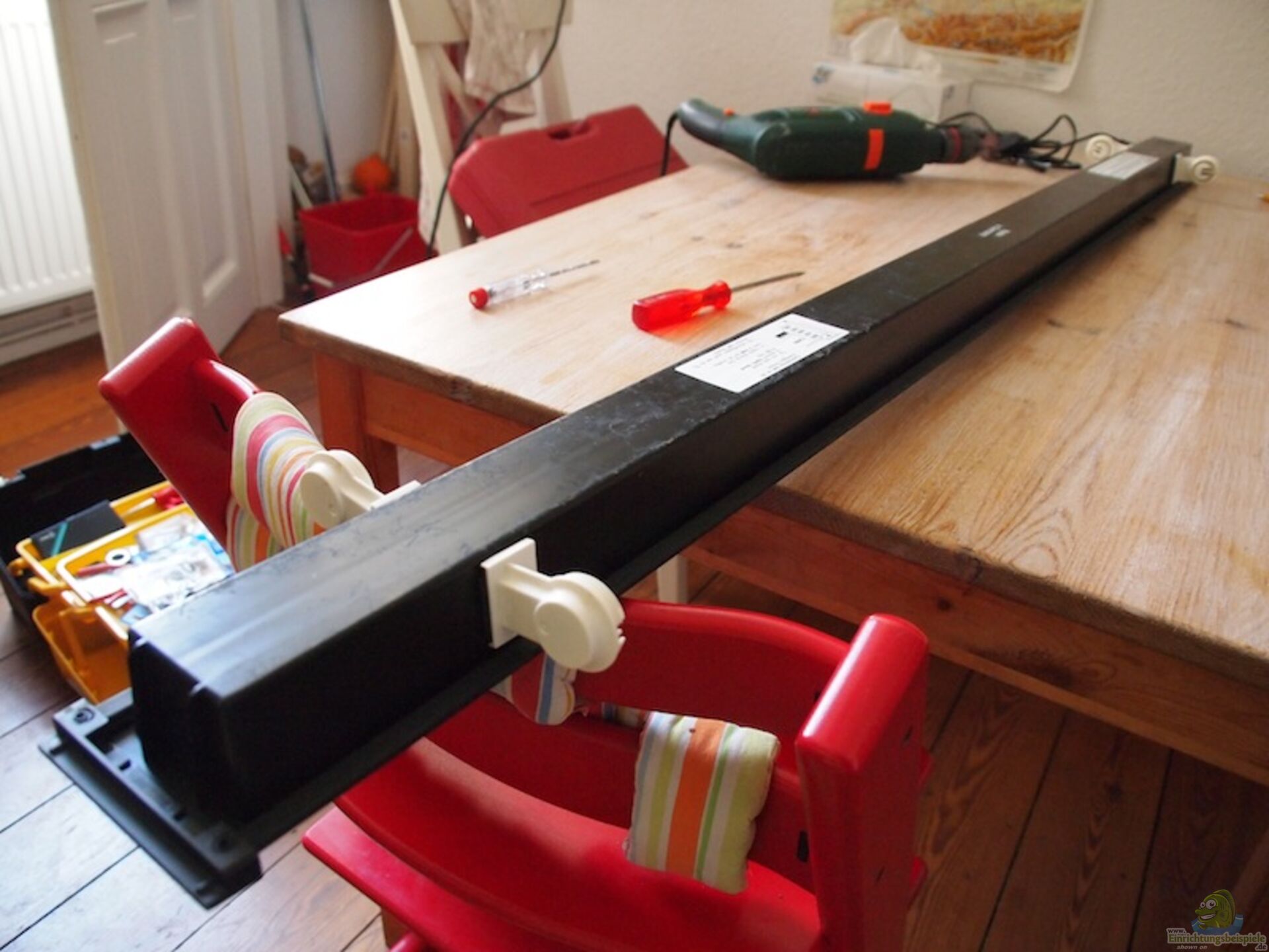 Au??erdem: Kein Platz mehr von oben, da alles mit Röhren zugebaut ist. Es reicht gerade mal noch zum Fische-Füttern, aber wenn man mal reingreifen muss, muss man einen Leuchtbalken herausnehmen! Meistens habe ich ihn einfach rückwärts auf die Abdeckung gelegt; trotzdem jedes Mal ein riesen Akt.
