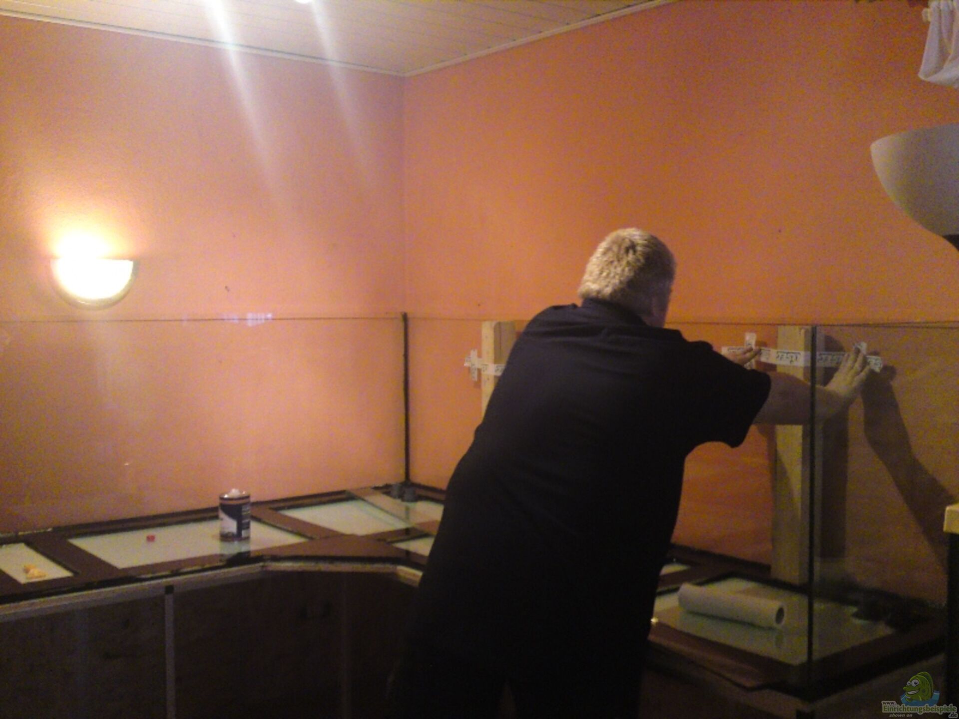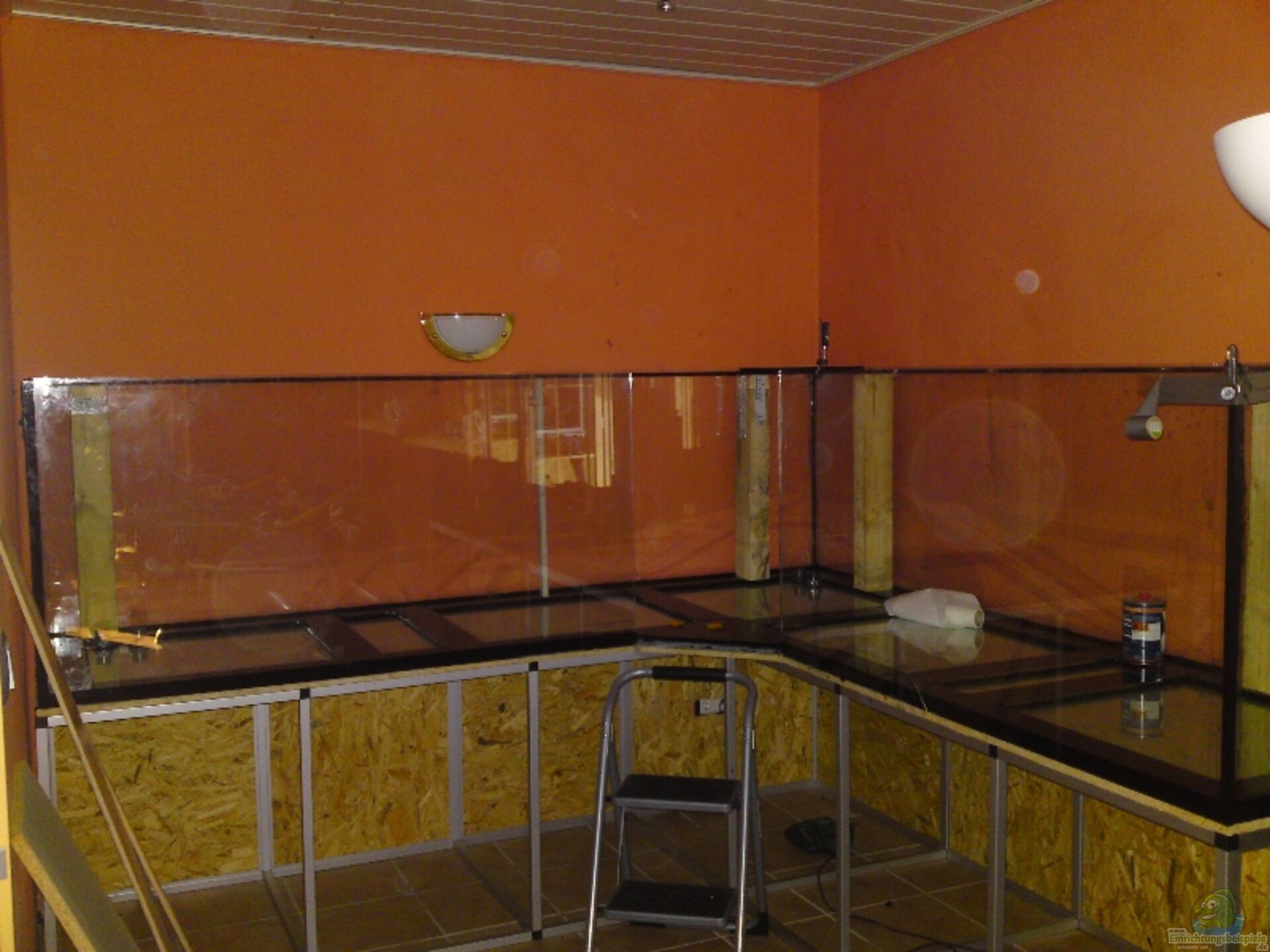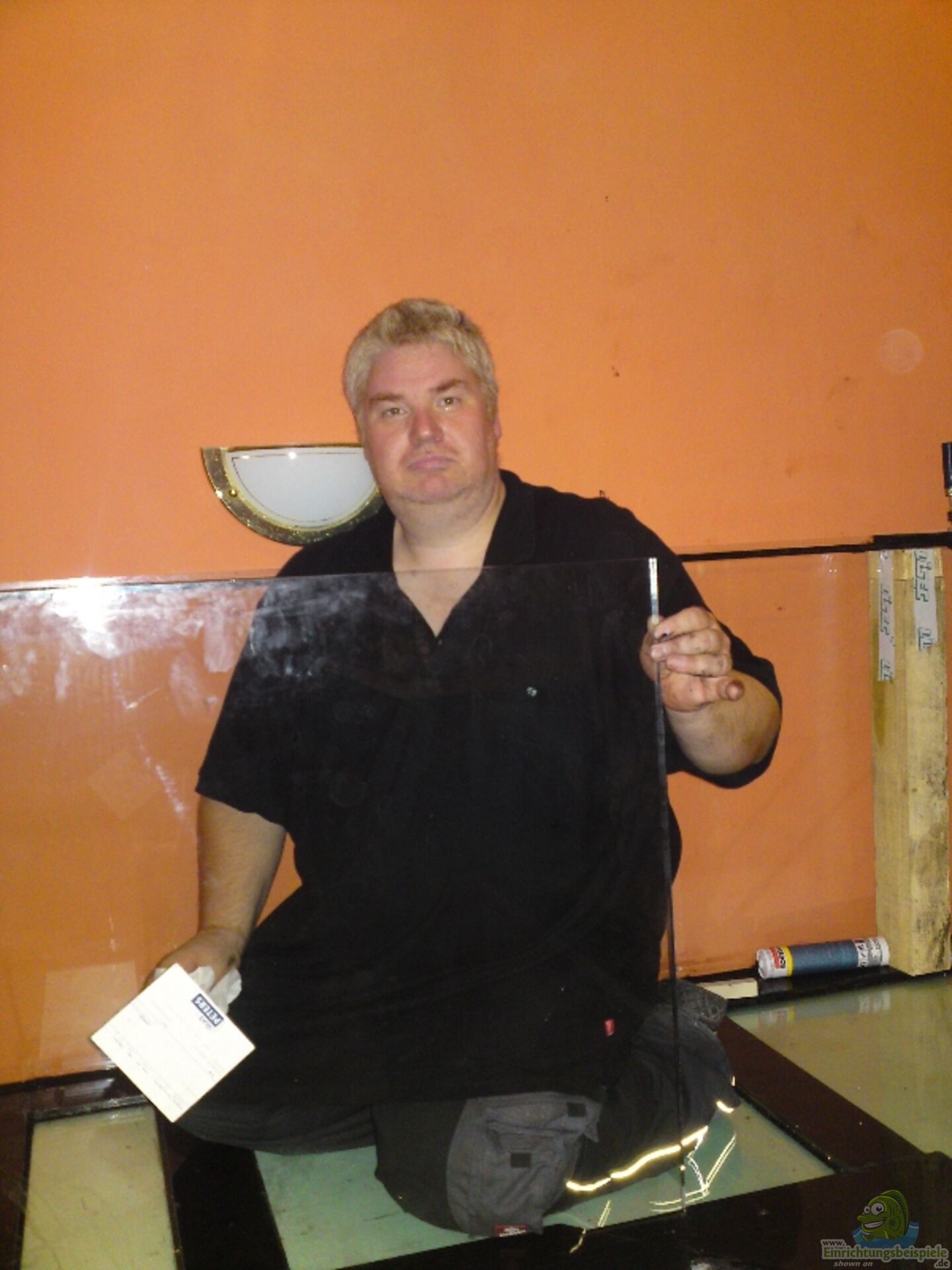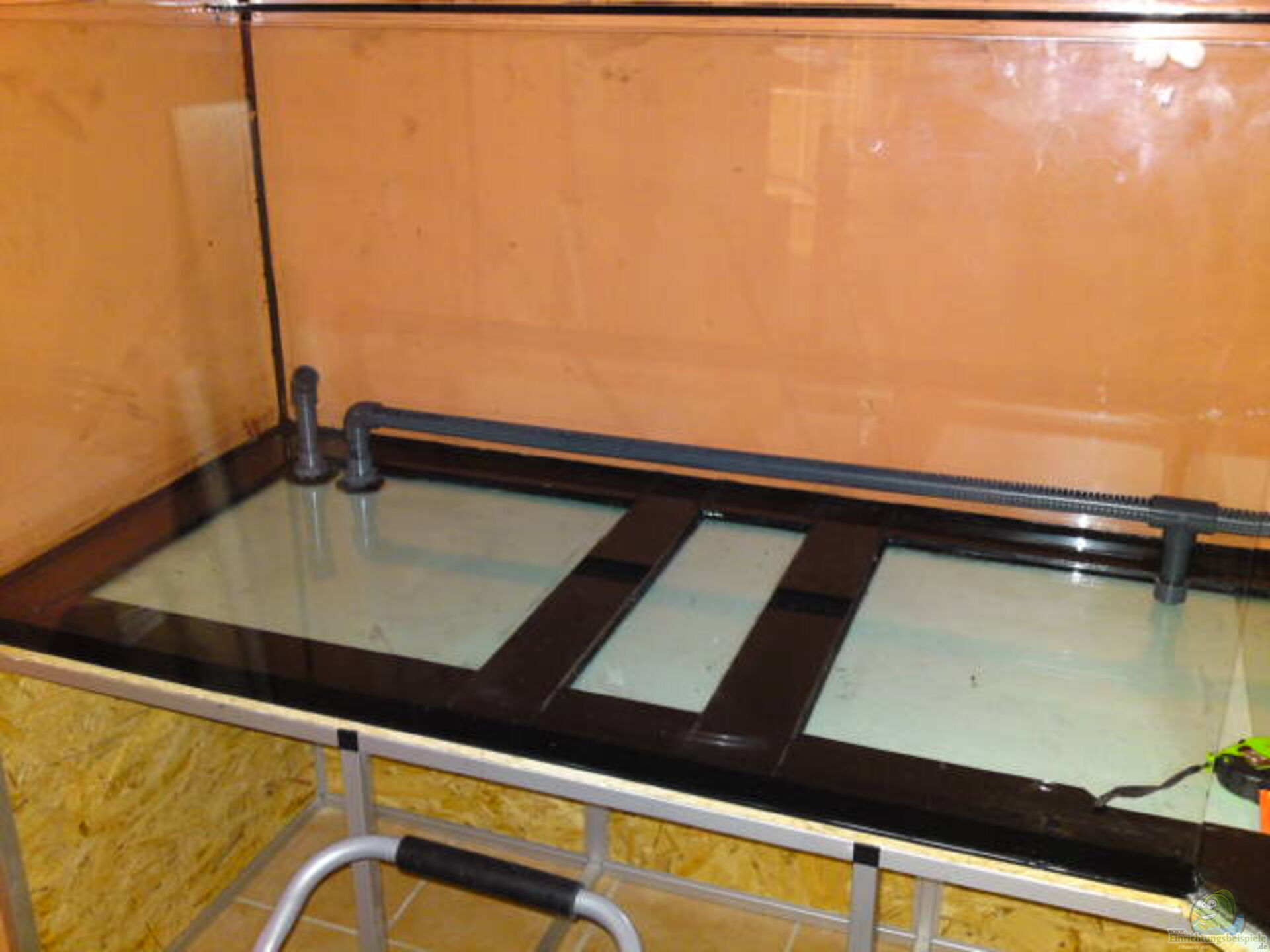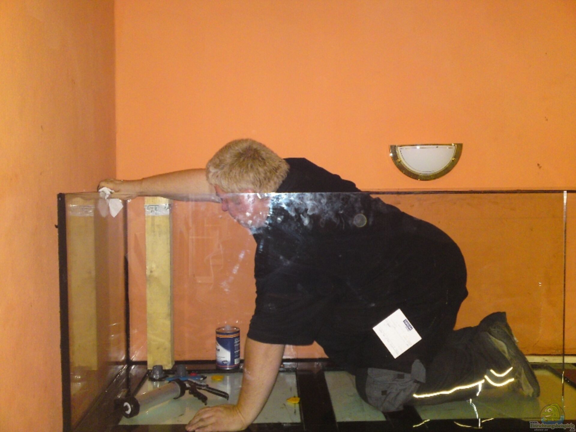 Das Einbringen der beiden hinteren Scheiben vor Ort war ein "echtes" Abenteuer, da zwischen Wand und Scheiben nur ca. 1, 5 cm Platz war, also auch kaum Platz für die Fingerchen. Damit die Scheiben beim Verkleben nicht hinter den Unterschrank fallen konnten, mussten dort zus. Hölzer hinter den Selbigen gestellt werden, die als Auflagen für die beiden langen Scheiben dienten. Die 2 Scheiben (immerhin 250 und 255cm lang, 75mm hoch, 12mm stark und auch recht schwer) wurden Unten vorher auf 24mm Breite mit Silikon eingestrichen und natürlich das Silikon für die Eckverbindung aufgetragen. Die beiden recht schweren Teile wurden dann unter Zurhilfenahme von Holzkeilen fest gegen die Bodenplatte gepresst. Die Sicherheitsnähte wurden danach gleich mit einem Spezialspachtel gezogen, diese sind jetzt ca. 14mm breit. Nach Antrocknen der hinteren Scheiben wurden dann die beiden seitlichen Scheiben eingeklebt und mit Klebeband gesichert. Dann wurde alles wieder mit Aceton gereinigt und die hinteren Längssteben wurden mit Hilfe von dicken Holzklötzen auf Höhe verklebt. In der hinteren Ecke wurde zus. noch ein Dreieck aus Glas auf die beiden Längssteege mit aufgebracht, sicher ist sicher. Danach wurden dann die beiden vorderen Scheiben verklebt. Die Schräge in der Mitte wurde noch weggelassen, damit man "halbwegs" vernünftig im Becken arbeiten konnte. Auch dort wurden erst die beiden Längsstreben eingeklebt, gefolgt von den 6 Querstreben. Die Schräge wurde erst ganz zum Schluss wulstverklebt und zus. mit einer Längsstrebe abgefangen. Ihr merkt es schon, es wurde Alles auf Sicherheit verklebt. Es mag ja jetzt Leute geben, die sagen: "Wie nur 12er Glas bei der Beckenhöhe ???", aber 12mm-Floatglas reicht noch aus für ein Beckenhöhe bis zu 75cm (nach Flachglasmarkenkreistabelle). Ganz wichtig beim Verkleben von Aquarienscheiben ist das vorherige Reinigen und Entfetten, am Besten mit Aceton, aber Achtung Aceton reizt sark die Haut und die Atemwege). Achso, Eins hätte ich fast vergessen: Die 32er PVC-Hochdruckrohre sind vor dem Verkleben der Schräge auch noch ins Becken eingebracht worden, da dies hinterher auch recht schwierig gewesen wäre. Die langen Ansaugrohre wurden alle mit der Flex von Hand geschlitzt. Die Düsen für den Wasseraustritt und die 40er Kugelhähne (Kugelhähne und Ventile immer eine Nummer grösser wählen, als der Rohrdurchmesser, damit der Wasserduchfluss nicht verengt wird !!!) stammen wieder von der Fa. MarineSystems. Auch die Rohre müssen übrigens vor dem Verkleben mit PVC-Kleber mit Aceton angelöst und gereinigt werden.