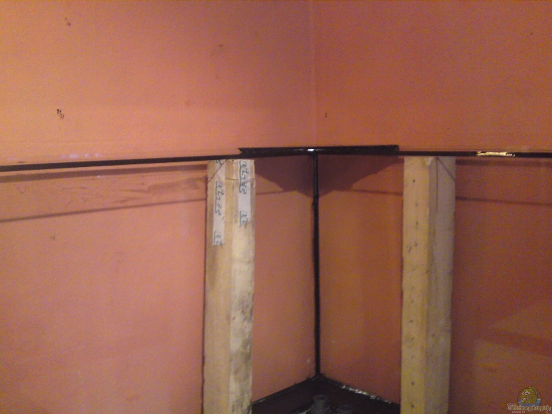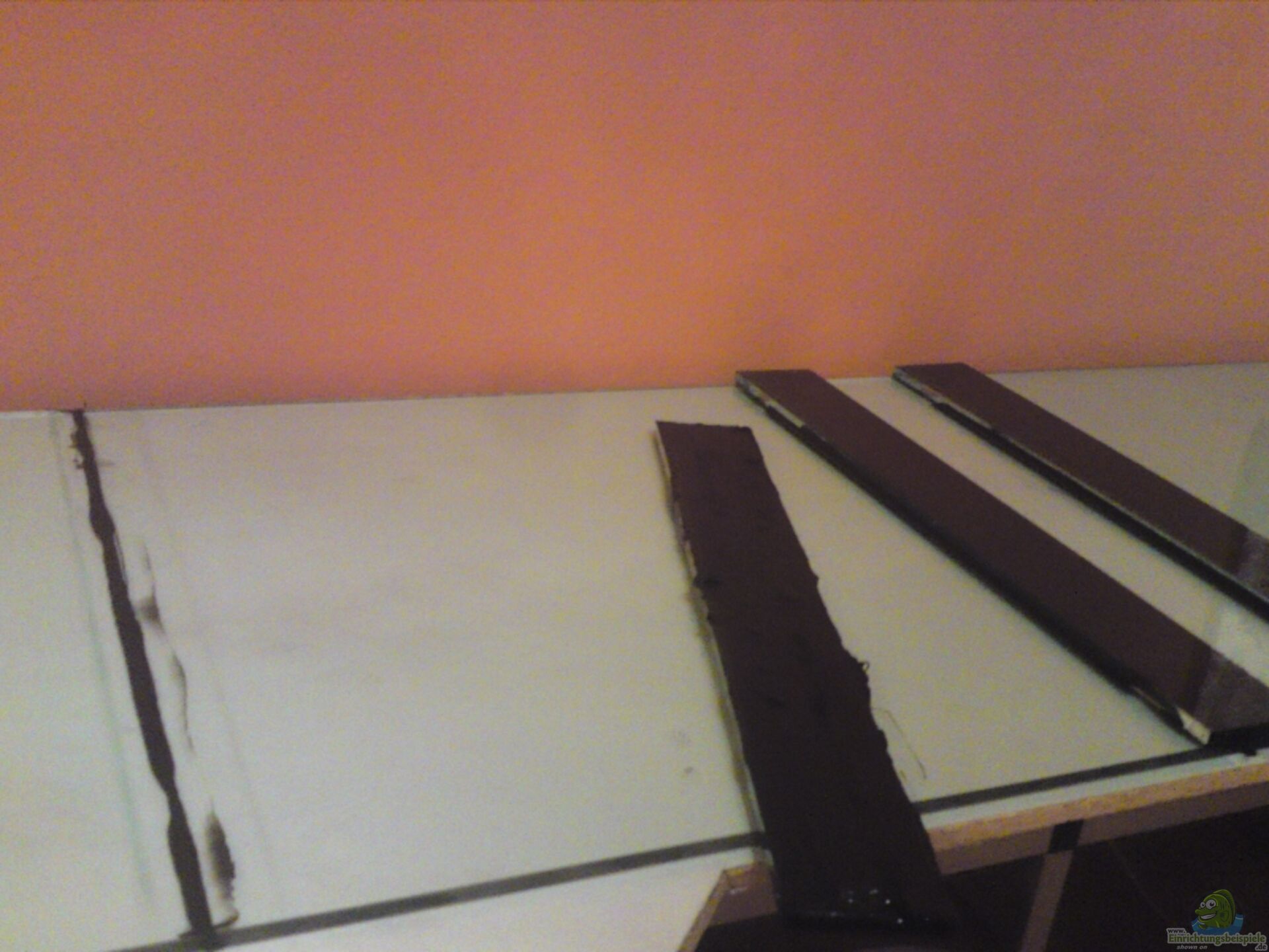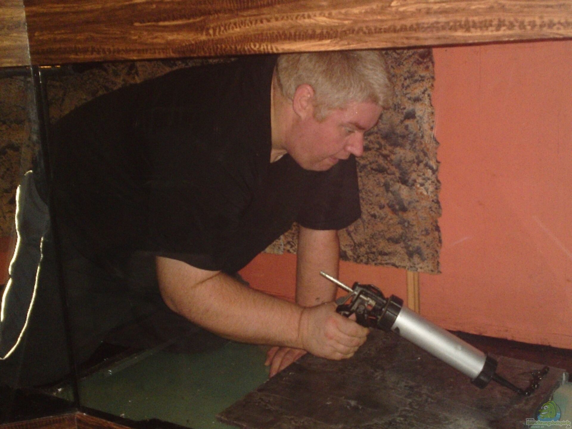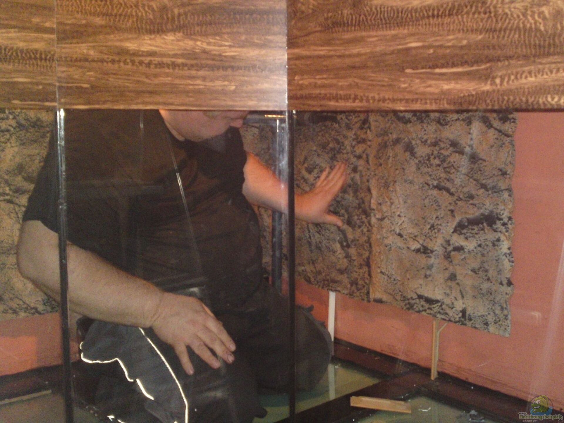 Das Einbringen der beiden hinteren Scheiben vor Ort war ein "echtes" Abenteuer, da zwischen Wand und Scheiben nur ca. 1, 5 cm Platz war, also auch kaum Platz für die Fingerchen. Damit die Scheiben beim Verkleben nicht hinter den Unterschrank fallen konnten, mussten dort zus. Hölzer hinter den Selbigen gestellt werden, die als Auflagen für die beiden langen Scheiben dienten. Die 2 Scheiben (immerhin 250 und 255cm lang, 75mm hoch, 12mm stark und auch recht schwer) wurden Unten vorher auf 24mm Breite mit Silikon eingestrichen und natürlich das Silikon für die Eckverbindung aufgetragen. Die beiden recht schweren Teile wurden dann unter Zurhilfenahme von Holzkeilen fest gegen die Bodenplatte gepresst. Die Sicherheitsnähte wurden danach gleich mit einem Spezialspachtel gezogen, diese sind jetzt ca. 14mm breit. Nach Antrocknen der hinteren Scheiben wurden dann die beiden seitlichen Scheiben eingeklebt und mit Klebeband gesichert. Dann wurde alles wieder mit Aceton gereinigt und die hinteren Längssteben wurden mit Hilfe von dicken Holzklötzen auf Höhe verklebt. In der hinteren Ecke wurde zus. noch ein Dreieck aus Glas auf die beiden Längssteege mit aufgebracht, sicher ist sicher. Danach wurden dann die beiden vorderen Scheiben verklebt. Die Schräge in der Mitte wurde noch weggelassen, damit man "halbwegs" vernünftig im Becken arbeiten konnte. Auch dort wurden erst die beiden Längsstreben eingeklebt, gefolgt von den 6 Querstreben. Die Schräge wurde erst ganz zum Schluss wulstverklebt und zus. mit einer Längsstrebe abgefangen. Ihr merkt es schon, es wurde Alles auf Sicherheit verklebt. Es mag ja jetzt Leute geben, die sagen: "Wie nur 12er Glas bei der Beckenhöhe ???", aber 12mm-Floatglas reicht noch aus für ein Beckenhöhe bis zu 75cm (nach Flachglasmarkenkreistabelle). Ganz wichtig beim Verkleben von Aquarienscheiben ist das vorherige Reinigen und Entfetten, am Besten mit Aceton, aber Achtung Aceton reizt sark die Haut und die Atemwege). Achso, Eins hätte ich fast vergessen: Die 32er PVC-Hochdruckrohre sind vor dem Verkleben der Schräge auch noch ins Becken eingebracht worden, da dies hinterher auch recht schwierig gewesen wäre. Die langen Ansaugrohre wurden alle mit der Flex von Hand geschlitzt. Die Düsen für den Wasseraustritt und die 40er Kugelhähne (Kugelhähne und Ventile immer eine Nummer grösser wählen, als der Rohrdurchmesser, damit der Wasserduchfluss nicht verengt wird !!!) stammen wieder von der Fa. MarineSystems. Auch die Rohre müssen übrigens vor dem Verkleben mit PVC-Kleber mit Aceton angelöst und gereinigt werden.
