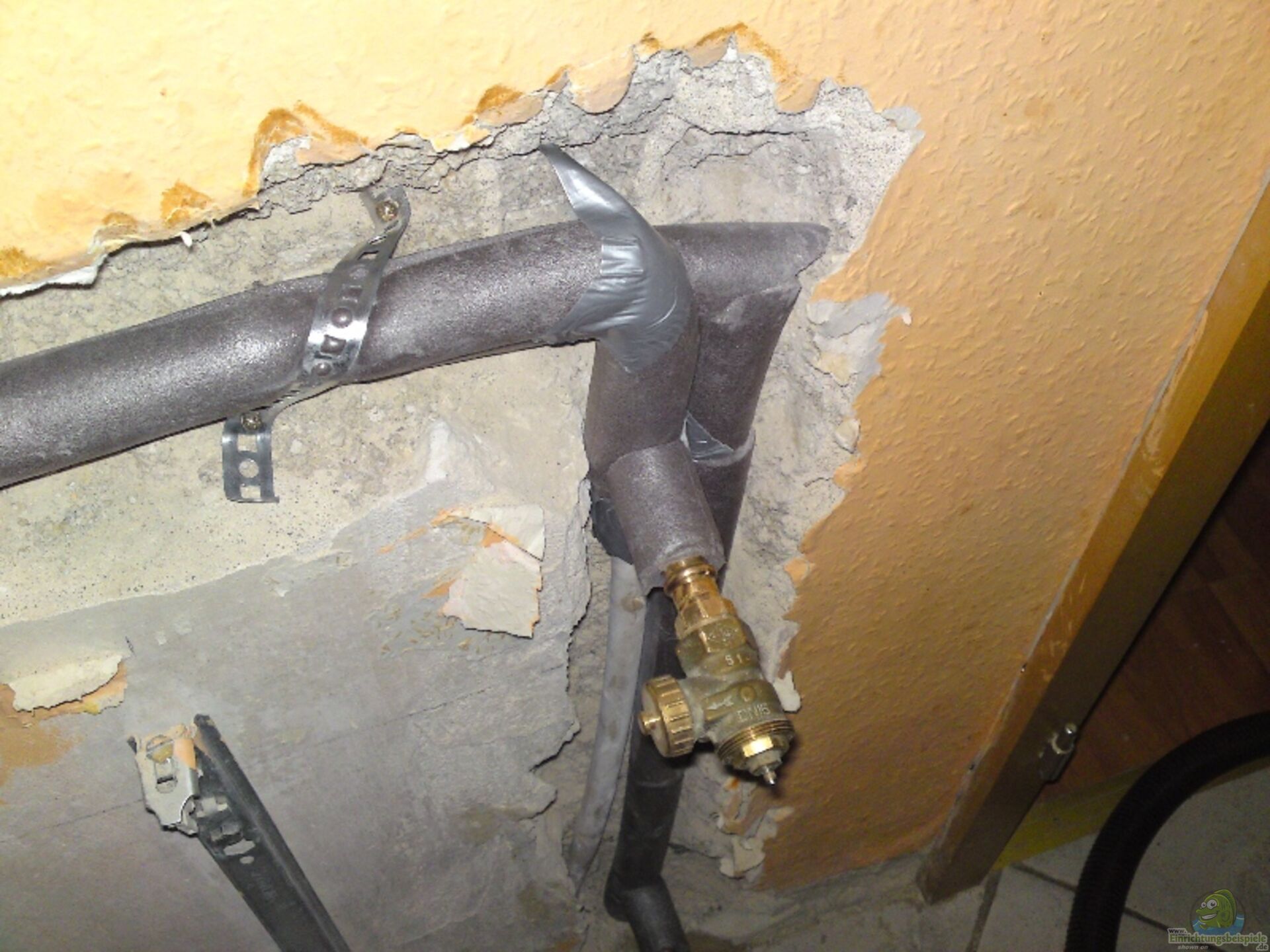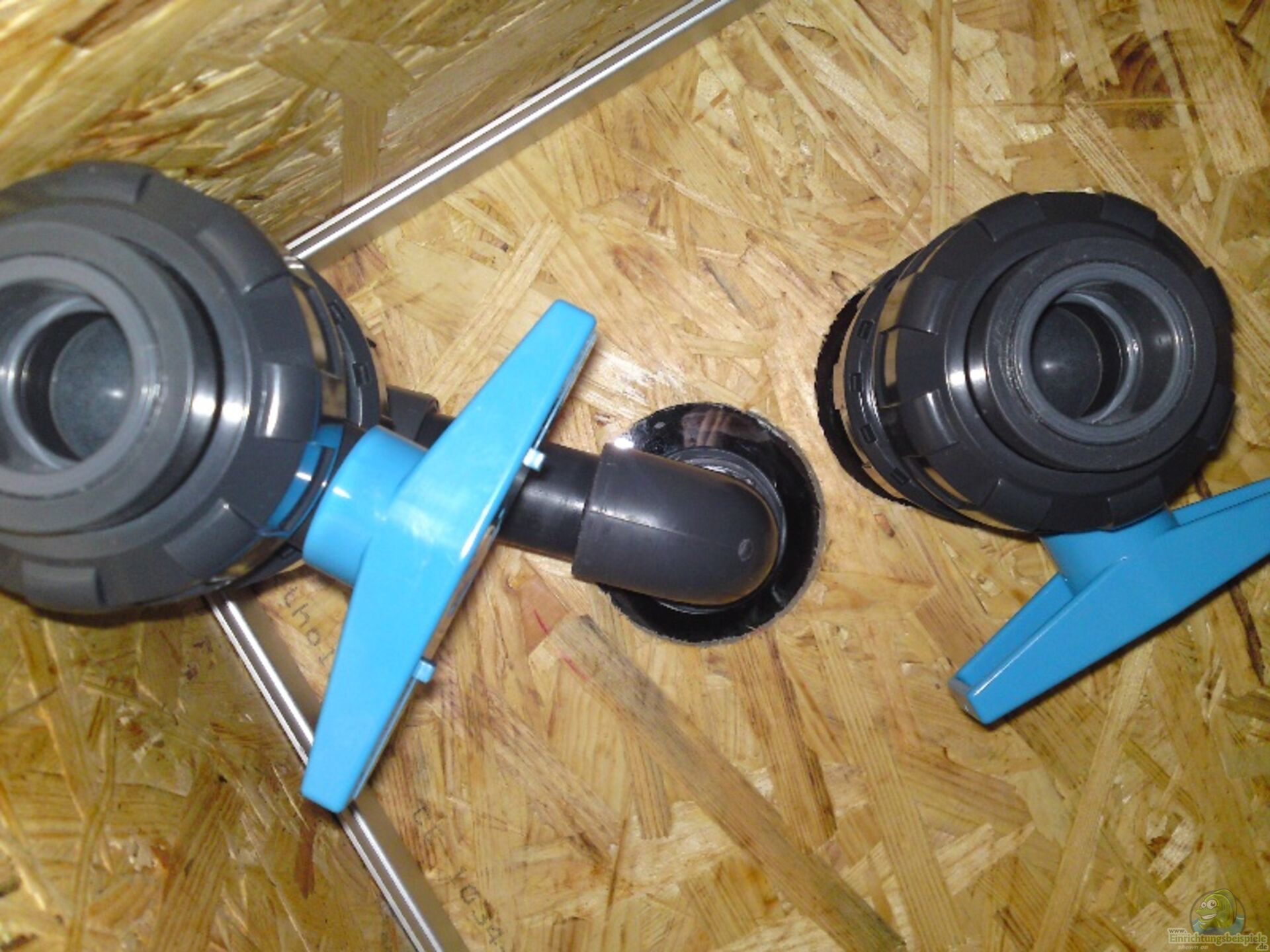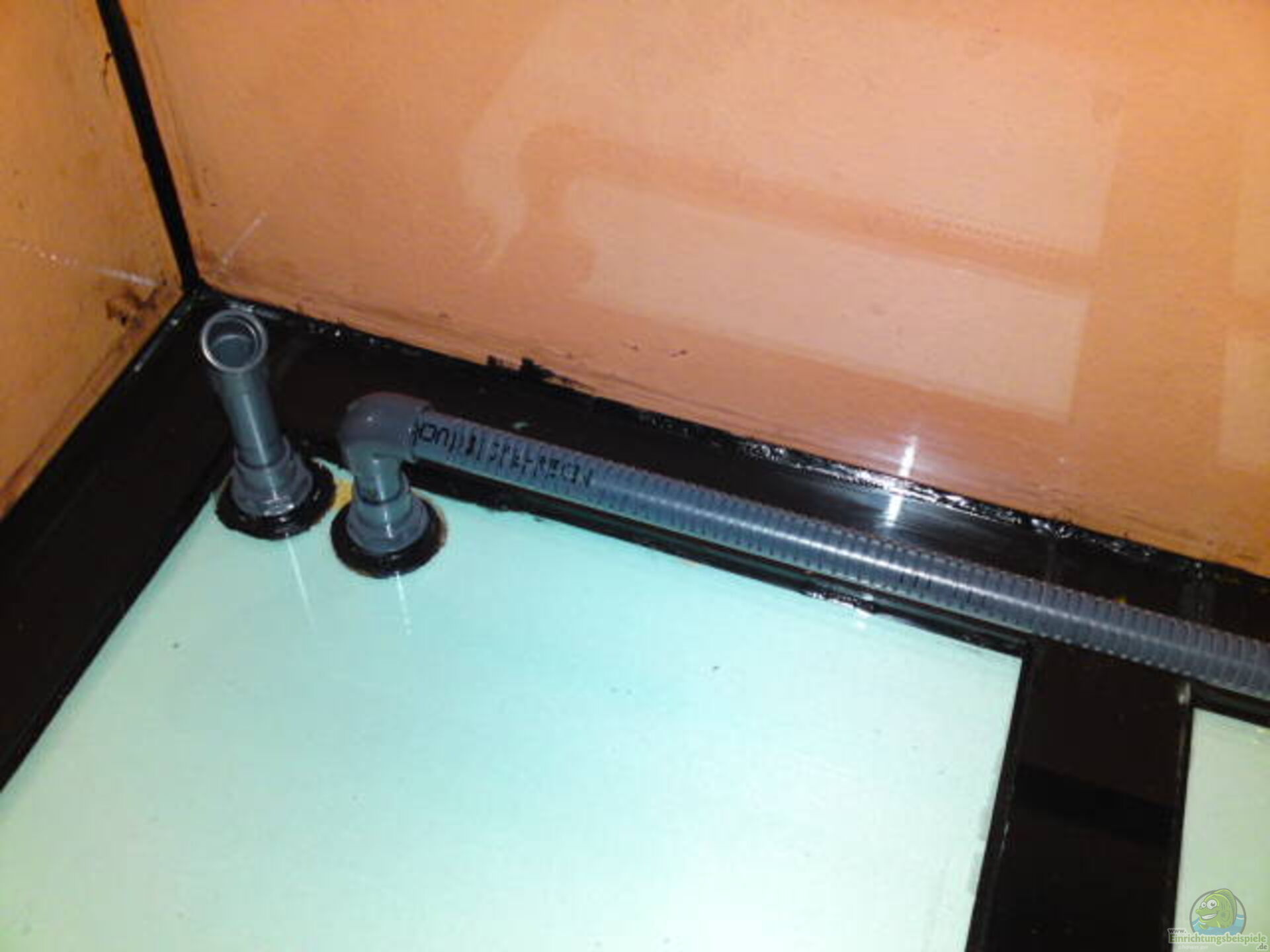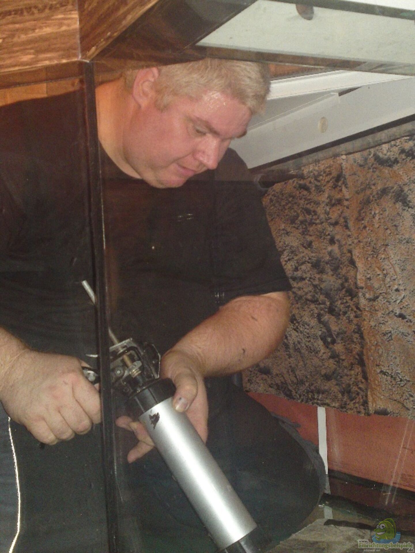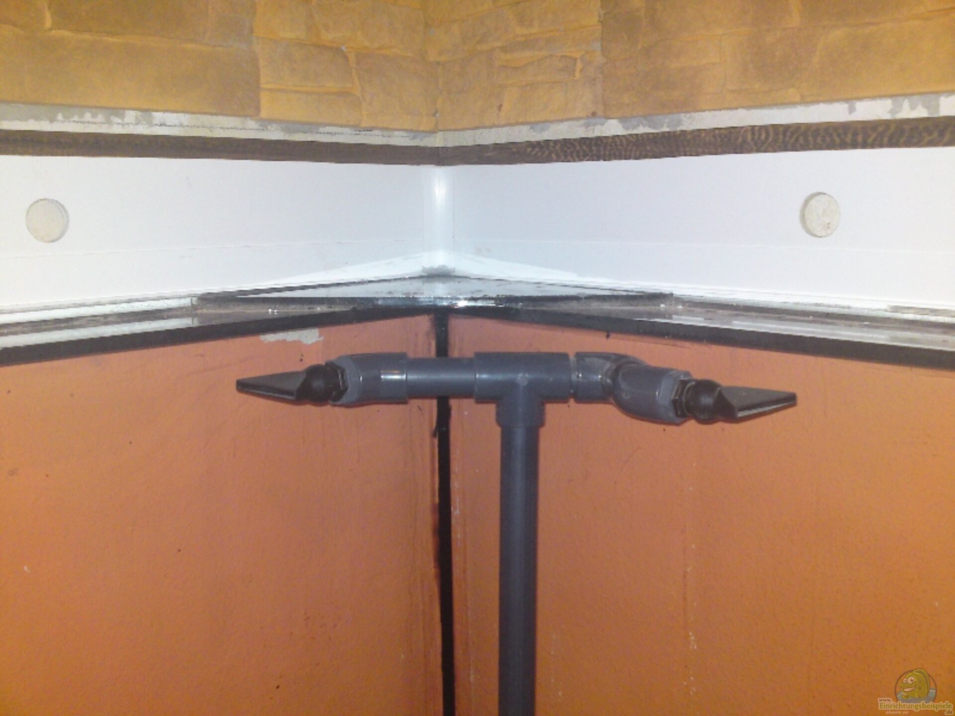 Das Einbringen der beiden hinteren Scheiben vor Ort war ein "echtes" Abenteuer, da zwischen Wand und Scheiben nur ca. 1, 5 cm Platz war, also auch kaum Platz für die Fingerchen. Damit die Scheiben beim Verkleben nicht hinter den Unterschrank fallen konnten, mussten dort zus. Hölzer hinter den Selbigen gestellt werden, die als Auflagen für die beiden langen Scheiben dienten. Die 2 Scheiben (immerhin 250 und 255cm lang, 75mm hoch, 12mm stark und auch recht schwer) wurden Unten vorher auf 24mm Breite mit Silikon eingestrichen und natürlich das Silikon für die Eckverbindung aufgetragen. Die beiden recht schweren Teile wurden dann unter Zurhilfenahme von Holzkeilen fest gegen die Bodenplatte gepresst. Die Sicherheitsnähte wurden danach gleich mit einem Spezialspachtel gezogen, diese sind jetzt ca. 14mm breit. Nach Antrocknen der hinteren Scheiben wurden dann die beiden seitlichen Scheiben eingeklebt und mit Klebeband gesichert. Dann wurde alles wieder mit Aceton gereinigt und die hinteren Längssteben wurden mit Hilfe von dicken Holzklötzen auf Höhe verklebt. In der hinteren Ecke wurde zus. noch ein Dreieck aus Glas auf die beiden Längssteege mit aufgebracht, sicher ist sicher. Danach wurden dann die beiden vorderen Scheiben verklebt. Die Schräge in der Mitte wurde noch weggelassen, damit man "halbwegs" vernünftig im Becken arbeiten konnte. Auch dort wurden erst die beiden Längsstreben eingeklebt, gefolgt von den 6 Querstreben. Die Schräge wurde erst ganz zum Schluss wulstverklebt und zus. mit einer Längsstrebe abgefangen. Ihr merkt es schon, es wurde Alles auf Sicherheit verklebt. Es mag ja jetzt Leute geben, die sagen: "Wie nur 12er Glas bei der Beckenhöhe ???", aber 12mm-Floatglas reicht noch aus für ein Beckenhöhe bis zu 75cm (nach Flachglasmarkenkreistabelle). Ganz wichtig beim Verkleben von Aquarienscheiben ist das vorherige Reinigen und Entfetten, am Besten mit Aceton, aber Achtung Aceton reizt sark die Haut und die Atemwege). Achso, Eins hätte ich fast vergessen: Die 32er PVC-Hochdruckrohre sind vor dem Verkleben der Schräge auch noch ins Becken eingebracht worden, da dies hinterher auch recht schwierig gewesen wäre. Die langen Ansaugrohre wurden alle mit der Flex von Hand geschlitzt. Die Düsen für den Wasseraustritt und die 40er Kugelhähne (Kugelhähne und Ventile immer eine Nummer grösser wählen, als der Rohrdurchmesser, damit der Wasserduchfluss nicht verengt wird !!!) stammen wieder von der Fa. MarineSystems. Auch die Rohre müssen übrigens vor dem Verkleben mit PVC-Kleber mit Aceton angelöst und gereinigt werden.