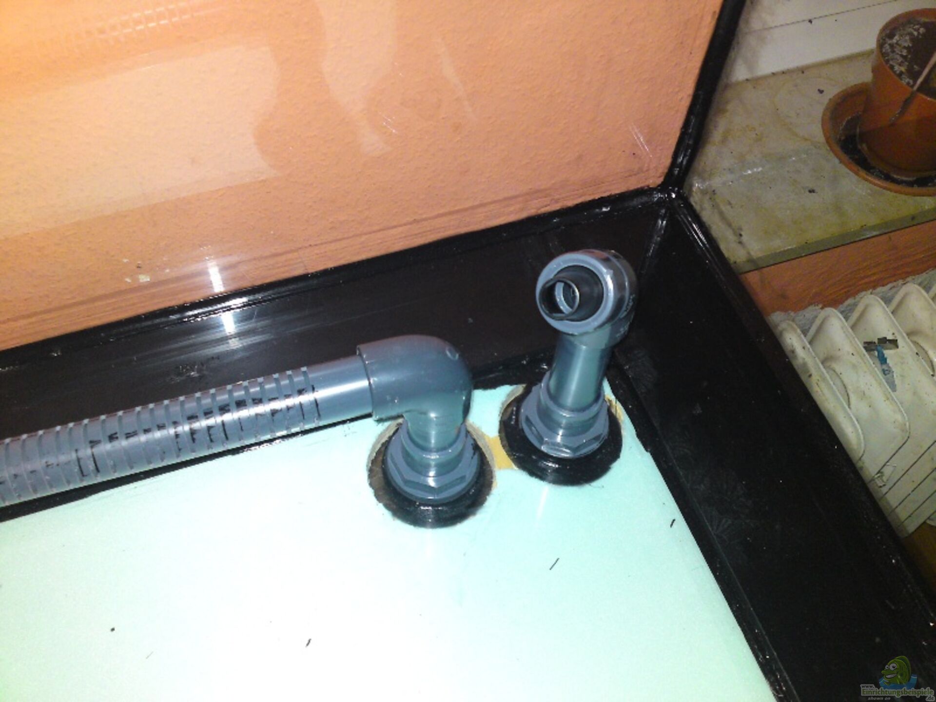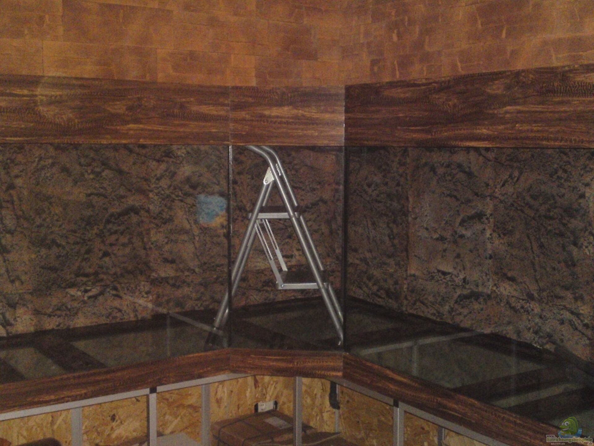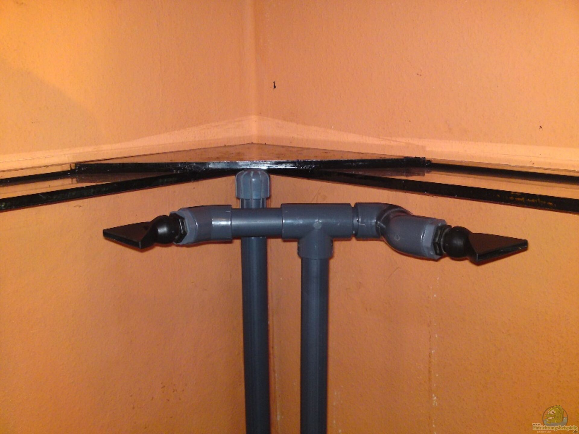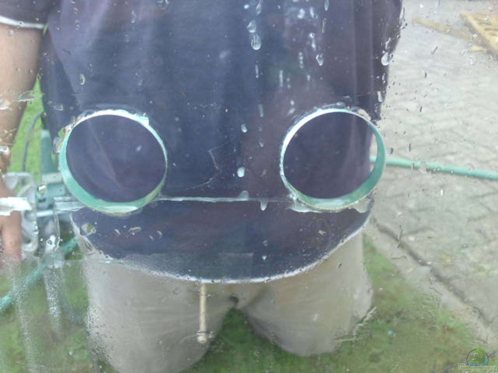 Das Einbringen der beiden hinteren Scheiben vor Ort war ein "echtes" Abenteuer, da zwischen Wand und Scheiben nur ca. 1, 5 cm Platz war, also auch kaum Platz für die Fingerchen. Damit die Scheiben beim Verkleben nicht hinter den Unterschrank fallen konnten, mussten dort zus. Hölzer hinter den Selbigen gestellt werden, die als Auflagen für die beiden langen Scheiben dienten. Die 2 Scheiben (immerhin 250 und 255cm lang, 75mm hoch, 12mm stark und auch recht schwer) wurden Unten vorher auf 24mm Breite mit Silikon eingestrichen und natürlich das Silikon für die Eckverbindung aufgetragen. Die beiden recht schweren Teile wurden dann unter Zurhilfenahme von Holzkeilen fest gegen die Bodenplatte gepresst. Die Sicherheitsnähte wurden danach gleich mit einem Spezialspachtel gezogen, diese sind jetzt ca. 14mm breit. Nach Antrocknen der hinteren Scheiben wurden dann die beiden seitlichen Scheiben eingeklebt und mit Klebeband gesichert. Dann wurde alles wieder mit Aceton gereinigt und die hinteren Längssteben wurden mit Hilfe von dicken Holzklötzen auf Höhe verklebt. In der hinteren Ecke wurde zus. noch ein Dreieck aus Glas auf die beiden Längssteege mit aufgebracht, sicher ist sicher. Danach wurden dann die beiden vorderen Scheiben verklebt. Die Schräge in der Mitte wurde noch weggelassen, damit man "halbwegs" vernünftig im Becken arbeiten konnte. Auch dort wurden erst die beiden Längsstreben eingeklebt, gefolgt von den 6 Querstreben. Die Schräge wurde erst ganz zum Schluss wulstverklebt und zus. mit einer Längsstrebe abgefangen. Ihr merkt es schon, es wurde Alles auf Sicherheit verklebt. Es mag ja jetzt Leute geben, die sagen: "Wie nur 12er Glas bei der Beckenhöhe ???", aber 12mm-Floatglas reicht noch aus für ein Beckenhöhe bis zu 75cm (nach Flachglasmarkenkreistabelle). Ganz wichtig beim Verkleben von Aquarienscheiben ist das vorherige Reinigen und Entfetten, am Besten mit Aceton, aber Achtung Aceton reizt sark die Haut und die Atemwege). Achso, Eins hätte ich fast vergessen: Die 32er PVC-Hochdruckrohre sind vor dem Verkleben der Schräge auch noch ins Becken eingebracht worden, da dies hinterher auch recht schwierig gewesen wäre. Die langen Ansaugrohre wurden alle mit der Flex von Hand geschlitzt. Die Düsen für den Wasseraustritt und die 40er Kugelhähne (Kugelhähne und Ventile immer eine Nummer grösser wählen, als der Rohrdurchmesser, damit der Wasserduchfluss nicht verengt wird !!!) stammen wieder von der Fa. MarineSystems. Auch die Rohre müssen übrigens vor dem Verkleben mit PVC-Kleber mit Aceton angelöst und gereinigt werden.