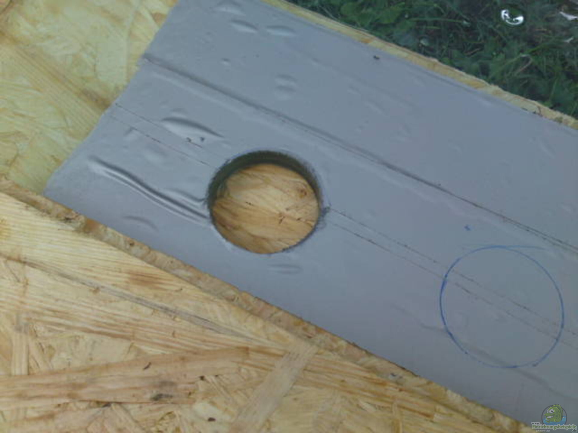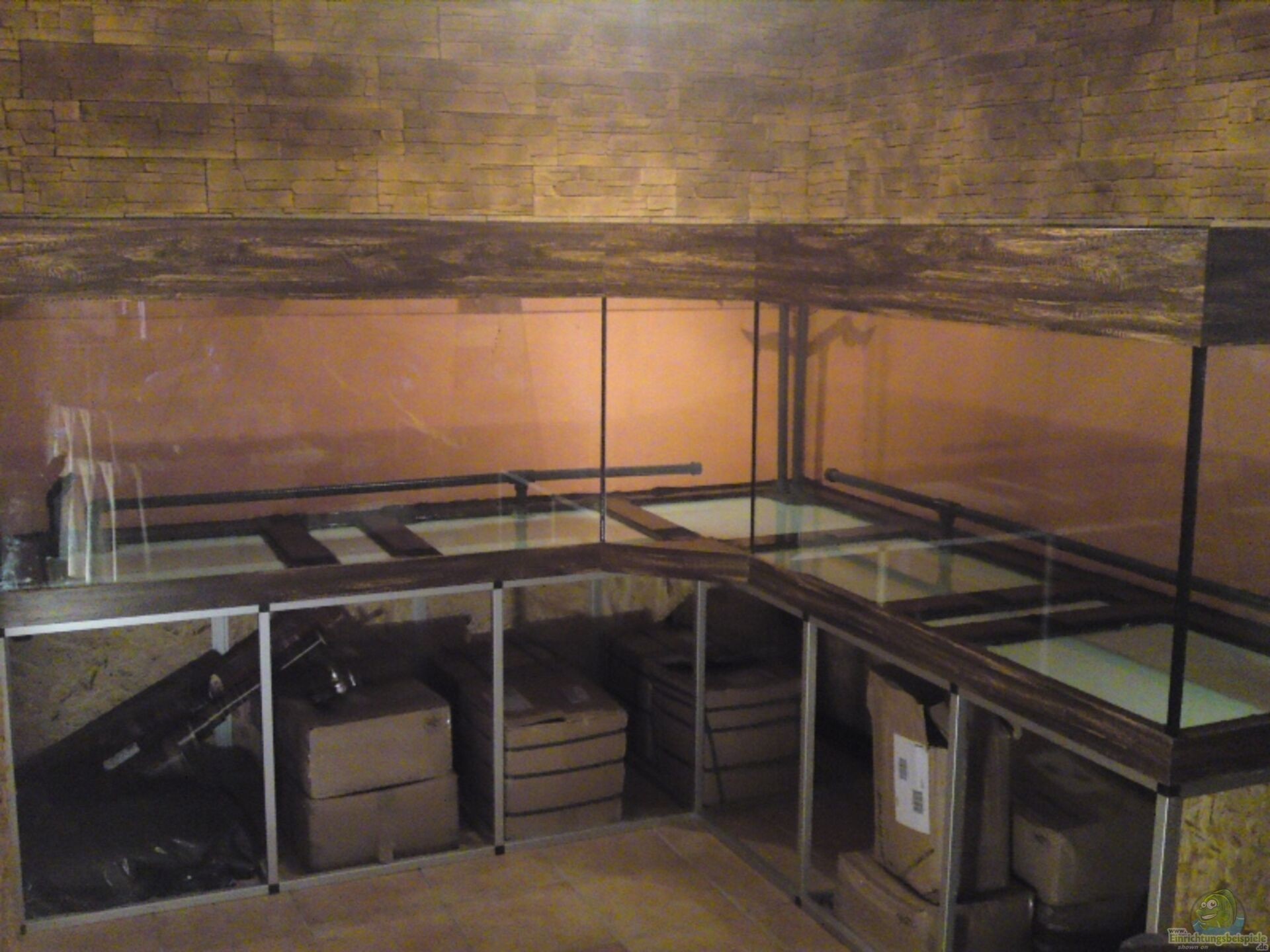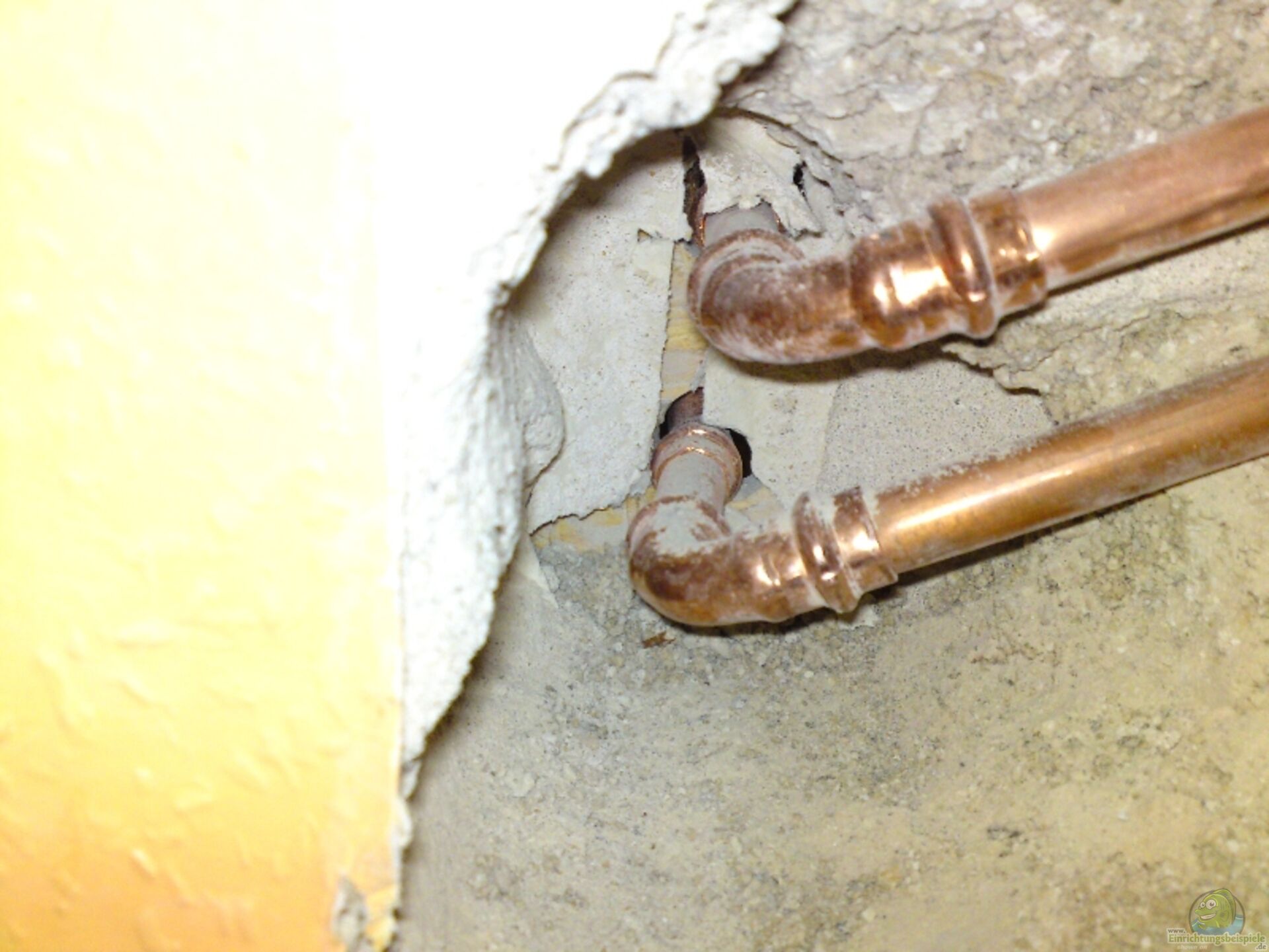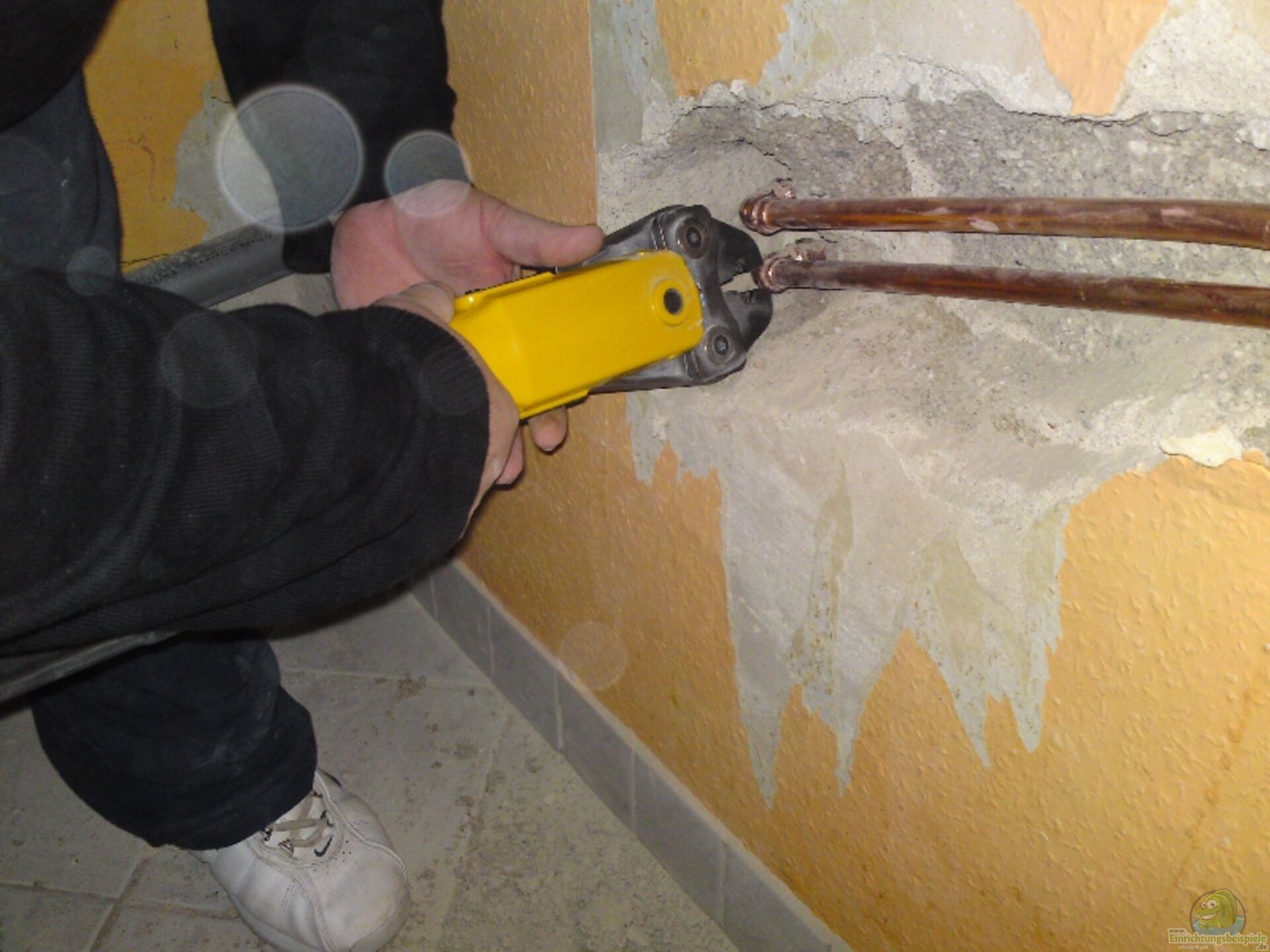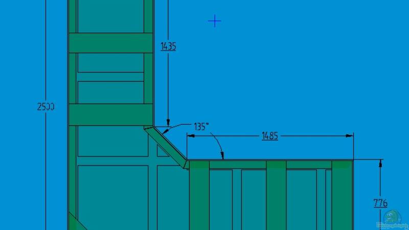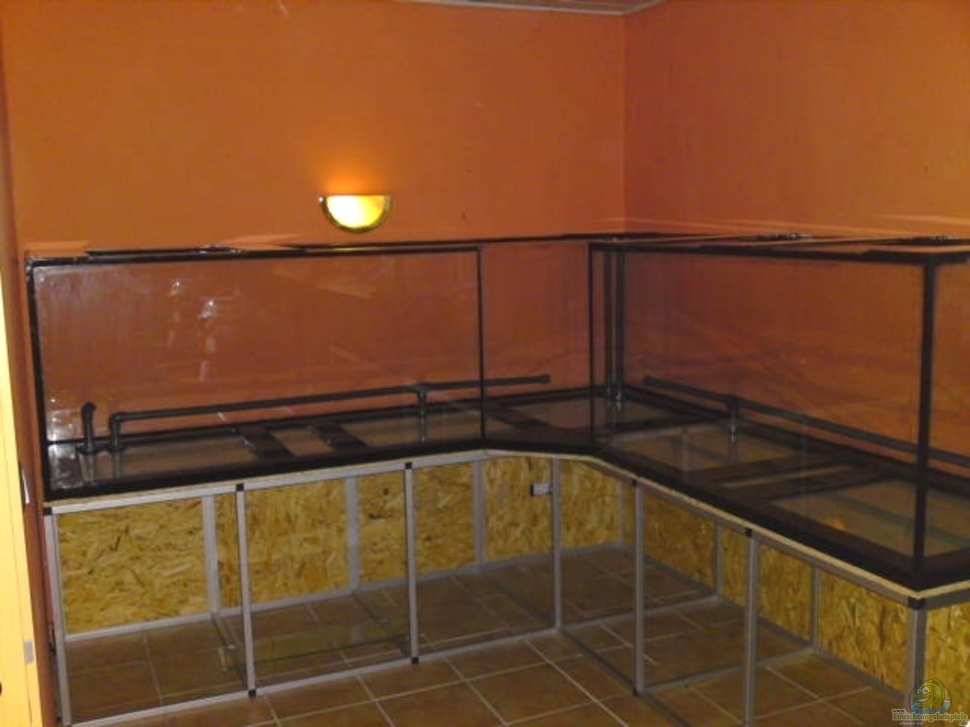 Das Einbringen der beiden hinteren Scheiben vor Ort war ein "echtes" Abenteuer, da zwischen Wand und Scheiben nur ca. 1, 5 cm Platz war, also auch kaum Platz für die Fingerchen. Damit die Scheiben beim Verkleben nicht hinter den Unterschrank fallen konnten, mussten dort zus. Hölzer hinter den Selbigen gestellt werden, die als Auflagen für die beiden langen Scheiben dienten. Die 2 Scheiben (immerhin 250 und 255cm lang, 75mm hoch, 12mm stark und auch recht schwer) wurden Unten vorher auf 24mm Breite mit Silikon eingestrichen und natürlich das Silikon für die Eckverbindung aufgetragen. Die beiden recht schweren Teile wurden dann unter Zurhilfenahme von Holzkeilen fest gegen die Bodenplatte gepresst. Die Sicherheitsnähte wurden danach gleich mit einem Spezialspachtel gezogen, diese sind jetzt ca. 14mm breit. Nach Antrocknen der hinteren Scheiben wurden dann die beiden seitlichen Scheiben eingeklebt und mit Klebeband gesichert. Dann wurde alles wieder mit Aceton gereinigt und die hinteren Längssteben wurden mit Hilfe von dicken Holzklötzen auf Höhe verklebt. In der hinteren Ecke wurde zus. noch ein Dreieck aus Glas auf die beiden Längssteege mit aufgebracht, sicher ist sicher. Danach wurden dann die beiden vorderen Scheiben verklebt. Die Schräge in der Mitte wurde noch weggelassen, damit man "halbwegs" vernünftig im Becken arbeiten konnte. Auch dort wurden erst die beiden Längsstreben eingeklebt, gefolgt von den 6 Querstreben. Die Schräge wurde erst ganz zum Schluss wulstverklebt und zus. mit einer Längsstrebe abgefangen. Ihr merkt es schon, es wurde Alles auf Sicherheit verklebt. Es mag ja jetzt Leute geben, die sagen: "Wie nur 12er Glas bei der Beckenhöhe ???", aber 12mm-Floatglas reicht noch aus für ein Beckenhöhe bis zu 75cm (nach Flachglasmarkenkreistabelle). Ganz wichtig beim Verkleben von Aquarienscheiben ist das vorherige Reinigen und Entfetten, am Besten mit Aceton, aber Achtung Aceton reizt sark die Haut und die Atemwege). Achso, Eins hätte ich fast vergessen: Die 32er PVC-Hochdruckrohre sind vor dem Verkleben der Schräge auch noch ins Becken eingebracht worden, da dies hinterher auch recht schwierig gewesen wäre. Die langen Ansaugrohre wurden alle mit der Flex von Hand geschlitzt. Die Düsen für den Wasseraustritt und die 40er Kugelhähne (Kugelhähne und Ventile immer eine Nummer grösser wählen, als der Rohrdurchmesser, damit der Wasserduchfluss nicht verengt wird !!!) stammen wieder von der Fa. MarineSystems. Auch die Rohre müssen übrigens vor dem Verkleben mit PVC-Kleber mit Aceton angelöst und gereinigt werden.