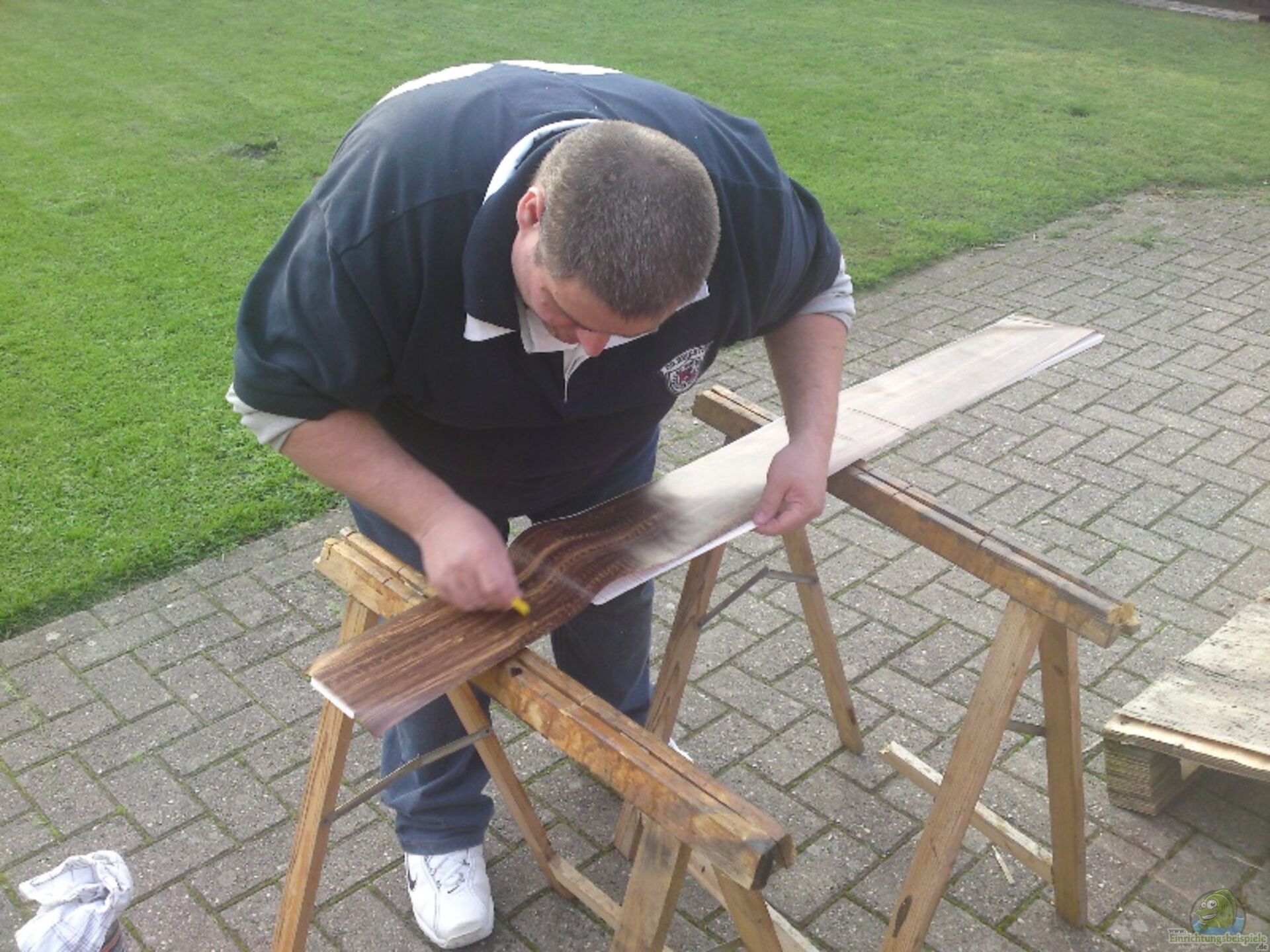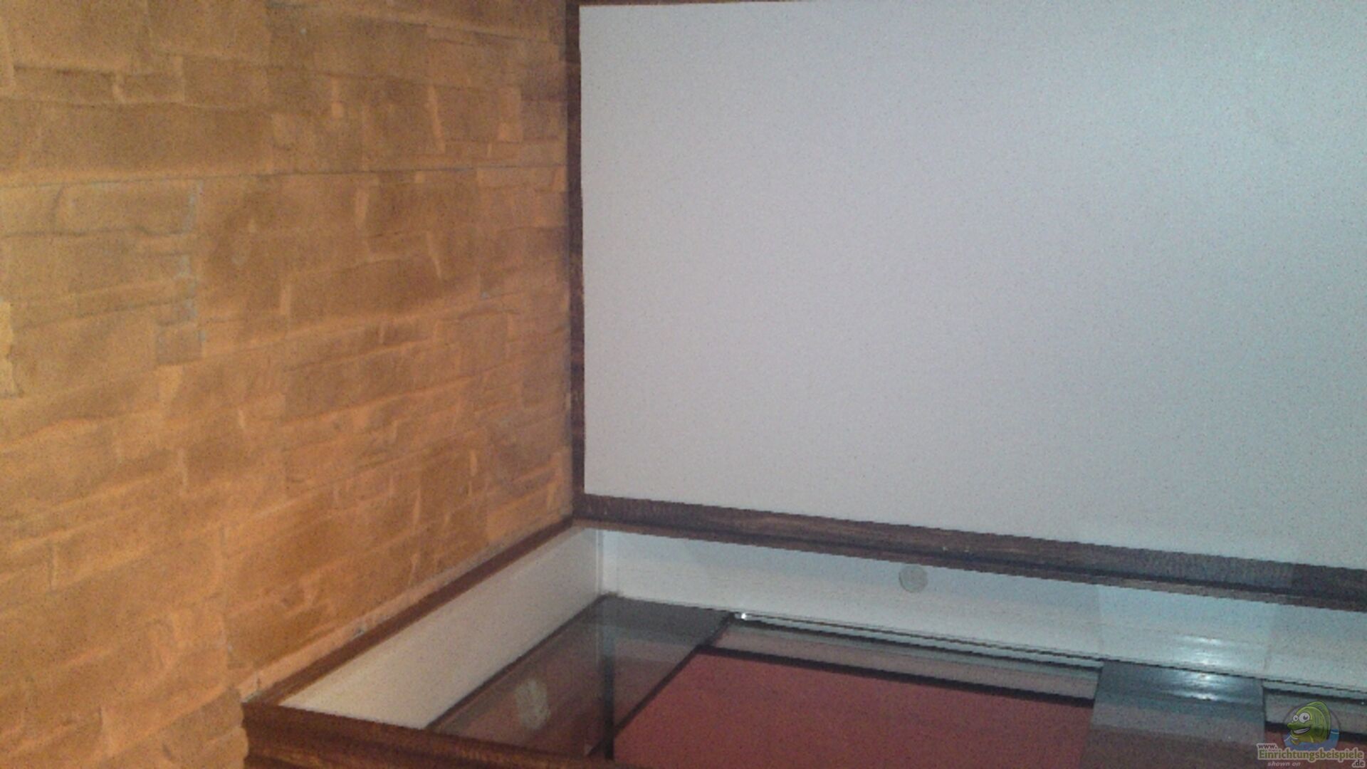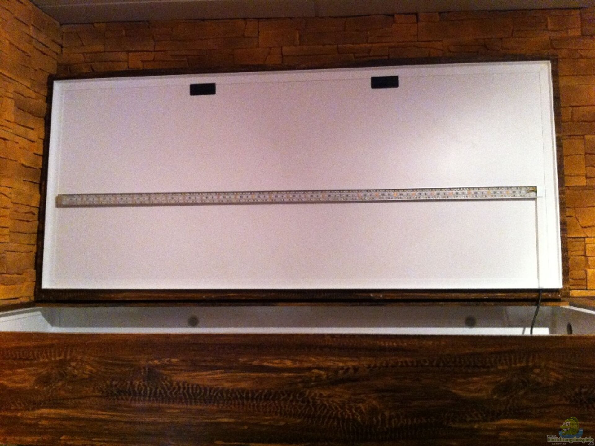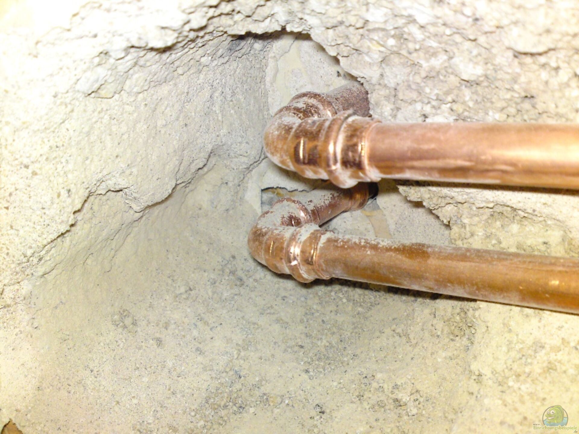 Das Einbringen der beiden hinteren Scheiben vor Ort war ein "echtes" Abenteuer, da zwischen Wand und Scheiben nur ca. 1, 5 cm Platz war, also auch kaum Platz für die Fingerchen. Damit die Scheiben beim Verkleben nicht hinter den Unterschrank fallen konnten, mussten dort zus. Hölzer hinter den Selbigen gestellt werden, die als Auflagen für die beiden langen Scheiben dienten. Die 2 Scheiben (immerhin 250 und 255cm lang, 75mm hoch, 12mm stark und auch recht schwer) wurden Unten vorher auf 24mm Breite mit Silikon eingestrichen und natürlich das Silikon für die Eckverbindung aufgetragen. Die beiden recht schweren Teile wurden dann unter Zurhilfenahme von Holzkeilen fest gegen die Bodenplatte gepresst. Die Sicherheitsnähte wurden danach gleich mit einem Spezialspachtel gezogen, diese sind jetzt ca. 14mm breit. Nach Antrocknen der hinteren Scheiben wurden dann die beiden seitlichen Scheiben eingeklebt und mit Klebeband gesichert. Dann wurde alles wieder mit Aceton gereinigt und die hinteren Längssteben wurden mit Hilfe von dicken Holzklötzen auf Höhe verklebt. In der hinteren Ecke wurde zus. noch ein Dreieck aus Glas auf die beiden Längssteege mit aufgebracht, sicher ist sicher. Danach wurden dann die beiden vorderen Scheiben verklebt. Die Schräge in der Mitte wurde noch weggelassen, damit man "halbwegs" vernünftig im Becken arbeiten konnte. Auch dort wurden erst die beiden Längsstreben eingeklebt, gefolgt von den 6 Querstreben. Die Schräge wurde erst ganz zum Schluss wulstverklebt und zus. mit einer Längsstrebe abgefangen. Ihr merkt es schon, es wurde Alles auf Sicherheit verklebt. Es mag ja jetzt Leute geben, die sagen: "Wie nur 12er Glas bei der Beckenhöhe ???", aber 12mm-Floatglas reicht noch aus für ein Beckenhöhe bis zu 75cm (nach Flachglasmarkenkreistabelle). Ganz wichtig beim Verkleben von Aquarienscheiben ist das vorherige Reinigen und Entfetten, am Besten mit Aceton, aber Achtung Aceton reizt sark die Haut und die Atemwege). Achso, Eins hätte ich fast vergessen: Die 32er PVC-Hochdruckrohre sind vor dem Verkleben der Schräge auch noch ins Becken eingebracht worden, da dies hinterher auch recht schwierig gewesen wäre. Die langen Ansaugrohre wurden alle mit der Flex von Hand geschlitzt. Die Düsen für den Wasseraustritt und die 40er Kugelhähne (Kugelhähne und Ventile immer eine Nummer grösser wählen, als der Rohrdurchmesser, damit der Wasserduchfluss nicht verengt wird !!!) stammen wieder von der Fa. MarineSystems. Auch die Rohre müssen übrigens vor dem Verkleben mit PVC-Kleber mit Aceton angelöst und gereinigt werden.