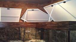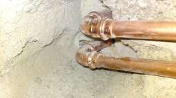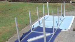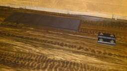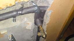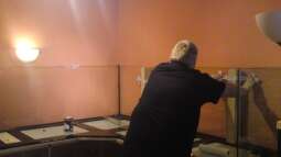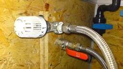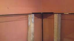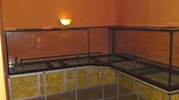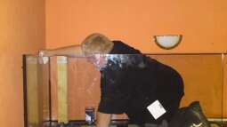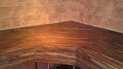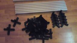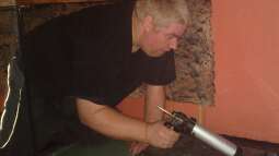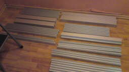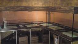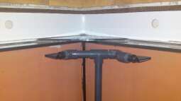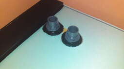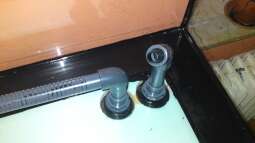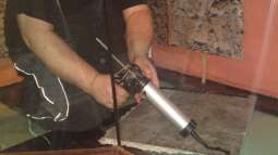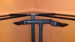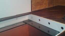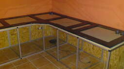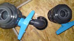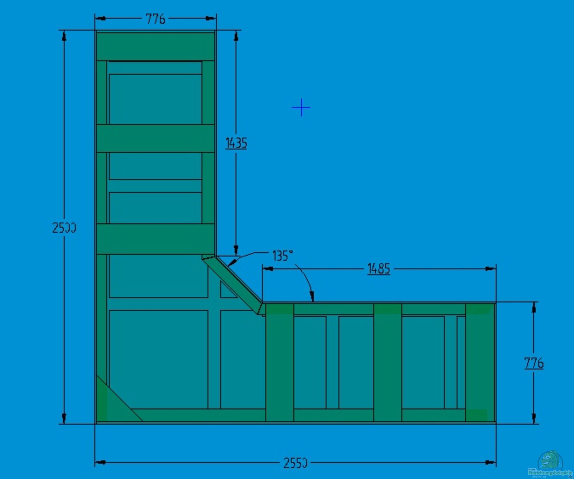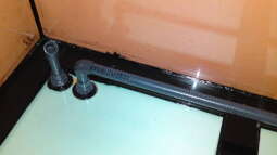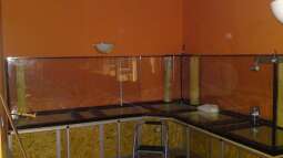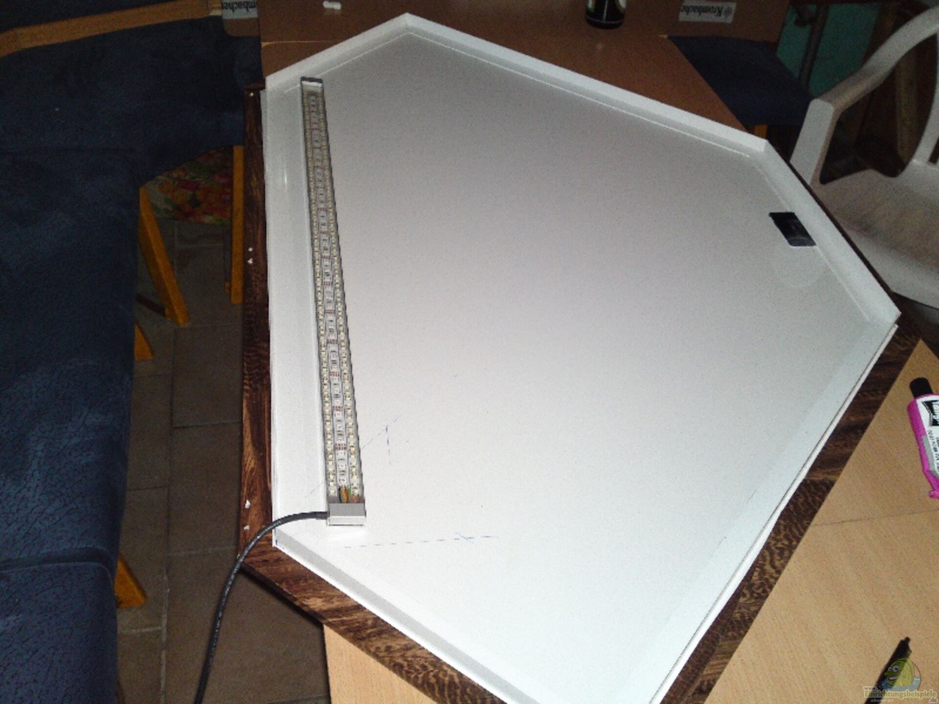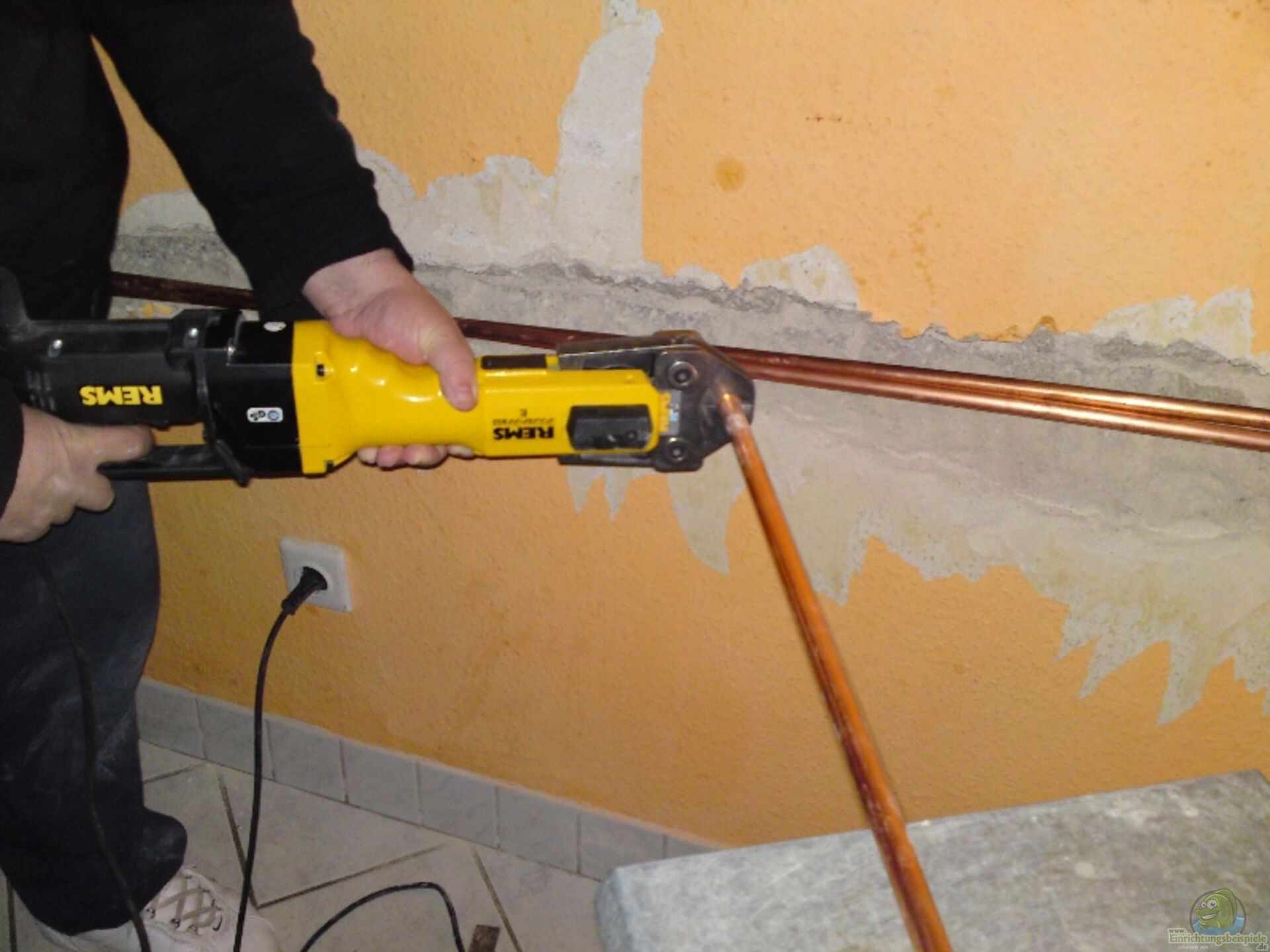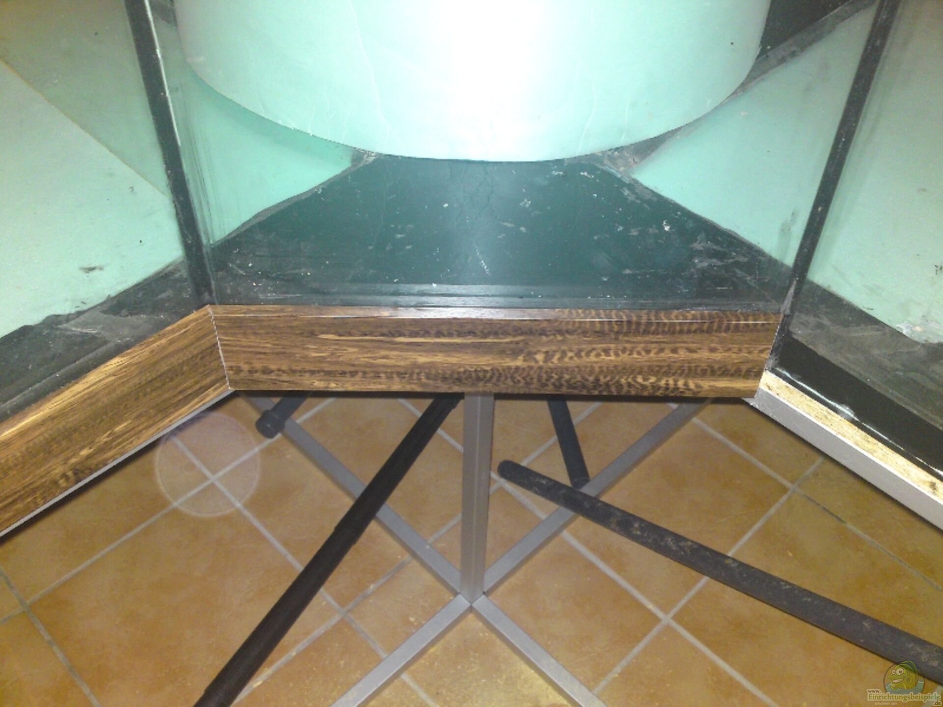 Das Einbringen der beiden hinteren Scheiben vor Ort war ein "echtes" Abenteuer, da zwischen Wand und Scheiben nur ca. 1, 5 cm Platz war, also auch kaum Platz für die Fingerchen. Damit die Scheiben beim Verkleben nicht hinter den Unterschrank fallen konnten, mussten dort zus. Hölzer hinter den Selbigen gestellt werden, die als Auflagen für die beiden langen Scheiben dienten. Die 2 Scheiben (immerhin 250 und 255cm lang, 75mm hoch, 12mm stark und auch recht schwer) wurden Unten vorher auf 24mm Breite mit Silikon eingestrichen und natürlich das Silikon für die Eckverbindung aufgetragen. Die beiden recht schweren Teile wurden dann unter Zurhilfenahme von Holzkeilen fest gegen die Bodenplatte gepresst. Die Sicherheitsnähte wurden danach gleich mit einem Spezialspachtel gezogen, diese sind jetzt ca. 14mm breit. Nach Antrocknen der hinteren Scheiben wurden dann die beiden seitlichen Scheiben eingeklebt und mit Klebeband gesichert. Dann wurde alles wieder mit Aceton gereinigt und die hinteren Längssteben wurden mit Hilfe von dicken Holzklötzen auf Höhe verklebt. In der hinteren Ecke wurde zus. noch ein Dreieck aus Glas auf die beiden Längssteege mit aufgebracht, sicher ist sicher. Danach wurden dann die beiden vorderen Scheiben verklebt. Die Schräge in der Mitte wurde noch weggelassen, damit man "halbwegs" vernünftig im Becken arbeiten konnte. Auch dort wurden erst die beiden Längsstreben eingeklebt, gefolgt von den 6 Querstreben. Die Schräge wurde erst ganz zum Schluss wulstverklebt und zus. mit einer Längsstrebe abgefangen. Ihr merkt es schon, es wurde Alles auf Sicherheit verklebt. Es mag ja jetzt Leute geben, die sagen: "Wie nur 12er Glas bei der Beckenhöhe ???", aber 12mm-Floatglas reicht noch aus für ein Beckenhöhe bis zu 75cm (nach Flachglasmarkenkreistabelle). Ganz wichtig beim Verkleben von Aquarienscheiben ist das vorherige Reinigen und Entfetten, am Besten mit Aceton, aber Achtung Aceton reizt sark die Haut und die Atemwege). Achso, Eins hätte ich fast vergessen: Die 32er PVC-Hochdruckrohre sind vor dem Verkleben der Schräge auch noch ins Becken eingebracht worden, da dies hinterher auch recht schwierig gewesen wäre. Die langen Ansaugrohre wurden alle mit der Flex von Hand geschlitzt. Die Düsen für den Wasseraustritt und die 40er Kugelhähne (Kugelhähne und Ventile immer eine Nummer grösser wählen, als der Rohrdurchmesser, damit der Wasserduchfluss nicht verengt wird !!!) stammen wieder von der Fa. MarineSystems. Auch die Rohre müssen übrigens vor dem Verkleben mit PVC-Kleber mit Aceton angelöst und gereinigt werden.