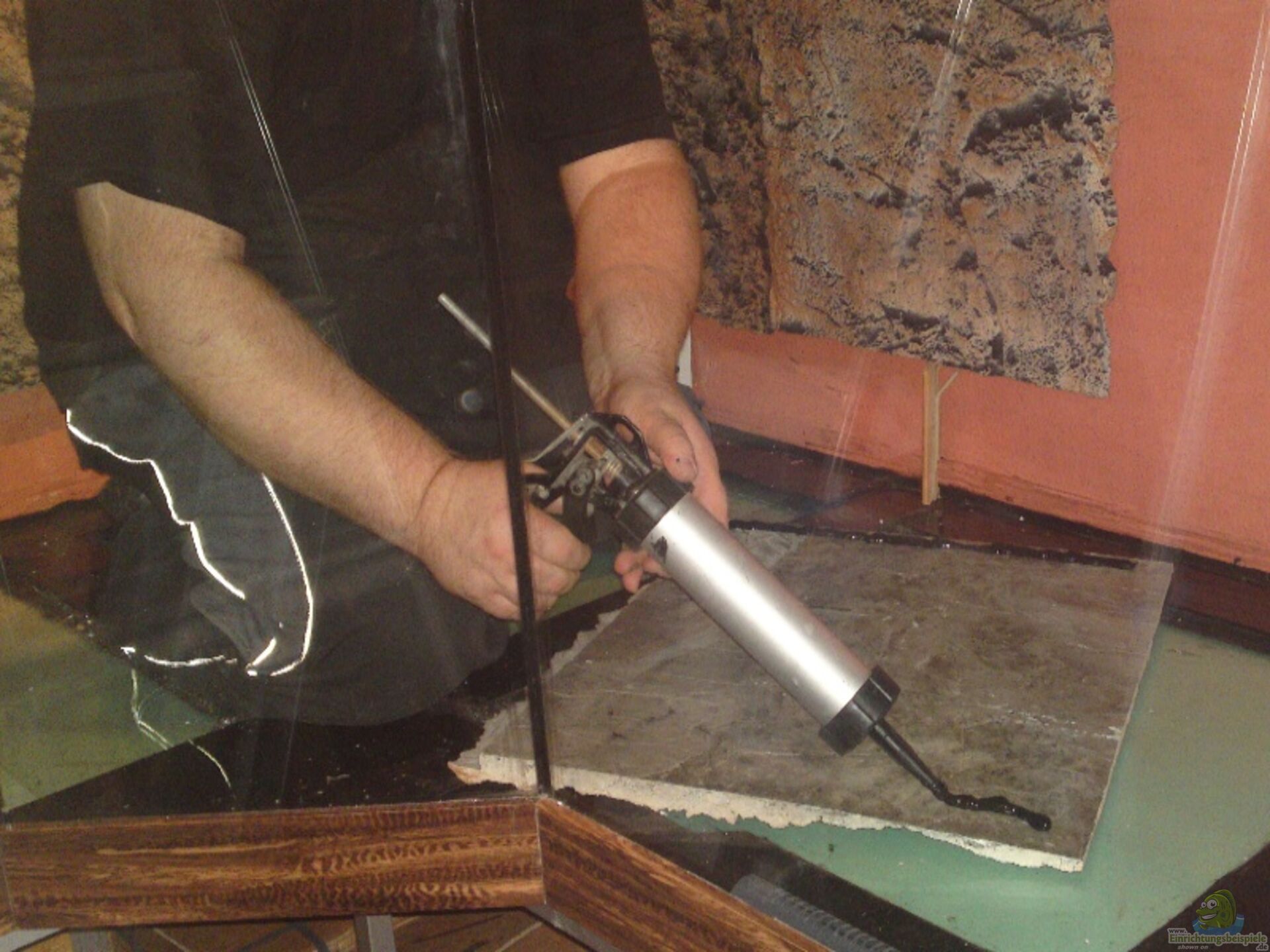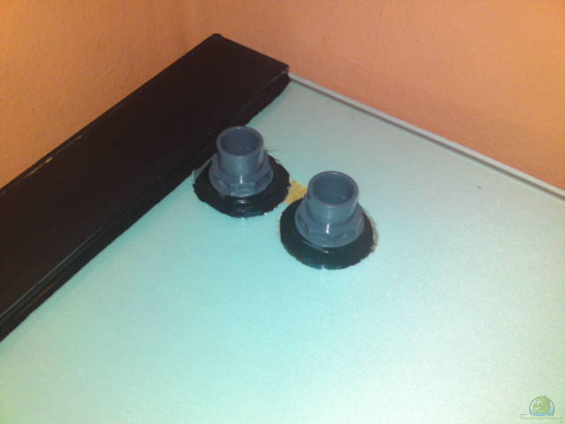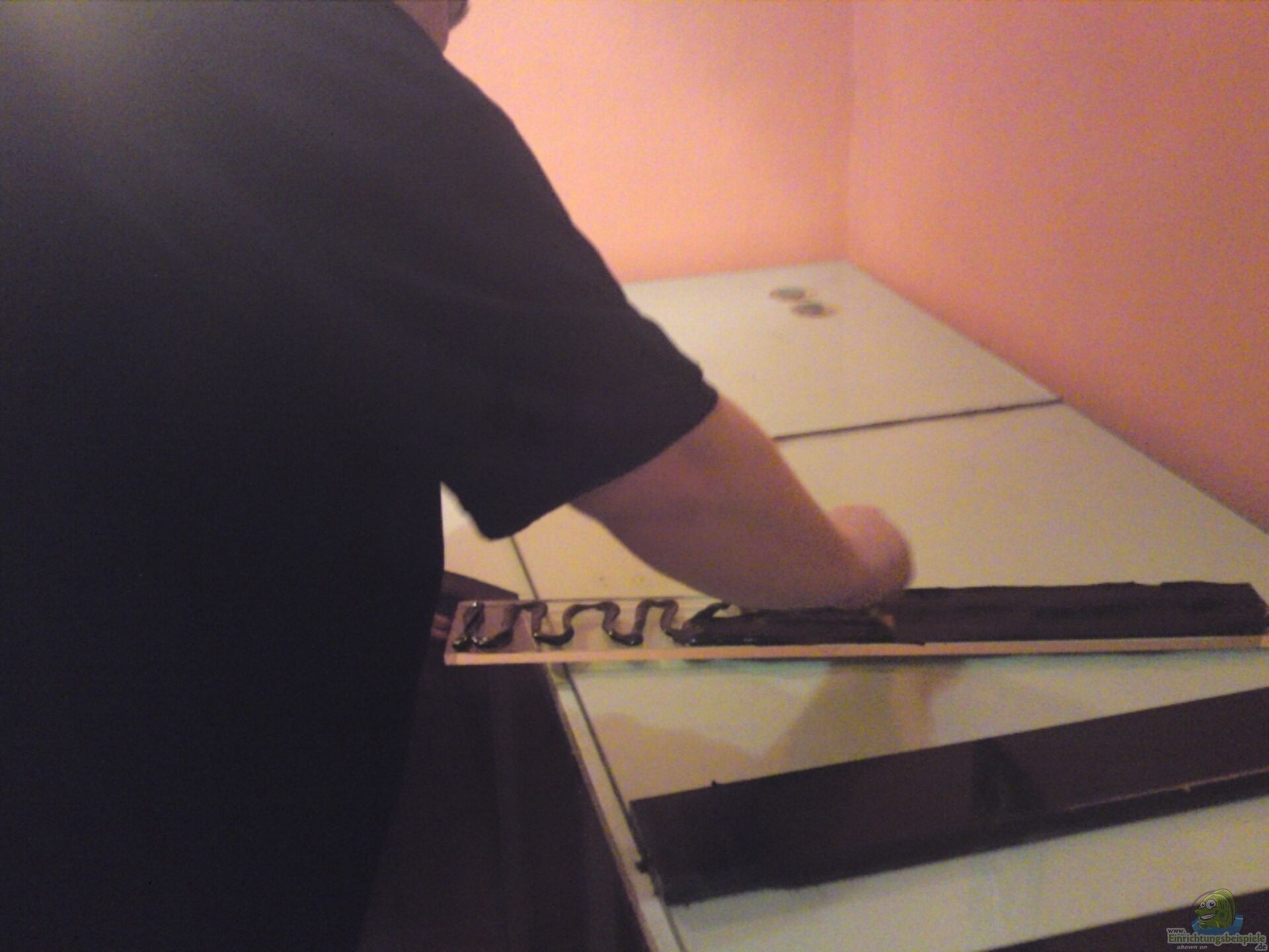 Der Boden besteht aus geteilten 12mm-Glasplatten von je 75x75cm und 2 Platten mit dem Rest. An den beiden Enden und in der Ecke befindet sich jeweils die Platte mit den beiden Bohrungen. In diese wurden die Tankverschraubungen sehr fest verschraubt und gegen Undichtigkeiten zus. mit Silikon eingesetzt und auch noch rundherum abgedichtet. Die einzelnen Glasplatten wurden dann mit Aquariensilikon verklebt, danach lässt man Sie dann erst aushärten. Das überschüssige Silikon muss sofort entfernt werden. Natürlich ist das Glas vor dem Verkleben sehr gut mit Aceton zu entfetten. Wenn die einzelnen Platten soweit miteinander verbunden sind können die Rippen über die Verbindungsstellen geklebt werden. Auch rundherum wurde der Boden mit Glasstreifen eingefasst, sodass er praktisch an diesen Stellen 24mm dick ist und beim Verkleben der Seitenscheiben natürlich auch auf dieser Breite Kontakt hat. Auch der ganze Boden wurde mit einer Sicherheitsnaht versehen. Ein geteilter Unterboden hat den Vorteil, dass im Falle eines Schadens nicht gleich der ganze Boden zu Bruch geht und nur dieses Stück ausgetauscht, bzw. überklebt werden muss.