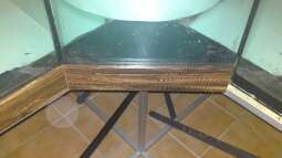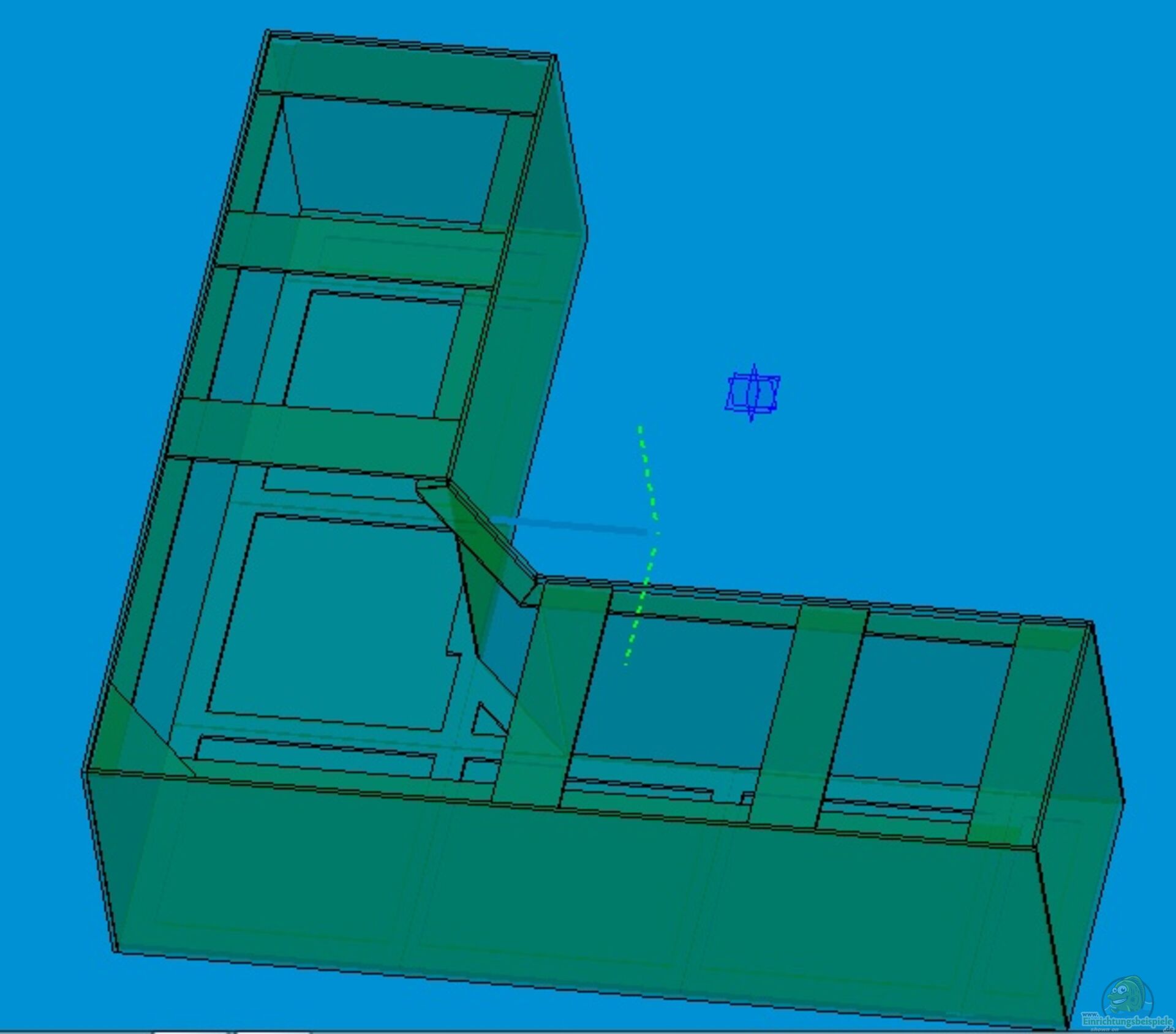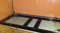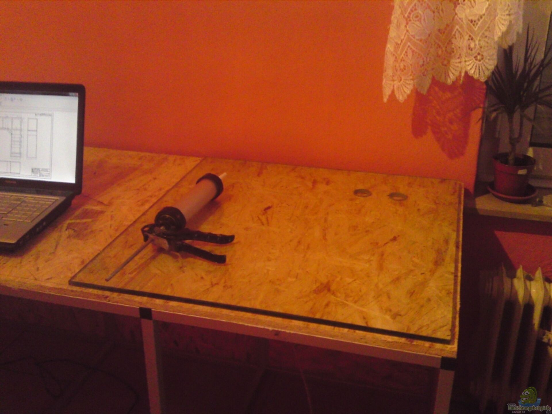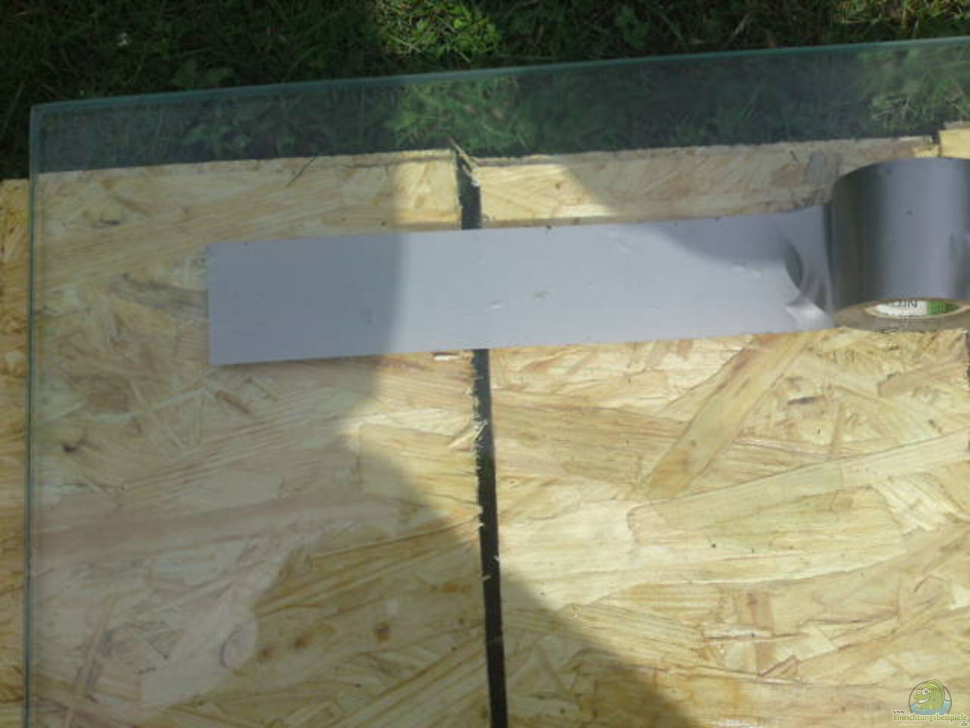 Der Boden besteht aus geteilten 12mm-Glasplatten von je 75x75cm und 2 Platten mit dem Rest. An den beiden Enden und in der Ecke befindet sich jeweils die Platte mit den beiden Bohrungen. In diese wurden die Tankverschraubungen sehr fest verschraubt und gegen Undichtigkeiten zus. mit Silikon eingesetzt und auch noch rundherum abgedichtet. Die einzelnen Glasplatten wurden dann mit Aquariensilikon verklebt, danach lässt man Sie dann erst aushärten. Das überschüssige Silikon muss sofort entfernt werden. Natürlich ist das Glas vor dem Verkleben sehr gut mit Aceton zu entfetten. Wenn die einzelnen Platten soweit miteinander verbunden sind können die Rippen über die Verbindungsstellen geklebt werden. Auch rundherum wurde der Boden mit Glasstreifen eingefasst, sodass er praktisch an diesen Stellen 24mm dick ist und beim Verkleben der Seitenscheiben natürlich auch auf dieser Breite Kontakt hat. Auch der ganze Boden wurde mit einer Sicherheitsnaht versehen. Ein geteilter Unterboden hat den Vorteil, dass im Falle eines Schadens nicht gleich der ganze Boden zu Bruch geht und nur dieses Stück ausgetauscht, bzw. überklebt werden muss.