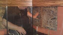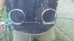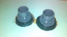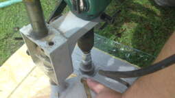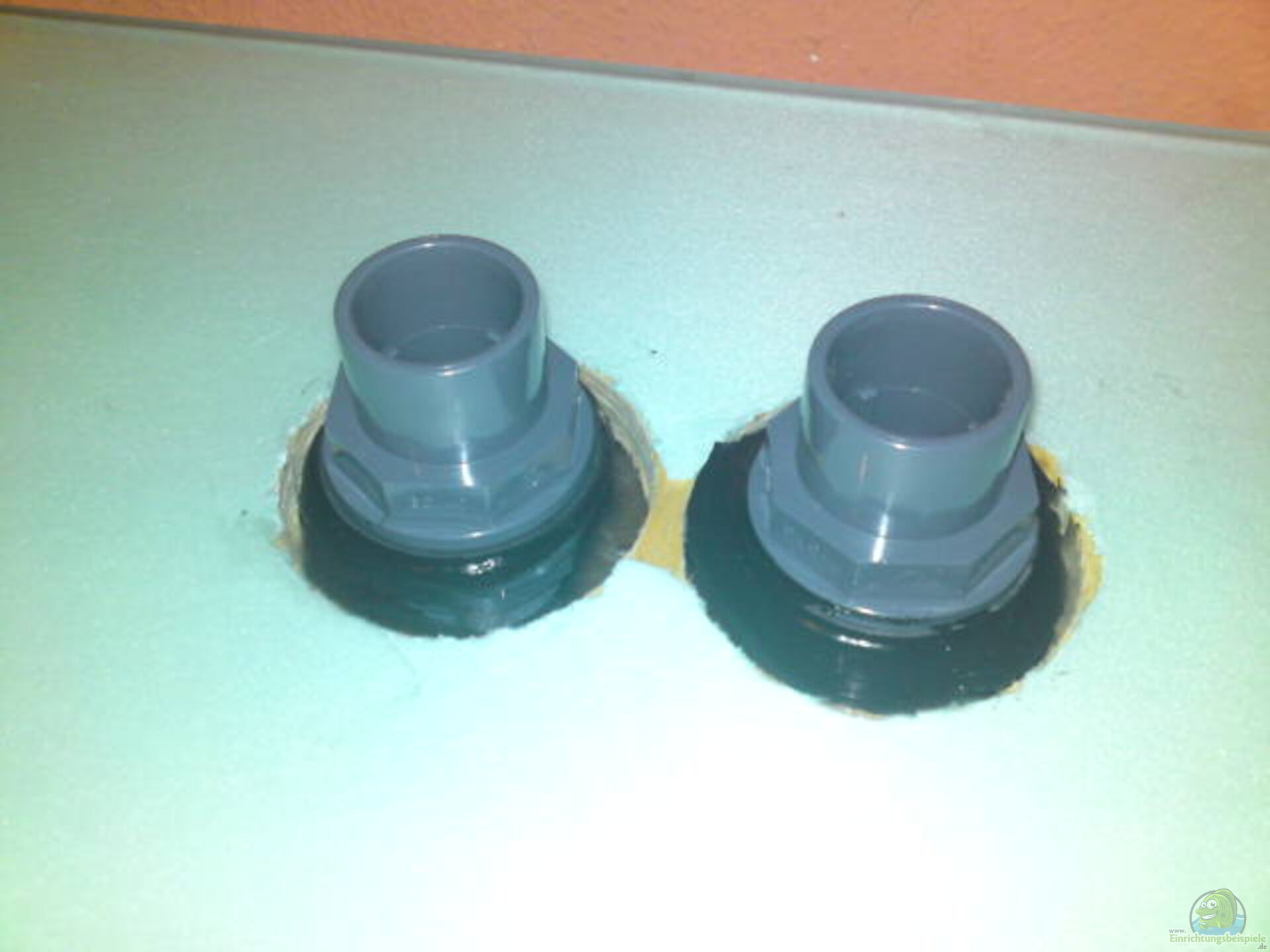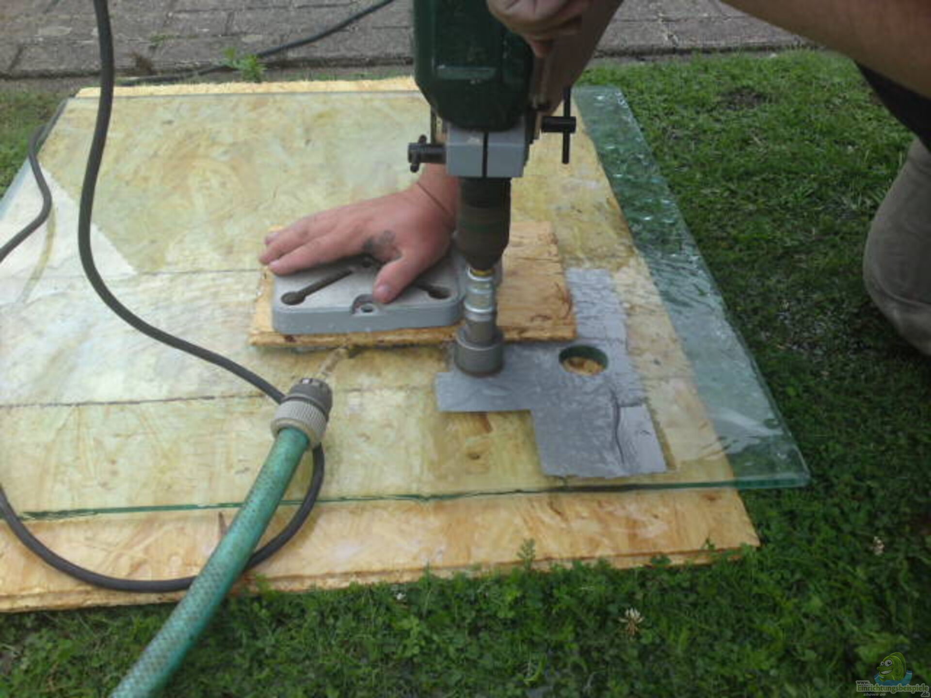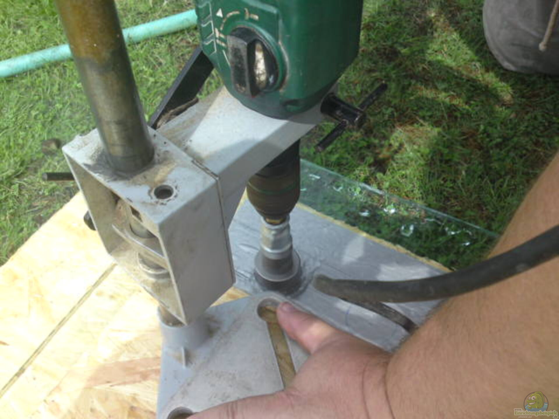 Alle Bohrungen für die Tankstutzen des Aquariums wurden durch meinen Bruder Oliver und durch mich selbst ausgeführt. Es wurden insgesammt 6 Bohrungen von 43 mm gebohrt, die der Aufnahme der 32mm Tankverschraubungen dienen. Der Glas-Bohrer stammt von der Fa. Bohle und wurde bei der Fa. MarineSystems gekauft. Da das Becken einen geteilten Unterboden besitzt, wurden 3 mal 12mm-Glasplatten von 75x75cm mit jeweils 2 Bohrungen versehen. Als Bohrmaschine diente mein alter Bosch-Bohrhammer. Die Schlagbohrfunktion muss natürlich zum Bohren deaktiviert werden, da es sonst unweigerlich Glasbruch gibt. Die Bohrmaschine wurde in einen alten Bohrständer eingespannt, damit die Löcher absolut gerade ins Glas gebohrt werden. Damit die Bohrungen nicht weglaufen, wurden die Stellen mit Klebeband versehen und dann angezeichnet. Zur Kühlung wurde einfach ein Gartenschlauch mit fliessendem Wasser der neben die Bohrung / auf das Glas gelegt wird. Beim Bohren aber bitte nur wenig Druck ausüben, da es sonst auch wieder unweigerlich zu Glasbruch führt. Ihr merkt schon, Glas ist eine sehr sensibele Sache. Damit auf der Unterseite die Bohrung nicht ausfranst / wegbricht wurden die Platten kurz vor dem Durchstich gedreht und dann von dort zuende gebohrt.