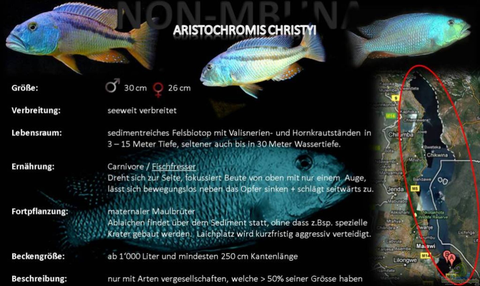 Aristochromis christyi kann in Becken ab 1???000 Litern (besser wäre mehr) gehalten werden, sofern eine Mindestkantenlänge von 250 cm sichergestellt wird. Ich empfehle, aufgrund des eher einzelgängerischen Charakters, diese Art nur in Harems (1m/2w) zu pflegen. Gruppenhaltung sollte bei dieser Art kein Thema sein.
