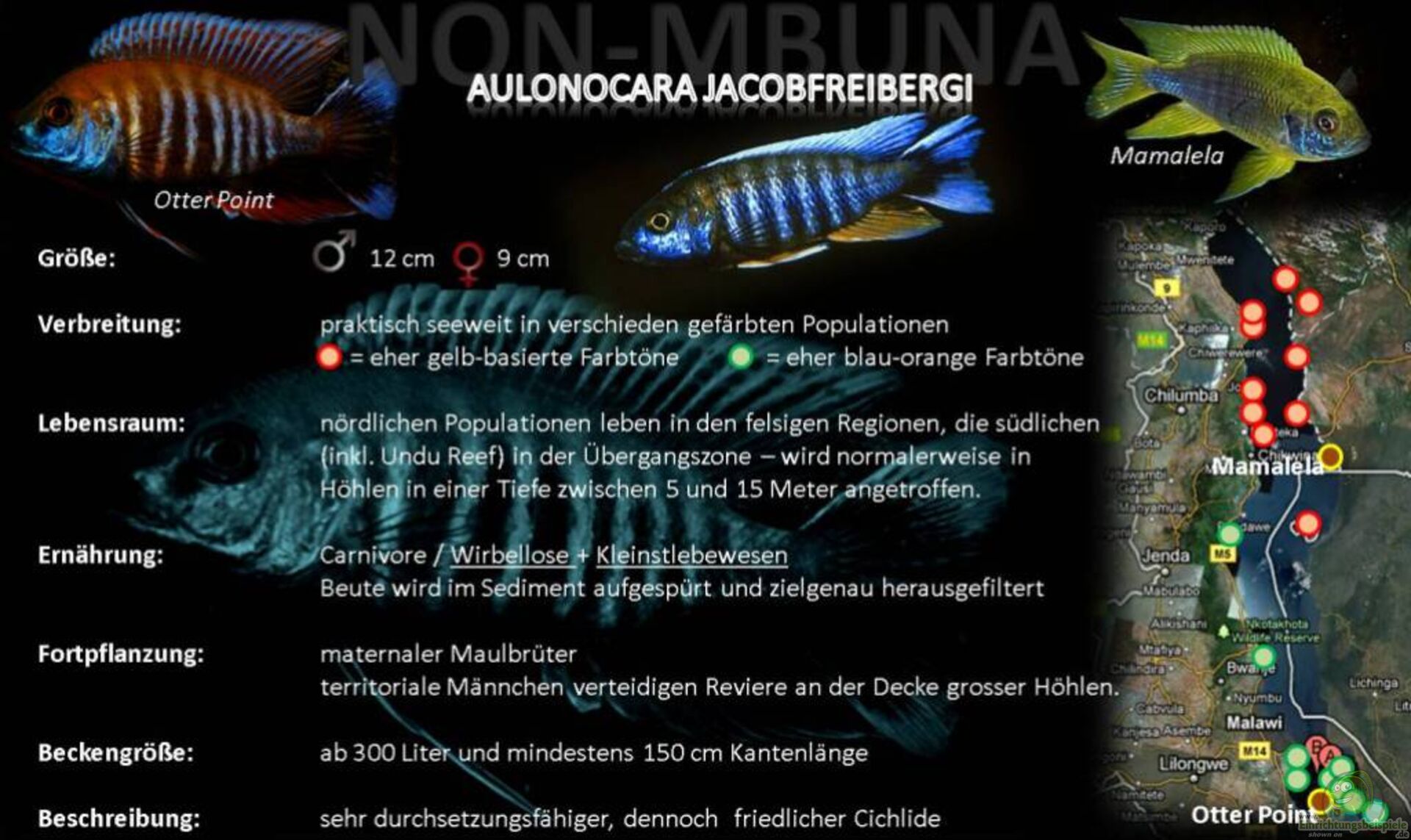 Bei den mit (x) gekennzeichneten Standortvarianten handelt es sich um die in der Aquaristik bekanntesten und beliebtesten Farbschläge von Aulonocara jacobfreibergi.