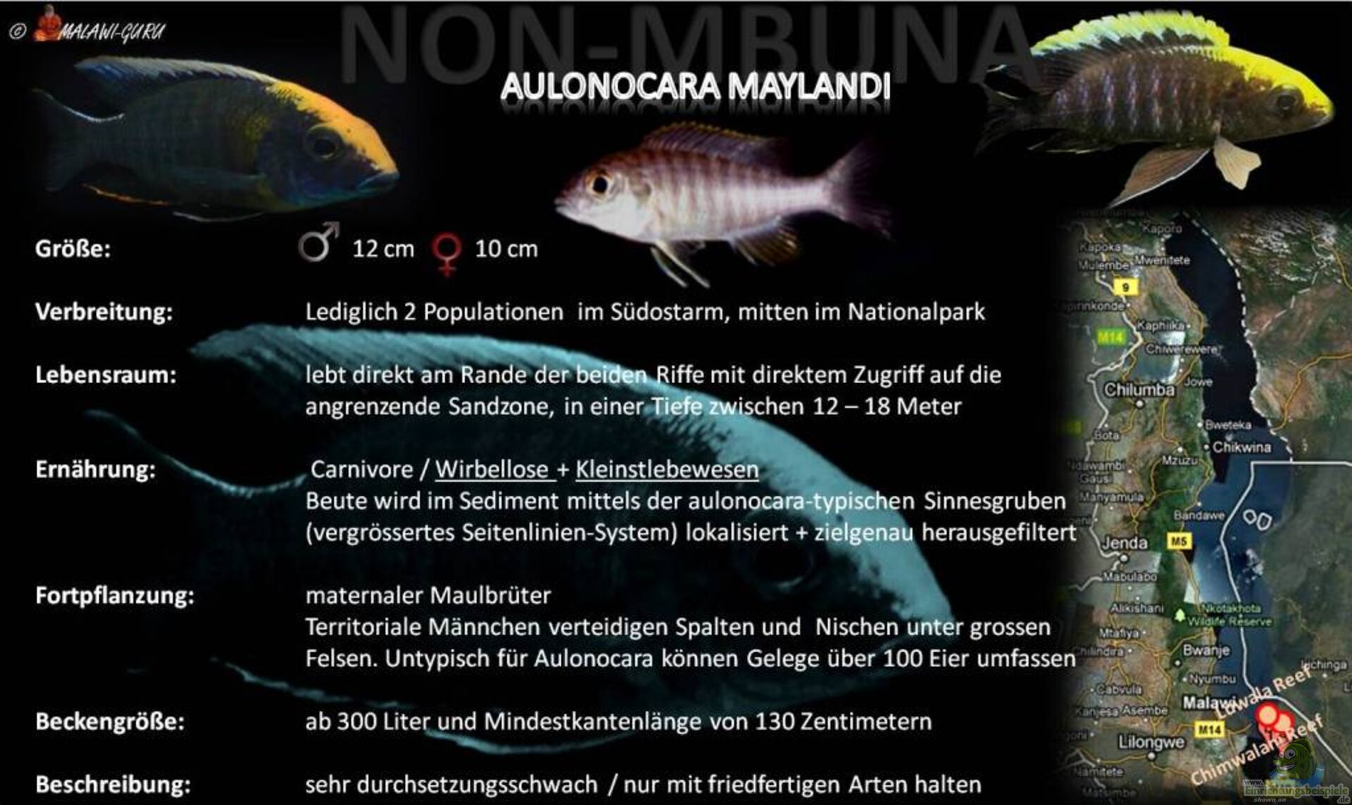 Aulonocara maylandi lebt ausschliesslich am Rande zweier Riffe im Südostarm des Malawisees ??? mitten im Unterwasser-Nationalpark: