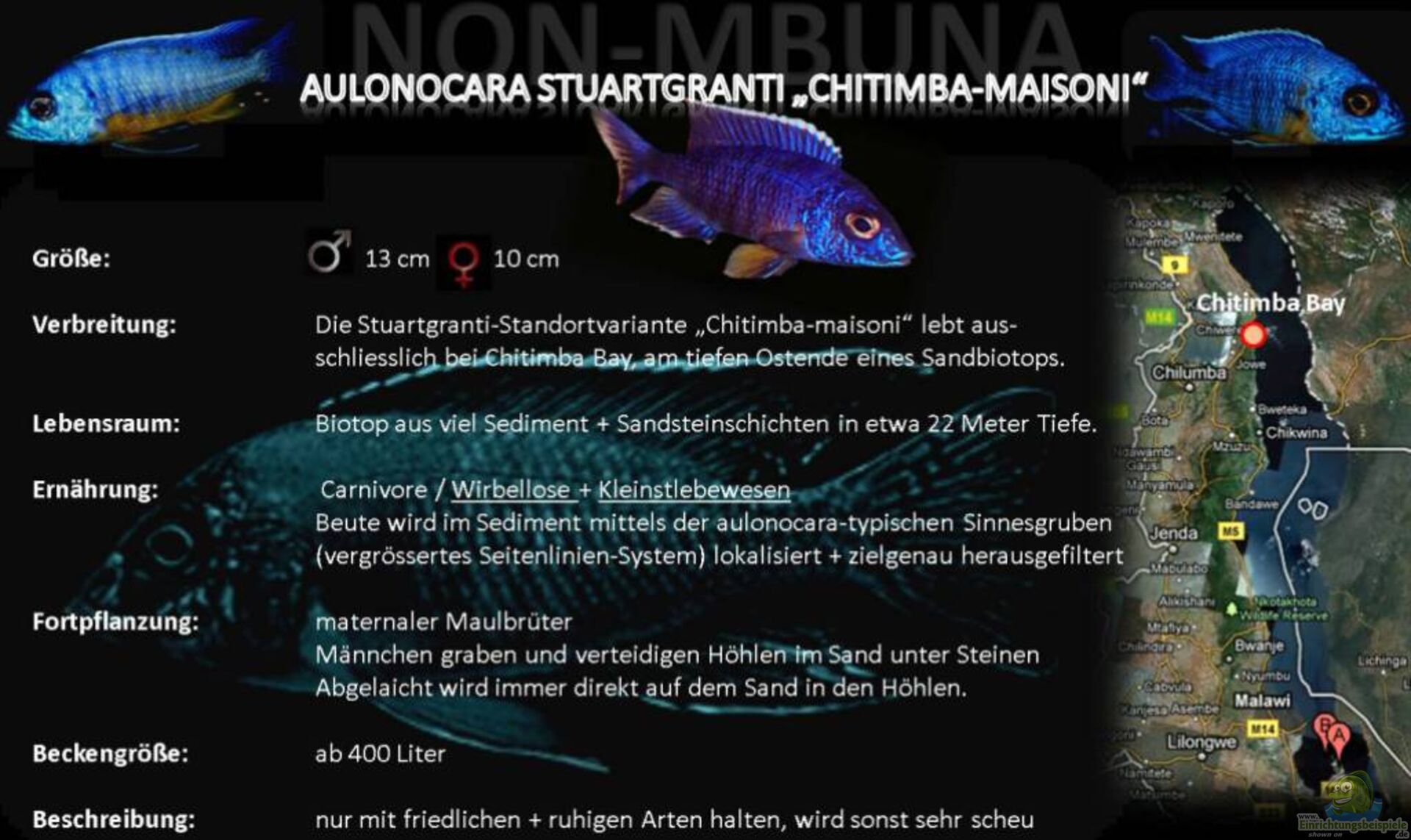 Bei Chitimba Bay leben zwei verschiedene Stuartgranti-Populationen. Eine davon , ???Chitimba-Maulana??? (siehe auch Artentafel Aulonocara stuartgranti ???chitimba-maulana???) lebt am westlichen seichten Ende der Sandbank in rund 5 Meter Tiefe, während die andere, die hier vorgestellte Maisoni-Population, am Ostende der Sandbank in rund 22 Meter tiefem Wasser zu finden ist.