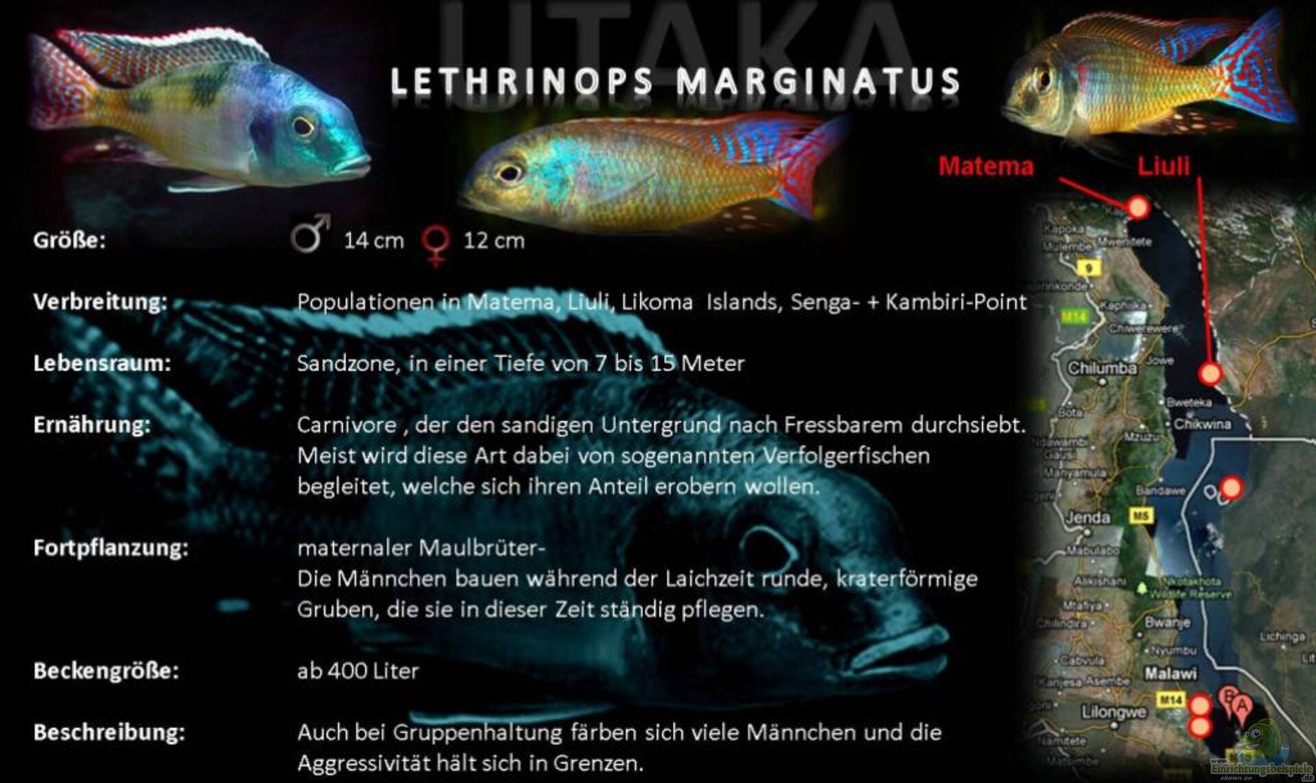 Vergesellschaftet werden sollte grundsätzlich nur mit friedfertigen Cichliden, da unser Lethrinops marginatus sehr durchsetzungsschwach ist. Optimalerweise sollte unserem Gräberfisch eine Art aus der Gruppe der Verfolgerfische zugesetzt werden.