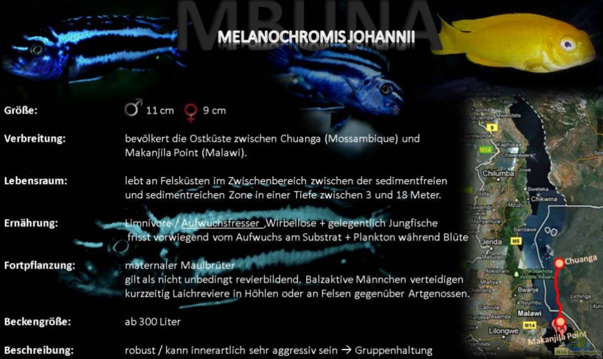 Vergesellschaftet sollte grundsätzlich nur robusten Mbunas, welche sich ebenso limnivore ernähren wie der Johannii (+ Wirbellose aus dem Aufwuchs).