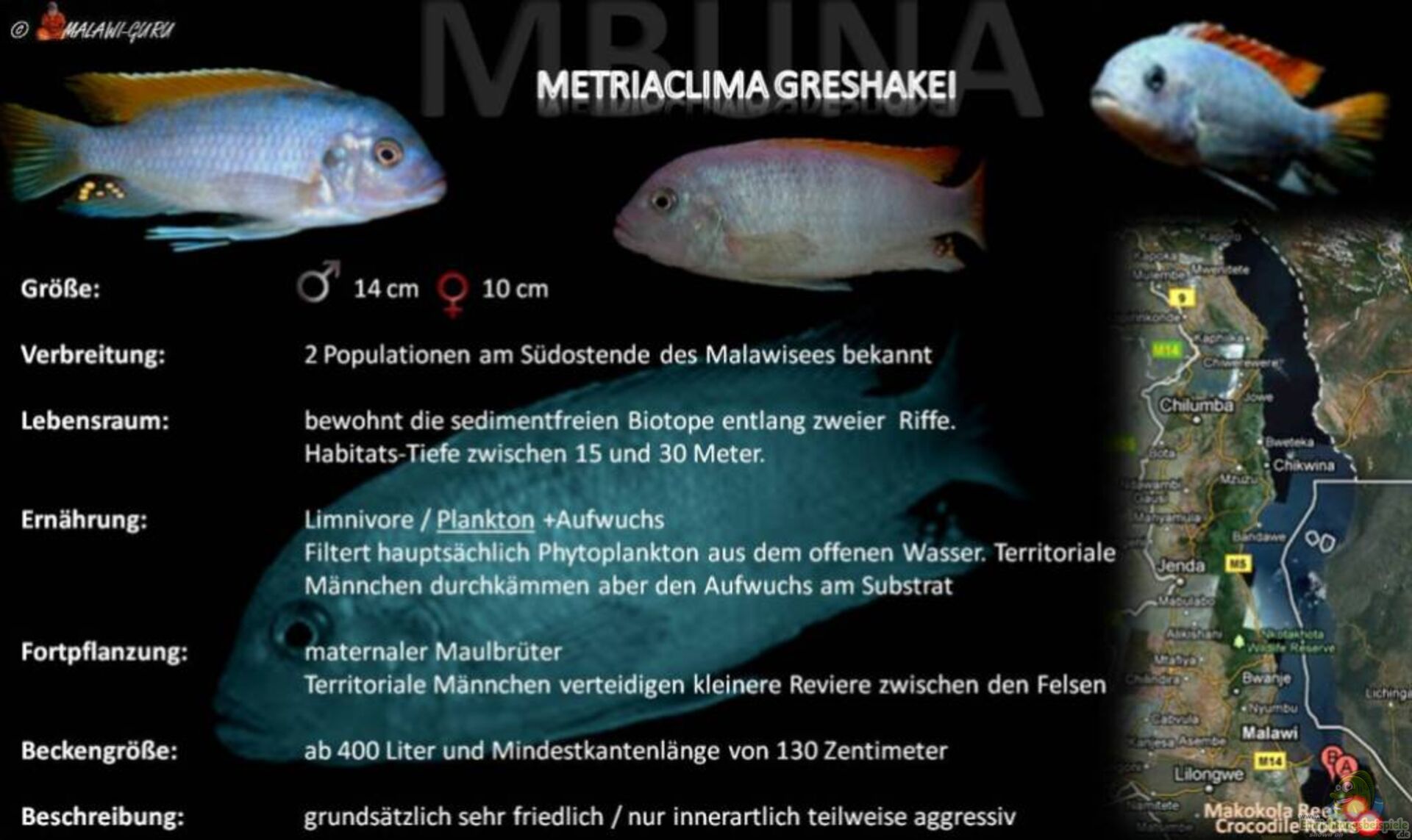 Wichtig: Die Art wird von der IUCN (International Union for Conservation of Nature and Natural Ressources) unter Maylandia greshakei geführt und als gefährdet eingestuft.