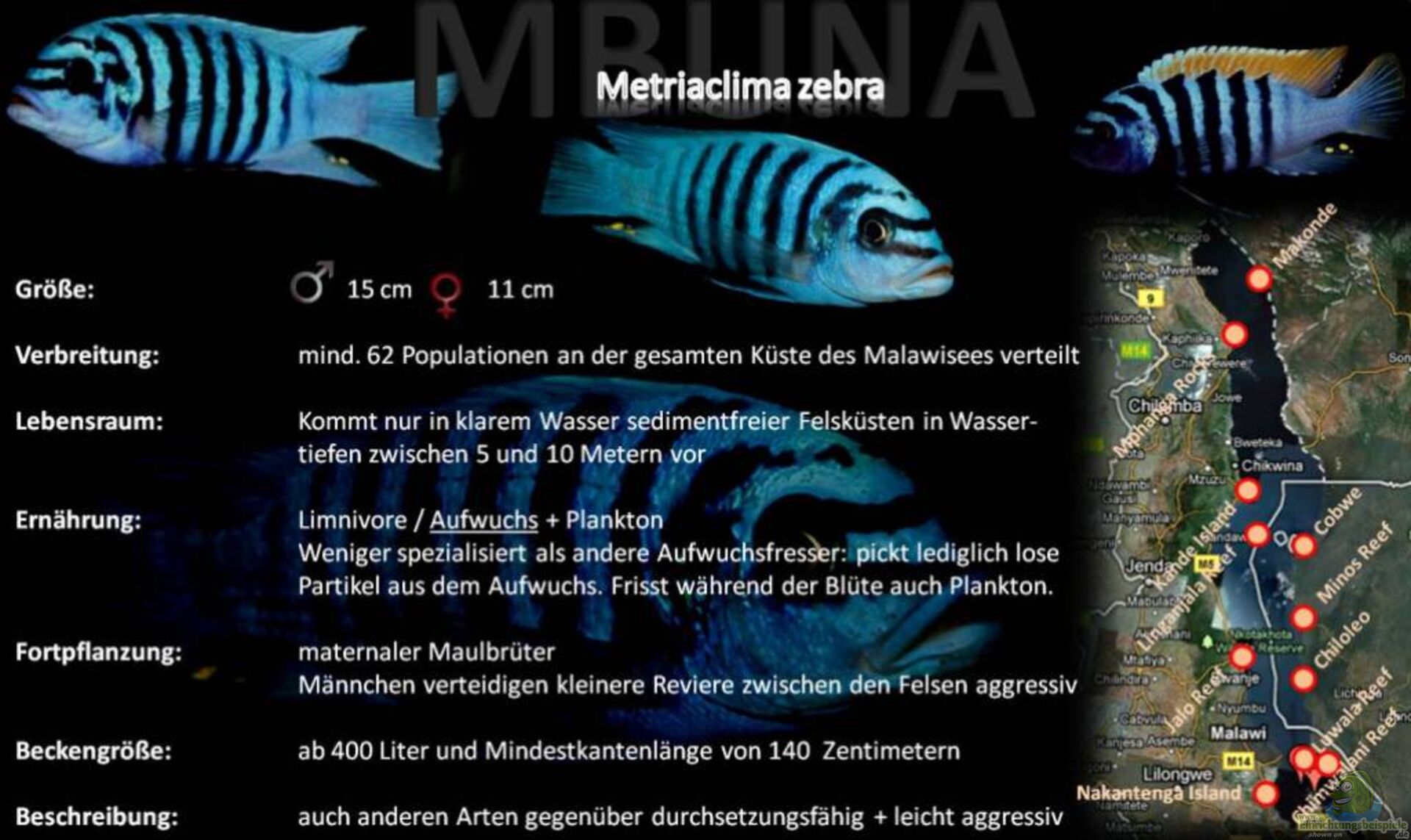 Die meisten für den Export bestimmten Metriaclima zebra stammen aus den auf der Artentafel bezeichneten Populationen.